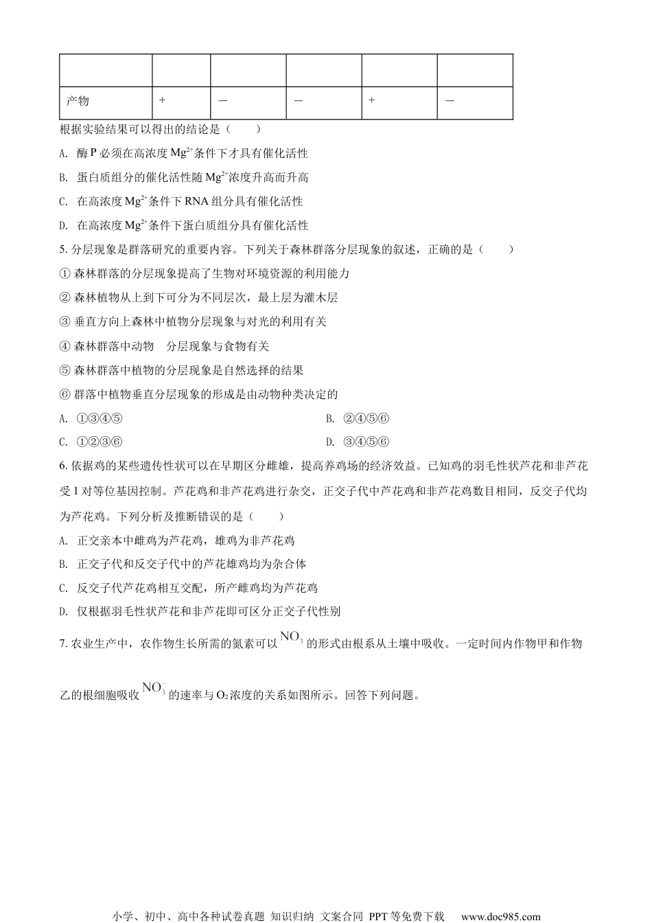小学、初中、高中各种试卷真题知识归纳文案合同PPT等免费下载www.doc985.com2022年普通高等学校招生全国统一考试(乙卷)生物部分一、单选题1.有丝分裂和减数分裂是哺乳动物细胞分裂的两种形式。某动物的基因型是Aa,若该动物的某细胞在四分体时期一条染色单体上的A和另一条染色单体上的a发生了互换,则通常情况下姐妹染色单体分离导致等位基因A和a进入不同细胞的时期是()A.有丝分裂的后期B.有丝分裂的末期C.减数第一次分裂D.减数第二次分裂2.某同学将一株生长正常的小麦置于密闭容器中,在适宜且恒定的温度和光照条件下培养,发现容器内CO2含量初期逐渐降低,之后保持相对稳定。关于这一实验现象,下列解释合理的是()A.初期光合速率逐渐升高,之后光合速率等于呼吸速率B.初期光合速率和呼吸速率均降低,之后呼吸速率保持稳定C.初期呼吸速率大于光合速率,之后呼吸速率等于光合速率D.初期光合速率大于呼吸速率,之后光合速率等于呼吸速率3.运动神经元与骨骼肌之间的兴奋传递过度会引起肌肉痉挛,严重时会危及生命。下列治疗方法中合理的是()A.通过药物加快神经递质经突触前膜释放到突触间隙中B.通过药物阻止神经递质与突触后膜上特异性受体结合C.通过药物抑制突触间隙中可降解神经递质的酶的活性D.通过药物增加突触后膜上神经递质特异性受体的数量4.某种酶P由RNA和蛋白质组成,可催化底物转化为相应的产物。为探究该酶不同组分催化反应所需的条件。某同学进行了下列5组实验(表中“+”表示有,“-”表示无)。实验组①②③④⑤底物+++++RNA组分++-+-蛋白质组分+-+-+低浓度Mg2++++--高浓度Mg2+---++小学、初中、高中各种试卷真题知识归纳文案合同PPT等免费下载www.doc985.com产物+--+-根据实验结果可以得出的结论是()A.酶P必须在高浓度Mg2+条件下才具有催化活性B.蛋白质组分的催化活性随Mg2+浓度升高而升高C.在高浓度Mg2+条件下RNA组分具有催化活性D.在高浓度Mg2+条件下蛋白质组分具有催化活性5.分层现象是群落研究的重要内容。下列关于森林群落分层现象的叙述,正确的是()①森林群落的分层现象提高了生物对环境资源的利用能力②森林植物从上到下可分为不同层次,最上层为灌木层③垂直方向上森林中植物分层现象与对光的利用有关④森林群落中动物的分层现象与食物有关⑤森林群落中植物的分层现象是自然选择的结果⑥群落中植物垂直分层现象的形成是由动物种类决定的A.①③④⑤B.②④⑤⑥C.①②③⑥D.③④⑤⑥6.依据鸡的某些遗传性状可以在早期区分雌雄,提高养鸡场的经济效益。已知鸡的羽毛性状芦花和非芦花受1对等位基因控制。芦花鸡和非芦花鸡进行杂交,正交子代中芦花鸡和非芦花鸡数目相同,反交子代均为芦花鸡。下列分析及推断错误的是()A.正交亲本中雌鸡为芦花鸡,雄鸡为非芦花鸡B.正交子代和反交子代中的芦花雄鸡均为杂合体C.反交子代芦花鸡相互交配,所产雌鸡均为芦花鸡D.仅根据羽毛性状芦花和非芦花即可区分正交子代性别7.农业生产中,农作物生长所需的氮素可以的形式由根系从土壤中吸收。一定时间内作物甲和作物乙的根细胞吸收的速率与O2浓度的关系如图所示。回答下列问题。小学、初中、高中各种试卷真题知识归纳文案合同PPT等免费下载www.doc985.com(1)由图可判断进入跟细胞的运输方式是主动运输,判断的依据是______。(2)O2浓度大于a时作物乙吸收速率不再增加,推测其原因是______。(3)作物甲和作物乙各自在最大吸收速率时,作物甲跟细胞的呼吸速率大于作物乙,判断依据是______。(4)据图可知,在农业生产中,为促进农作物对的吸收利用,可以采取的措施是______。8.甲状腺激素在促进机体新陈代谢和生长发育过程中发挥重要作用。为了研究动物体内甲状腺激素的合成和调节机制,某研究小组进行了下列相关实验。实验一:将一定量的放射性碘溶液经腹腔注射到家兔体内,一定时间后测定家兔甲状腺的放射性强度。实验二:给甲、乙、丙三组家兔分别经静脉注射一定量的生理盐水、甲状腺激素溶液、促甲状腺激素溶液。一定时间后分别测定三组家兔血中甲状腺激素的含量,发现注射的甲状腺激素和促甲状腺激素都起到了相应的调节作用。回答下列问题。(1...