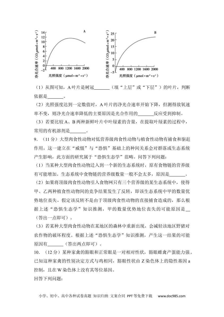 小学、初中、高中各种试卷真题知识归纳文案合同PPT等免费下载www.doc985.com2018年全国统一高考生物试卷(新课标Ⅱ)一、选择题:本题共6小题,每小题6分,共36分,在每小题给出的四个选项中,只有一项是符合题目要求的。1.(6分)下列关于人体中蛋白质功能的叙述,错误的是()A.浆细胞产生的抗体可结合相应的病毒抗原B.肌细胞中的某些蛋白质参与肌肉收缩的过程C.蛋白质结合Mg2+形成的血红蛋白参与O2运输D.细胞核中某些蛋白质是染色体的重要组成成分2.(6分)下列有关物质跨膜运输的叙述,正确的是()A.巨噬细胞摄入病原体的过程属于协助扩散B.固醇类激素进入靶细胞的过程属于主动运输C.神经细胞受到刺激时产生的Na+内流属于被动运输D.护肤品中的甘油进入皮肤细胞的过程属于主动运输3.(6分)下列有关人体内激素的叙述,正确的是()A.运动时,肾上腺素水平升高,可使心率加快,说明激素是高能化合物B.饥饿时,胰高血糖素水平升高,促进糖原分解,说明激素具有酶的催化活性C.进食后,胰岛素水平升高,其既可加速糖原合成,也可作为细胞的结构组分D.青春期,性激素水平升高,随体液到达靶细胞,与受体结合可促进机体发育4.(6分)有些作物的种子入库前需要经过风干处理。与风干前相比,下列说法错误的是()A.风干种子中有机物的消耗减慢B.风干种子上微生物不易生长繁殖C.风干种子中细胞呼吸作用的强度高D.风干种子中结合水与自由水的比值大5.(6分)下列关于病毒的叙述,错误的是()A.从烟草花叶病毒中可以提取到RNAB.T2噬菌体可感染肺炎双球菌导致其裂解C.HIV可引起人的获得性免疫缺陷综合征小学、初中、高中各种试卷真题知识归纳文案合同PPT等免费下载www.doc985.comD.阻断病毒的传播可降低其所致疾病的发病率6.(6分)在致癌因子的作用下,正常动物细胞可转变为癌细胞。有关癌细胞特点的叙述错误的是()A.细胞中可能发生单一基因突变,细胞间黏着性增加B.细胞中可能发生多个基因突变,细胞的形态发生变化C.细胞中的染色体可能受到损伤,细胞的增殖失去控制D.细胞中遗传物质可能受到损伤,细胞表面的糖蛋白减少必考题:7.(8分)为研究垂体对机体生长发育的作用,某同学用垂体切除法进行实验。在实验过程中,用幼龄大鼠为材料,以体重变化作为生长发育的检测指标。问答下列问题:(1)请完善下面的实验步骤①将若干只大鼠随机分为A、B两组后进行处理,A组(对照组)的处理是;B组的处理是②将上述两组大鼠置于相同的适宜条件下饲养。③。④对所得数据进行统计处理与分析。(2)实验结果与分析B组大鼠生长发育的状况不如A组,出现这种差异的原因是由于B组的处理使大鼠缺失了来源于垂体的激素和激素。8.(8分)为了研究某种树木树冠上下层叶片光合作用的特性,某同学选取来自树冠不同层的A、B两种叶片,分別测定其净光合速率,结果如图所示。据图回答问题:小学、初中、高中各种试卷真题知识归纳文案合同PPT等免费下载www.doc985.com(1)从图可知,A叶片是树冠(填“上层”或“下层”)的叶片,判断依据是。(2)光照强度达到一定数值时,A叶片的净光合速率开始下降,但测得放氧速率不变,则净光合速率降低的主要原因是光合作用的反应受到抑制。(3)若要比较A、B两种新鲜叶片中叶绿素的含量,在提取叶绿素的过程中,常用的有机溶剂是。9.(11分)大型肉食性动物对低营养级肉食性动物与植食性动物有捕食和驱赶作用,这一建立在“威慑”与“恐惧”基础上的种间关系会对群落或生态系统产生影响,此方面的研究属于“恐惧生态学”范畴。问答下列问题:(1)当某种大型肉食性动物迁入到一个新的生态系统时,原有食物链的营养级有可能增加。生态系统中食物链的营养级数量一般不会太多,原因是。(2)如果将顶级肉食性动物引入食物网只有三个营养级的某生态系统中,使得甲、乙两种植食性动物间的竞争结果发生了反转,即该生态系统中甲的数量优势地位丧失。假定该反转不是由于顶级肉食性动物的直接捕食造成的,那么根据上述“恐惧生态学”知识推测,甲的数量优势地位丧失的可能原因是(答出一点即可)。(3)若某种大型肉食性动物在某地区的森林中重...