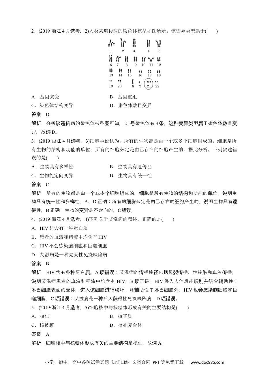 小学、初中、高中各种试卷真题知识归纳文案合同PPT等免费下载www.doc985.com参考答案一、选择题(本大题共28小题,每小题2分,共56分)1.B2.D3.C4.B5.A6.A7.C8.A9.C10.D11.B12.B13.D14.D15.D16.D17.A18.C19.B20.C21.D22.A23.D24.A25.D26.A27.A28.B二、非选择题(本大题共5小题,共44分)29.(6分)(1)生物放大底泥(2)富营养化正反馈(3)自然增长率(4)逻辑斯谛(或S形)30.(7分)(1)增加ATP和NADPH增加基质(2)类胡萝卜素蓝紫光和红低温31.(7分)(1)伴Ⅹ染色体隐性遗传杂交组合甲的亲本均为野生型,F1中雌性个体均为野生型,而雄性个体中出现了朱红眼(2)BbXAXaBbXAY两对等位基因均为隐性时表现为白色(3)32.(14分)(一)(1)腐烂的水果中含产果胶酶的微生物较多(2)涂布分离(或划线分离)(3)水果组织软化疏松及细胞受损95%乙醇(4)提高果胶酶的稳定性固定化的方法固定化所用的介质(二)(1)单克隆抗体基因文库(2)B小学、初中、高中各种试卷真题知识归纳文案合同PPT等免费下载www.doc985.com(3)变异高浓度致病真菌花粉离体(4)胚的离体培养33.(10分)(1)①分别测定每只小鼠的血糖浓度,并记录②将小鼠分为A、B两组,A组注射胰岛素,B组注射生理盐水。每隔一段时间,分别测定两组小鼠的血糖浓度,并记录③当岀现低血糖症状后,A组注射葡萄糖溶液,B组注射生理盐水。每隔一段时间,分别测定两组小鼠的血糖浓度,并记录④对每组所得数据进行统计分析(3)①胰岛素促进肾小管对过滤液中葡萄糖的吸收②胰岛β细胞分泌胰岛素增加,胰岛α细胞分泌胰高血糖素减少抑制氨基酸等物质转化为葡萄糖2019年4月浙江省普通高校招生选考科目考试选择题部分一、选择题1.(2019·浙江4月考,选1)下列关于全球性生态环境问题的叙述,错误的是()A.臭氧层能降低太空紫外线对生物的伤害B.人类活动对大量野生生物的灭绝没有影响C.限制二氧化硫和一氧化氮的排放量是防治酸雨的有效措施D.化石燃料的大量燃烧使二氧化碳的全球平衡受到严重干扰答案B解析臭能吸收紫外,可以降低太空紫外生物的害,氧线线对伤A正确;人活大量野生项类动对生物的生影,灭绝会产响B;防治酸雨最有效的法是限制二化硫和一化的排放量项错误办氧氧氮,或者燃料中把些物去掉,从这质C正确;化石燃料的大量燃放多的二化,而项烧会释较氧碳从严重干二化的全球平衡,扰氧碳D正确。项小学、初中、高中各种试卷真题知识归纳文案合同PPT等免费下载www.doc985.com2.(2019·浙江4月考,选2)人类某遗传病的染色体核型如图所示。该变异类型属于()A.基因突变B.基因重组C.染色体结构变异D.染色体数目变异答案D解析分析病的染色体核型可知,该遗传图21染色体有号3,型于染色体目条这种变异类属数变,故异选D。3.(2019·浙江4月考,选3)细胞学说认为:所有的生物都是由一个或多个细胞组成的;细胞是所有生物的结构和功能的单位;所有的细胞必定是由已存在的细胞产生的。据此分析,下列叙述错误的是()A.生物具有多样性B.生物具有遗传性C.生物能定向变异D.生物具有统一性答案C解析所有的生物都是由一或多胞成的,胞是所有生物的和功能的位,明生个个细组细结构单说物具有一性和多性,统样A、D正确;所有的胞必定是由已存在的胞生的,明生物具有细细产说遗性,传B正确;生物的是不定向的,变异C。错误4.(2019·浙江4月考,选4)下列关于艾滋病的叙述,正确的是()A.HIV只含有一种蛋白质B.患者的血液和精液中均含有HIVC.HIV不会感染脑细胞和巨噬细胞D.艾滋病是一种先天性免疫缺陷病答案B解析HIV含有多蛋白,种质A;艾滋病的播途包括母播、性接和血液播,项错误传径婴传触传明艾滋病患者的血液和精液中均含有说HIV,B正确;项HIV侵入人体后能合助性识别并结辅T淋巴胞表面的受体,入胞行破坏,除助性细进该细进辅T淋巴胞外,细HIV也感染胞和巨会脑细噬胞,细C;艾滋病是一后天得性免疫缺陷病,项错误种获D。项错误5.(2019·浙江4月考,选5)细胞核中与核糖体形成有关的主要结构是()A.核仁B.核基质C.核被膜D.核孔复合体答案A解析胞核中核糖体形成有的主要是核仁,故细与关结构选A。小学、初中、高中各...