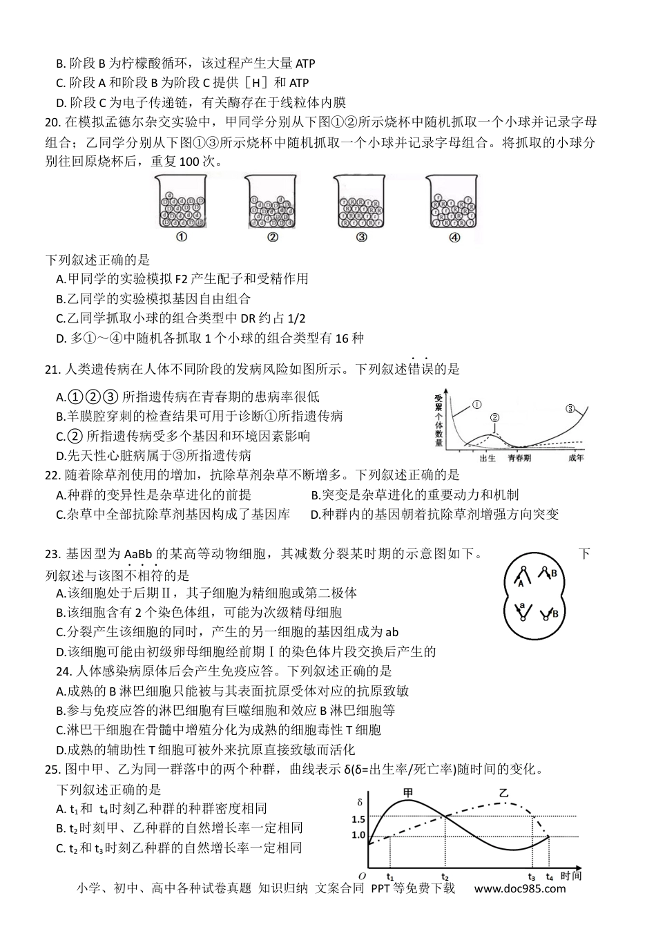 小学、初中、高中各种试卷真题知识归纳文案合同PPT等免费下载www.doc985.com2016年10月浙江省普通高校招生选考科目考试生物试题一、选择题(本大题共28小题,每小题2分,共56分)1.下列生物细胞具有细胞壁的是A.蚕豆叶表皮细胞B.狗骨骼肌细胞C.牛神经细胞人D.人红细胞2.将生长素能透过的明胶插在幼苗尖端与其下部之间,如图所示。给予单侧光照射一段时间后,幼苗将A.直立生长B.不生长C.向光弯曲生长D.背光弯曲生长3.腺垂体分泌的促甲状腺激素作用于A.甲状腺B.性腺C.脊髓D.脑4.在实验条件下,矮牵牛叶片细胞能能发育成完整植株。这说明该细胞具有A.普遍性B.统一性C.全能性D.特异性5.用γ射线处理灿稻种子,选育出了新品种。该育种方法属于A.杂交育种B.诱变育种C.单倍体育种D.转基因育种6.酸雨产生的多种危害中,不包括A.伤害陆地植物B.破坏水体生态平衡C.产生温室效应D.破坏土壤肥力7.遗传信息表达的过程中,mRNA的三个碱基是UAC,则DNA模板链上对应的三碱基是A.ATGB.TACC.TUCD.AUG8.下列关于种群的叙述,正确的是A.种群的性比率都为1:1B.种群内的个体都能互配繁殖C.种群在理想条件下呈“S”形增长D.种群的老龄个体比例过大,预示种群密度将下降9.某海湾水体富营养化严重,大型鱼类种类减少,将导致A.生物群落发生演替B.食物网复杂程度降低C.食物链的环节增多D.生态系统稳定性增强10.在“探究2,4-D对插枝生根的作用”的活动中,将某种植物枝条分成两组进行实验。下列叙述错误的是A.两组应选用长势相同的枝条B.用的数目和长度作用观测指标C.一组用蒸馏水处理,另一组用等量的2,4-D溶液处理D.实验结论是2,4-D浓度越高,促进生根的作用超强11.用R型和S型肺炎双球菌进行实验,其过程和结果如图所示。据图分析可知A.RNA是转化因子B.荚膜多糖具有生物活性小学、初中、高中各种试卷真题知识归纳文案合同PPT等免费下载www.doc985.comC.DNA是转化因子D.DNA是主要的遗传物质12.下列关于蛋白质的叙述,正确的是A.蛋白质分子都含有碳、氢、氧、氮B.组成每种蛋白质的氨基酸都有20种C.每种蛋白质分子都由多条肽链组成D.蛋白质发生热变性后不影响其功能13.下列关于高等动物细胞有丝分裂的叙述,正确的是A.前期核膜解体成磷脂分子和蛋白质分子B.中期染色体的显微照片可制作染色体组型图C.后期着丝粒断裂导致染色单体数目加倍D.末期囊泡聚集成的细胞板形成新的膜14.人体通过多种调节来维持体温的相对稳定。下列叙述正确的是A.安静时主要由骨骼肌产热B.人体的蒸发散热主要通过呼吸道进行C.温热时血管舒张是通过体液调节实现的D.寒冷刺激下甲状腺激素分泌增加以利于产热15.下列关于细胞器的叙述,错误的是A.溶酶体只有消化细胞内的衰老的细胞器B.线粒体含有核糖体且能发生转录和翻译C.高尔基体分拣蛋白质分别送到细胞内或细胞外D.粗面内质网内的蛋白质会送到高尔基体和细胞其他部位16.下列关于“观察洋葱表皮细胞的质壁分离及质壁分离复原”活动的叙述,正确的是A.制作洋葱表皮细胞装片需经解离、压片等操作才能将细胞分散B.从低倍镜换成高倍镜时,需转动光圈才能换上高倍物镜C.质壁分离过程中,水分子从胞内单向动物到胞外导致液泡变小D.质壁分离复原过程中,细胞吸水速度逐步减慢17.调查发现,人类的外耳道多毛症总是由父亲传给儿子,女性无此症。下列叙述正确的是A.该症属于X连锁遗传B.外耳道多毛症基因位于常染色体上C.患者的体细胞都有成对的外耳道多毛症基因D.患者产生的精子中有外耳道多毛症基因占1/218.某同学进行有关酶的实验:组1:1%淀粉溶液+新鲜唾液+本尼迪特试剂→红黄色沉淀组2:2%蔗糖溶液+新鲜唾液+本尼迪特试剂→无红黄色沉淀组3:2%蔗糖溶液+蔗糖酶溶液+本尼迪特试剂→下列叙述错误的是A.自变量是底物和酶B.组3的结果是红黄色沉淀C.指示剂可用碘-碘化钾溶液替代D.实验结果证明酶具有专一性19.真核细胞需氧呼吸的基本过程示意图如下。下列叙述正确的是A.阶段A为糖酵解,该阶段的产物是丙酮酸和物质①小学、初中、高中各种试卷真题知识归纳文案合同PPT等免费下载www.doc985.comB.阶段B为柠檬酸循环,该过程产生大量ATPC.阶段A和阶段B为阶段C提供[H]和ATPD.阶段C为电子传递链,有关...