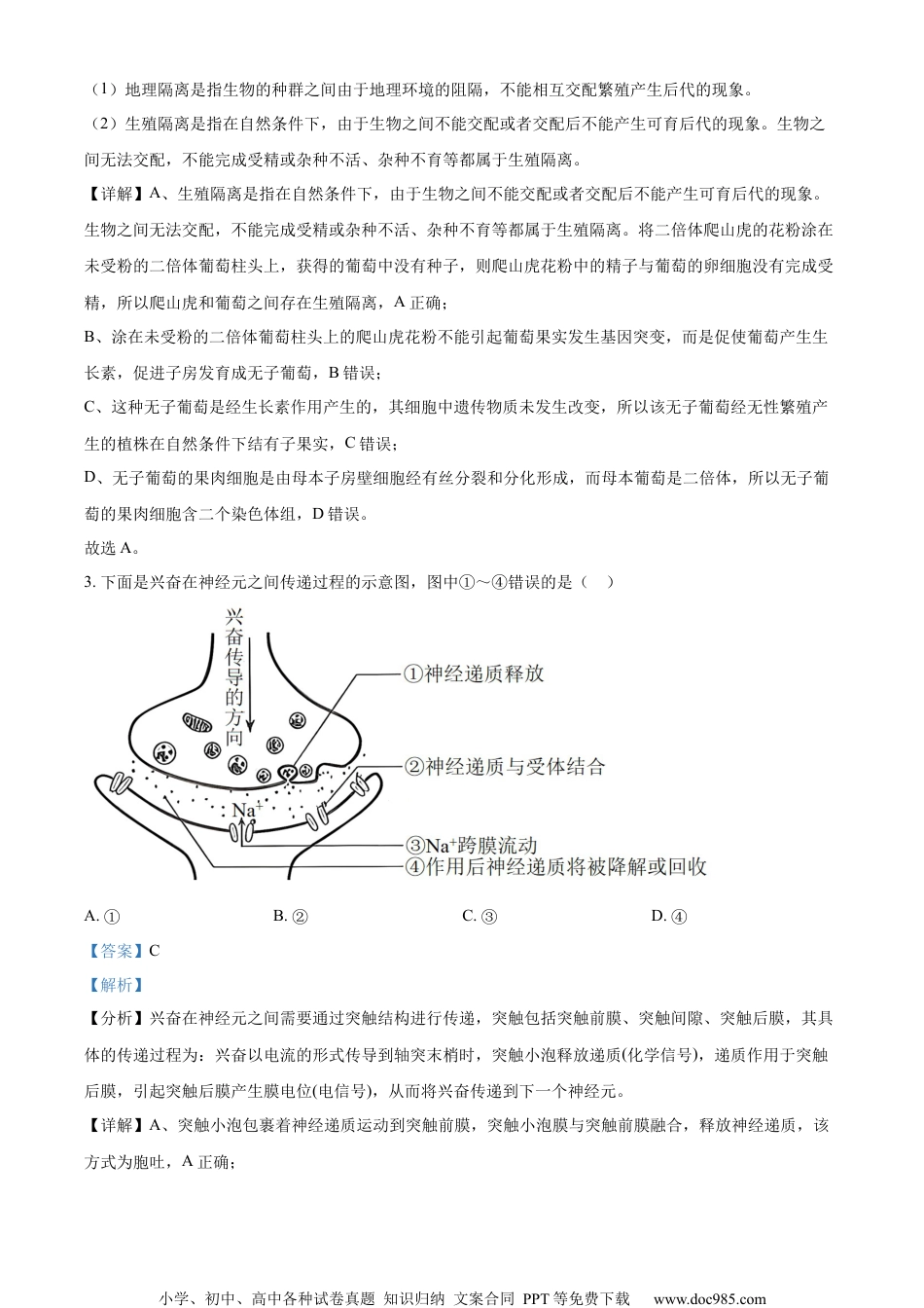 小学、初中、高中各种试卷真题知识归纳文案合同PPT等免费下载www.doc985.com机密★启用前2023年辽宁省普通高等学校招生选择性考试科目:生物学(试题卷)注意事项:1.答卷前,考生须在答题卡和试题卷上规定的位置,准确填写本人姓名、准考证号,并核对条形码上的信息。确认无误后,将条形码粘贴在答题卡上相应位置。2.考生须在答题卡上各题目规定答题区域内答题,超出答题区域书写的答案无效。在草稿纸、试题卷上答题无效。3.考试结束,将本试题卷和答题卡一并交回。4.本试题卷共10页,如缺页,考生须声明,否则后果自负。姓名_____准考证号_____机密★启用前2023年辽宁省普通高等学校招生选择性考试生物学注意事项:1.答卷前,考生务必将自己的姓名、准考证号填写在答题卡上。2.答选择题时,选出每小题答案后,用铅笔把答题卡对应题目的答案标号涂黑。如需改动,用橡皮擦干净后,再选涂其他答案标号。答非选择题时,将答案写在答题卡上。写在本试卷上无效。3.考试结束后,将本试卷和答题卡一并交回。一、选择题:本题共15小题,每小题2分,共30分。在每小题给出的四个选项中,只有一项符合题目要求。1.科学家根据对部分植物细胞观察的结果,得出“植物细胞都有细胞核”的结论。下列叙述错误的是()小学、初中、高中各种试卷真题知识归纳文案合同PPT等免费下载www.doc985.comA.早期的细胞研究主要运用了观察法B.上述结论的得出运用了归纳法C.运用假说—演绎法将上述结论推演至原核细胞也成立D.利用同位素标记法可研究细胞核内的物质变化【答案】C【解析】【分析】1、假说-演绎法的步骤:发现现象→提出问题→作出假设→演绎推理→实验验证。2、归纳法分为完全归纳法和不完全归纳法,完全归纳法是由所有事实推出一般结论;不完全归纳法是由部分事实推出一般结论。科学假说(理论)的提出通常建立在不完全归纳的基础上,因此常常需要进一步的检验。3、用物理性质特殊的同位素来标记化学反应中原子的去向,就是同位素标记法。同位素标记可用于示踪物质的运行和变化规律。生物学研究中常用的同位素有的具有放射性,如14C、32P、3H、35S等;有的不具有放射性,是稳定同位素,如15N、18O等。【详解】A、细胞研究需要使用显微镜、放大镜、等工具,一般使用显微镜;观察早期的细胞研究主要运用了观察法,A正确;B、根据部分植物细胞都有细胞核,得出植物细胞都有细胞核这一结论,运用的是不完全归纳法,B正确;C、原核细胞没有成形的细胞核,C错误;D、同位素标记法可以示踪物质的运行和变化规律,故可利用同位素标记法研究细胞核内的物质变化,D正确;故选C。2.葡萄与爬山虎均是葡萄科常见植物,将二倍体爬山虎的花粉涂在未受粉的二倍体葡萄柱头上,可获得无子葡萄。下列叙述正确的是()A.爬山虎和葡萄之间存在生殖隔离B.爬山虎花粉引起葡萄果实发生了基因突变C.无子葡萄经无性繁殖产生的植株仍结无子果实D.无子葡萄的果肉细胞含一个染色体组【答案】A【解析】【分析】隔离:1、定义:隔离是指在自然条件下生物不能自由交配,或者即使能交配也不能产生可育后代的现象。2、隔离主要分为地理隔离与生殖隔离两类:小学、初中、高中各种试卷真题知识归纳文案合同PPT等免费下载www.doc985.com(1)地理隔离是指生物的种群之间由于地理环境的阻隔,不能相互交配繁殖产生后代的现象。(2)生殖隔离是指在自然条件下,由于生物之间不能交配或者交配后不能产生可育后代的现象。生物之间无法交配,不能完成受精或杂种不活、杂种不育等都属于生殖隔离。【详解】A、生殖隔离是指在自然条件下,由于生物之间不能交配或者交配后不能产生可育后代的现象。生物之间无法交配,不能完成受精或杂种不活、杂种不育等都属于生殖隔离。将二倍体爬山虎的花粉涂在未受粉的二倍体葡萄柱头上,获得的葡萄中没有种子,则爬山虎花粉中的精子与葡萄的卵细胞没有完成受精,所以爬山虎和葡萄之间存在生殖隔离,A正确;B、涂在未受粉的二倍体葡萄柱头上的爬山虎花粉不能引起葡萄果实发生基因突变,而是促使葡萄产生生长素,促进子房发育成无子葡萄,B错误;C、这种无子葡萄是经生长素作用产生的,其细胞中遗传物质...