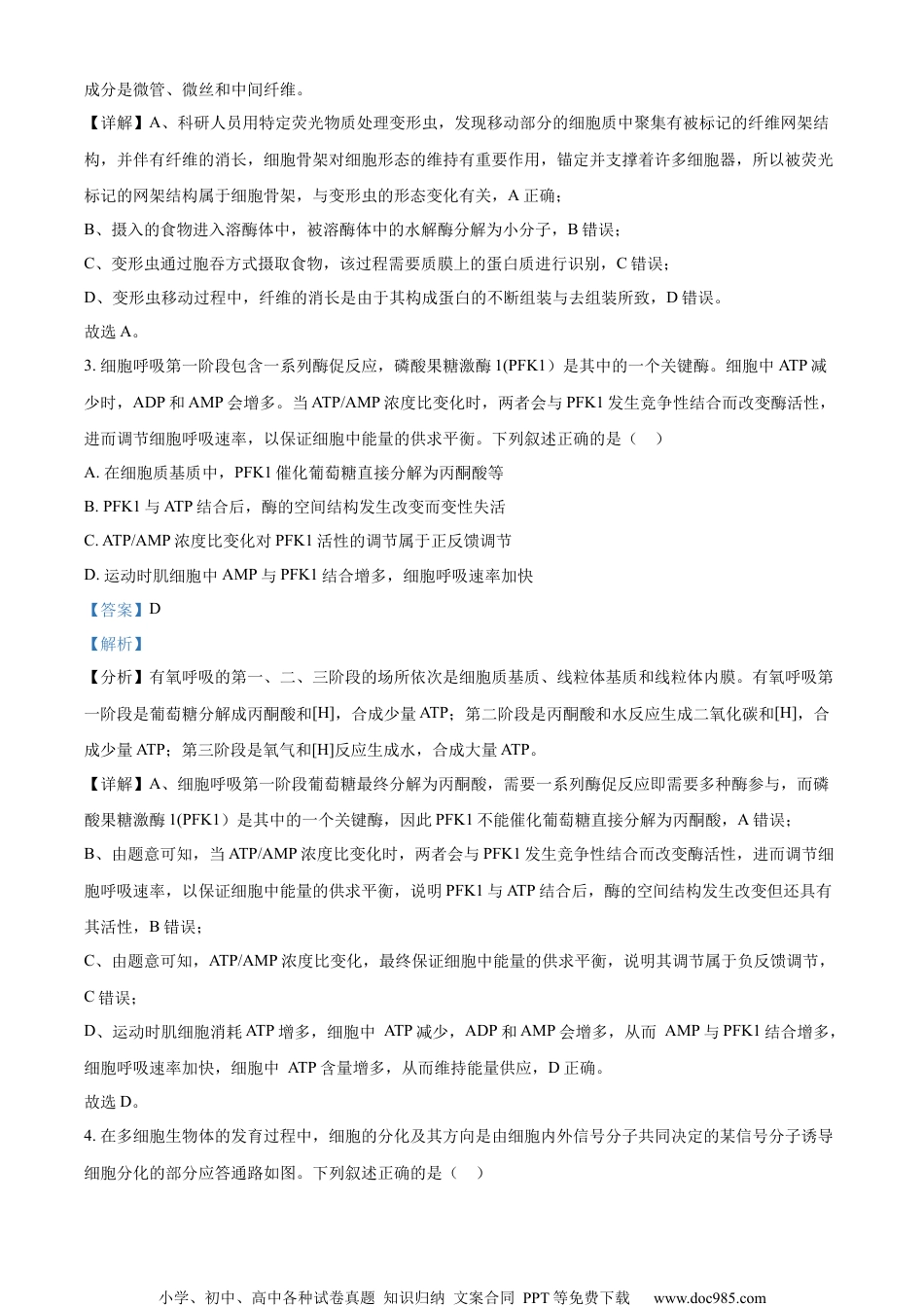 小学、初中、高中各种试卷真题知识归纳文案合同PPT等免费下载www.doc985.com2024年安徽省普通高中学业水平选择性考试(安徽卷)生物学一、选择题:本题共15小题,每小题3分,共45分。在每小题给出的四个选项中,只有一项是符合题目要求的。1.真核细胞的质膜、细胞器膜和核膜等共同构成生物膜系统。下列叙述正确的是()A.液泡膜上的一种载体蛋白只能主动转运一种分子或离子B.水分子主要通过质膜上的水通道蛋白进出肾小管上皮细胞C.根尖分生区细胞的核膜在分裂间期解体,在分裂末期重建D.[H]与氧结合生成水并形成ATP的过程发生在线粒体基质和内膜上【答案】B【解析】【分析】由细胞膜、核膜以及各种细胞器膜等共同构成生物膜系统。【详解】A、液泡膜上的一种载体蛋白能转运一种或一类分子或离子,A错误;B、水分子主要通过质膜上的水通道蛋白进出肾小管上皮细胞,B正确;C、根尖分生区细胞的核膜在分裂前期解体,在分裂末期重建,C错误;D、[H]与氧结合生成水并形成ATP的过程发生在线粒体内膜上,D错误。故选B。2.变形虫可通过细胞表面形成临时性细胞突起进行移动和摄食。科研人员用特定荧光物质处理变形虫,发现移动部分的细胞质中聚集有被标记的纤维网架结构,并伴有纤维的消长。下列叙述正确的是()A.被荧光标记的网架结构属于细胞骨架,与变形虫的形态变化有关B.溶酶体中的水解酶进入细胞质基质,将摄入的食物分解为小分子C.变形虫通过胞吞方式摄取食物,该过程不需要质膜上的蛋白质参与D.变形虫移动过程中,纤维的消长是由于其构成蛋白的不断组装所致【答案】A【解析】【分析】1、溶酶体是细胞的“消化车间”,内部含有多种水解酶,如果溶酶体的膜破裂,水解酶就会逸出至细胞质,可能造成细胞自溶。2、细胞骨架是由蛋白质与蛋白质搭建起的骨架网络结构,包括细胞质骨架和细胞核骨架,其中细胞骨架的主要作用是维持细胞的一定形态。细胞骨架对于细胞内物质运输和细胞器的移动来说又起交通动脉的作用;细胞骨架还将细胞内基质区域化;此外,细胞骨架还具有帮助细胞移动行走的功能。细胞骨架的主要小学、初中、高中各种试卷真题知识归纳文案合同PPT等免费下载www.doc985.com成分是微管、微丝和中间纤维。【详解】A、科研人员用特定荧光物质处理变形虫,发现移动部分的细胞质中聚集有被标记的纤维网架结构,并伴有纤维的消长,细胞骨架对细胞形态的维持有重要作用,锚定并支撑着许多细胞器,所以被荧光标记的网架结构属于细胞骨架,与变形虫的形态变化有关,A正确;B、摄入的食物进入溶酶体中,被溶酶体中的水解酶分解为小分子,B错误;C、变形虫通过胞吞方式摄取食物,该过程需要质膜上的蛋白质进行识别,C错误;D、变形虫移动过程中,纤维的消长是由于其构成蛋白的不断组装与去组装所致,D错误。故选A。3.细胞呼吸第一阶段包含一系列酶促反应,磷酸果糖激酶1(PFK1)是其中的一个关键酶。细胞中ATP减少时,ADP和AMP会增多。当ATP/AMP浓度比变化时,两者会与PFK1发生竞争性结合而改变酶活性,进而调节细胞呼吸速率,以保证细胞中能量的供求平衡。下列叙述正确的是()A.在细胞质基质中,PFK1催化葡萄糖直接分解为丙酮酸等B.PFK1与ATP结合后,酶的空间结构发生改变而变性失活C.ATP/AMP浓度比变化对PFK1活性的调节属于正反馈调节D.运动时肌细胞中AMP与PFK1结合增多,细胞呼吸速率加快【答案】D【解析】【分析】有氧呼吸的第一、二、三阶段的场所依次是细胞质基质、线粒体基质和线粒体内膜。有氧呼吸第一阶段是葡萄糖分解成丙酮酸和[H],合成少量ATP;第二阶段是丙酮酸和水反应生成二氧化碳和[H],合成少量ATP;第三阶段是氧气和[H]反应生成水,合成大量ATP。【详解】A、细胞呼吸第一阶段葡萄糖最终分解为丙酮酸,需要一系列酶促反应即需要多种酶参与,而磷酸果糖激酶1(PFK1)是其中的一个关键酶,因此PFK1不能催化葡萄糖直接分解为丙酮酸,A错误;B、由题意可知,当ATP/AMP浓度比变化时,两者会与PFK1发生竞争性结合而改变酶活性,进而调节细胞呼吸速率,以保证细胞中能量的供求平衡,说明PFK1与ATP结合后,酶的空间结构发生改变但还具有其活性,B错误;C、由题意可知,ATP/AMP浓度...