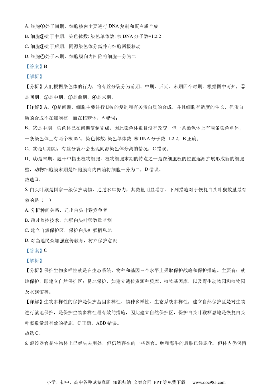 小学、初中、高中各种试卷真题知识归纳文案合同PPT等免费下载www.doc985.com2024年1月浙江省普通高校招生选考科目考试生物学试题考生须知:1.考生答题前,务必将自己的姓名、准考证号用黑色字迹的签字笔或钢笔填写在答题纸上。2.选择题的答案须用2B铅笔将答题纸上对应题目的答案标号涂黑,如要改动,须将原填涂处用橡皮擦净。3.非选择题的答案须用黑色字迹的签字笔或钢笔写在答题纸上相应区域内,作图时可先使用2B铅笔,确定后须用黑色字迹的签字笔或钢笔描黑,答案写在本试题卷上无效。选择题部分一、选择题(本大题共19小题,每小题2分,共38分。每小题列出的四个备选项中只有一个是符合题目要求的,不选、多选、错选均不得分)1.关于生物技术的安全与伦理问题在我国相关法规明令禁止的是()A.试管动物的培育B.转基因食品的生产C.治疗性克隆的研究D.生物武器的发展和生产【答案】D【解析】【分析】1、我国政府一再重申四不原则:不赞成、不允许、不支持、不接受任何生殖性克隆人实验。2、2010年,在第65届联合国大会上,我国政府重申支持《禁止生物武器公约》的宗旨和目标,全面、严格履行公约义务,支持不断加强公约的约束力,并主张全面禁止和彻底销毁生物武器等各类大规模杀伤性武器。【详解】A、试管动物的培育属于胚胎工程,没有禁止,A正确;B、我过目前不反对转基因的食品的生产,B正确;C、中国政府禁止生殖性克隆,支持治疗性克隆,C正确;D、生物武器致病能力强、攻击范围广,世界范围内应全面禁止生物武器,D错误。故选D。2.下列不属于水在植物生命活动中作用的是()A.物质运输的良好介质B.保持植物枝叶挺立C.降低酶促反应活化能D.缓和植物温度变化【答案】C【解析】小学、初中、高中各种试卷真题知识归纳文案合同PPT等免费下载www.doc985.com【分析】水是活细胞中含量最多的化合物,在细胞内以自由水和结合水的形式存在,结合水是细胞结构的重要组成成分,自由水是细胞内良好的溶剂,是化学反应的介质,自由水还是许多化学反应的反应物或者产物,自由水能自由移动,对于生物体内的营养物质和代谢废物的运输具有重要作用,自由水与结合水可以相互转化,自由水与结合水比值升高,细胞代谢旺盛,抗逆性差,反之亦然。【详解】A、自由水可以自由流动,是细胞内主要的物质运输介质,A正确;B、水可以保持植物枝叶挺立,B正确;C、降低酶促反应活化能的是酶,水不具有此功能,C错误;D、水的比热容较大,能缓和植物温度的变化,D正确。故选C。3.婴儿的肠道上皮细胞可以吸收母乳中的免疫球蛋白,此过程不涉及()A.消耗ATPB.受体蛋白识别C.载体蛋白协助D.细胞膜流动性【答案】C【解析】【分析】小分子的物质可以通过主动运输和被动运输来进出细胞,大分子进出细胞是通过内吞和外排来完成的。被动运输的动力来自细胞内外物质的浓度差,主动运输的动力来自ATP。胞吞和胞吐进行的结构基础是细胞膜的流动性。胞吞和胞吐与主动运输一样也需要能量供应。【详解】AD、免疫球蛋白化学本质是蛋白质,是有机大分子物质,吸收方式为胞吞,需要消耗ATP,胞吞体现了细胞膜具有一定的流动性的结构特点,AD正确;BC、免疫球蛋白是有机大分子物质,细胞吸收该物质,需要受体蛋白的识别,不需要载体蛋白的协助,B正确,C错误。故选C。4.观察洋葱根尖细胞有丝分裂装片时,某同学在显微镜下找到①~④不同时期的细胞,如图。关于这些细胞所处时期及主要特征的叙述,正确的是()小学、初中、高中各种试卷真题知识归纳文案合同PPT等免费下载www.doc985.comA.细胞①处于间期,细胞核内主要进行DNA复制和蛋白质合成B.细胞②处于中期,染色体数:染色单体数:核DNA分子数=1:2:2C.细胞③处于后期,同源染色体分离并向细胞两极移动D.细胞④处于末期,细胞膜向内凹陷将细胞一分为二【答案】B【解析】【分析】人们根据染色体的行为,将有丝分裂分为前期、中期、后期、末期四个时期。根据图中可知,①是间期,②是中期,③是前期,④是末期。【详解】A、①是间期,细胞主要进行DNA的复制和有关蛋白质的合成,并且细胞有适度的生长,但蛋白质的合成不在细胞核,而在核糖体,A错误;B、②是中期,染色体已在...