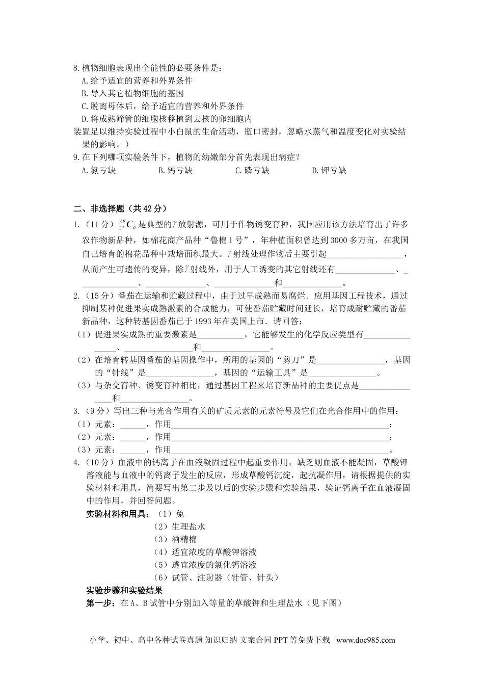 2000年黑龙江高考生物真题及答案一、单项选择题1.在我国西部大开发的战略中,“保护天然林”和“退耕还林(草)”是两项重要内容,采取这两项措施的首要目标是:A.开展生态旅游B.发展畜牧业C.增加木材产量D.改善生态环境2.细胞质基质、线粒体基质和叶绿体基质的:A.功能及所含有机化合物都相同B.功能及所含有机化合物都不同C.功能相同,所含有机化合物不同D.功能不同,所含有机化合物相同3.假如水稻高秆(D)对矮秆(d)为显性,抗稻瘟病(R)对易感稻瘟病(r)为显性,两对性状独立遗传,用一个纯合易感病的矮秆品种(抗倒伏)与一个纯合抗病高秆品种(易倒伏)杂交,F2代中出现既抗病又抗倒伏类型的基因型及其比例为:A.ddRR,1/8B.ddRr,1/16C.ddRR,1/16和ddRr,1/8D.DDrr,1/16和DdRR,1/84.豆科植物与根瘤菌的互利共生关系主要体现在:A.豆科植物从根瘤菌获得NH3,根瘤菌从豆科植物获得糖类B.豆科植物从根瘤菌获得含氮有机物,根瘤菌从豆科植物获得NH3C.豆科植物从根瘤菌获得N2,根瘤菌从豆科植物获得有机物D.豆科植物从根瘤菌获得NO,根瘤菌从豆科植物获得NH35.请据图回答,经数小时后,U形管A、B两处的液面会出现下列哪种情况?(实验A.A处上升,B处下降B.A、B两处都下降C.A处下降,B处上升D.A、B两处都不变6.下图是一个陆地生态系统食物网的结构模式图,下列叙述中不正确的是:A.在该食物网中,共有五条食物链存在B.在该食物网中,H处于三个不同的营养级C.若B种群中各年龄期的个体数目比例适中,则该种群的密度在一段时间内会明显变大D.在该食物网中,如果C种群的数量下降10%,则H的数量不会发生明显变化7.切除某动物的垂体后,血液中:A.生长激素减少,甲状腺激素也减少B.生长激素减少,甲状腺激素增加C.生长激素增加,甲状腺激素也增加D.生长激素增加,甲状腺激素减少小学、初中、高中各种试卷真题知识归纳文案合同PPT等免费下载www.doc985.com8.植物细胞表现出全能性的必要条件是:A.给予适宜的营养和外界条件B.导入其它植物细胞的基因C.脱离母体后,给予适宜的营养和外界条件D.将成熟筛管的细胞核移植到去核的卵细胞内装置足以维持实验过程中小白鼠的生命活动,瓶口密封,忽略水蒸气和温度变化对实验结果的影响。)9.在下列哪项实验条件下,植物的幼嫩部分首先表现出病症?A.氮亏缺B.钙亏缺C.磷亏缺D.钾亏缺二、非选择题(共42分)1.(11分)是典型的放射源,可用于作物诱变育种,我国应用该方法培育出了许多农作物新品种,如棉花商产品种“鲁棉1号”,年种植面积曾达到3000多万亩,在我国自己培育的棉花品种中栽培面积最大。射线处理作物后主要引起__________________,从而产生可遗传的变异,除射线外,用于人工诱变的其它射线还有______________、______________、______________、______________和______________。2.(15分)番茄在运输和贮藏过程中,由于过早成熟而易腐烂.应用基因工程技术,通过抑制某种促进果实成熟激素的合成能力,可使番茄贮藏时间延长,培育成耐贮藏的番茄新品种,这种转基因番茄已于1993年在美国上市.请回答:(1)促进果实成熟的重要激素是___________,它能够发生的化学反应类型有________________、________________和________________。(2)在培育转基因番茄的基因操作中,所用的基因的“剪刀”是________________,基因的“针线”是________________,基因的“运输工具”是________________。(3)与杂交育种、诱变育种相比,通过基因工程来培育新品种的主要优点是________________和________________。3.(9分)写出三种与光合作用有关的矿质元素的元素符号及它们在光合作用中的作用:(1)元素:______,作用___________________________________________________;(2)元素:______,作用___________________________________________________;(3)元素:______,作用___________________________________________________。4.(10分)血液中的钙离子在血液凝固过程中起重要作用,缺乏则血液不能凝固,草酸钾溶液能与血液中的钙离子发生的反应,形成草酸钙沉淀,起抗凝作用,请根据提供的实验材料和用具,简要写出第二步及...