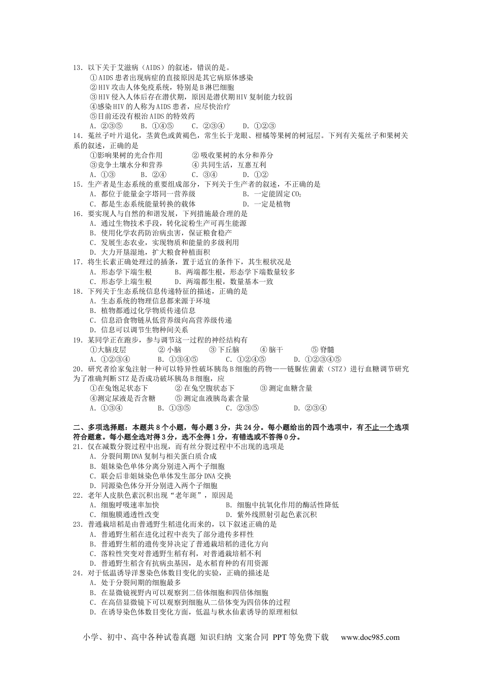 小学、初中、高中各种试卷真题知识归纳文案合同PPT等免费下载www.doc985.com2008年高考广东卷--生物一、单项选择题:本题共20小题。每小题2分。共40分。每小题给出的四个选项中。只有一个选项最符合题目要求。1.具有细胞壁的选项是A.花粉B.红细胞C.胰岛A细胞D.流感病毒2.甲、乙两种物质分别依赖自由扩散(简单扩散)和协助扩散进入细胞,如果以人工合成的无蛋白磷脂双分子膜代替细胞膜,并维持其它条件不变,则A.甲运输被促进B.乙运输被促进C.甲运输被抑制D.乙运输被抑制3.观察在0.3g/mL蔗糖溶液中的洋葱表皮细胞,发现中央液泡逐渐变小,说明A.细胞壁相当于一层半透膜B.洋葱表皮细胞是活的C.此时蔗糖溶液浓度小于细胞液浓度D.细胞壁收缩导致中央液泡失水4.关于叶肉细胞在光照条件下产生ATP的描述,正确的是A.无氧条件下,光合作用是细胞ATP的唯一来源B.有氧条件下,线粒体、叶绿体和细胞质基质都能产生ATPC.线粒体和叶绿体合成ATP都依赖氧D.细胞质中消耗的ATP均来源于线粒体和叶绿体5.用高倍显微镜观察黑藻叶绿体时,可见叶绿体A.具有双层膜B.呈绿色带状C.内部有许多基粒D.呈绿色椭球形6.关于蛋白酶的叙述,不正确的是A.蛋白酶是蛋白质B.蛋白酶可以作为药品治疗某些疾病C.蛋白酶可以水解所有的肽键D.利用酶工程可以提高蛋白酶的稳定性7.21三体综合征患儿的发病率与母亲年龄的关系如右图所示,预防该遗传病的主要措施是①适龄生育②基因诊断③染色体分析④B超检查A.①③B.①②C.③④D.②③8.改良缺乏某种抗病性的水稻品种,不宜采用的方法是A.诱变育种B.单倍体育种C.基因工程育种D.杂交育种9.以下为某植物生殖细胞形成过程中某些时期的示意图,正确的描述是A.①纺锤丝牵引着姐妹染色单体分开B.②纺锤丝牵引着同源染色体向细胞两极移动C.③同源染色体排列在赤道板上D.④减数第一次分裂染色体排列在赤道板上10.正常双亲产下一头矮生雄性牛犊,以下解释不可能的是A.雄犊营养不良B.雄犊携带了X染色体C.发生了基因突变D.双亲都是矮生基因的携带者11.水平放置在地面的植株,一段时间后,会发生的现象是A.靠近地面一侧较远离地面一侧生长素浓度高,根向下弯曲生长B.靠近地面一侧较远离地面一侧生长素浓度低,根向下弯曲生长C.远离地面一侧较靠近地面一侧生长素浓度高,茎向上弯曲生长D.远离地面一侧较靠近地面一侧生长素浓度高,茎向下弯曲生长12.根据右图判断,正确的描述是①对于组织细胞的正常生理活动,过程a较过程b和c更为重要②组织液中的CO2有害无益③组织液中的物质是有变化的④过程b或c受阻可导致组织水肿A.①③B.①②C.②④D.③④小学、初中、高中各种试卷真题知识归纳文案合同PPT等免费下载www.doc985.com13.以下关于艾滋病(AIDS)的叙述,错误的是。①AIDS患者出现病症的直接原因是其它病原体感染②HIV攻击人体免疫系统,特别是B淋巴细胞③HIV侵入人体后存在潜伏期,原因是潜伏期HIV复制能力较弱④感染HIV的人称为AIDS患者,应尽快治疗⑤目前还没有根治AIDS的特效药A.②③⑤B.①④⑤C.②③④D.①②③14.菟丝子叶片退化,茎黄色或黄褐色,常生长于龙眼、柑橘等果树的树冠层。下列有关菟丝子和果树关系的叙述,正确的是①影响果树的光合作用②吸收果树的水分和养分③竞争土壤水分和营养④共同生活,互惠互利A.①③B.②④C.③④D.①②15.生产者是生态系统的重要组成部分,下列关于生产者的叙述,不正确的是A.都位于能量金字塔同一营养级B.一定能固定CO2C.都是生态系统能量转换的载体D.一定是植物16.要实现人与自然的和谐发展,下列措施最合理的是A.通过生物技术手段,转化淀粉生产可再生能源B.使用化学农药防治病虫害,保证粮食稳产C.发展生态农业,实现物质和能量的多级利用D.大力开垦湿地,扩大粮食种植面积17.将生长素正确处理过的插条,置于适宜的条件下,其生根状况是A.形态学下端生根B.两端都生根,形态学下端数量较多C.形态学上端生根D.两端都生根,数量基本一致18.下列关于生态系统信息传递特征的描述,正确的是A.生态系统的物理信息都来源于环境B.植物都通过化学物质传递信...