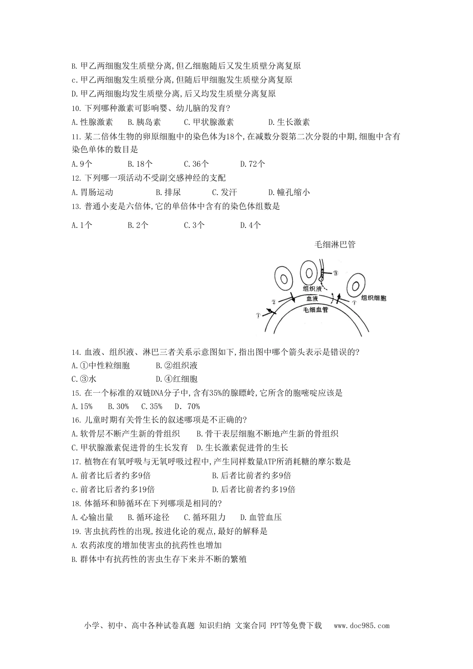 1993年陕西高考生物真题及答案一、选择题:本大题共28个小题,每小题一分,共28分。在每小题给出的四个选项中,只有一项是符合题目要求的,把所选项前的字母填在括号内。1.线粒体、叶绿体和内质网都具有A.基粒B.基质C.膜结构D.少量DNA2.下列哪一项属于消化道传染病?A.丝虫病B.伤寒C.炭疽D.流行性腮腺炎3.父本基因型为AABb,母本基因型为AaBb,其F1不可能出现的基因型是A.aabbB.AABbC.AaBbD.AAbb4.胃对下列食物的排空时间由短到长的顺序是A.蛋白质、糖、脂肪B.糖、脂肪、蛋白质C.糖、蛋白质、脂肪D.脂肪、糖、蛋白质5.在下列系谱中,遗传病最可能的遗传为A.X染色体显性遗传B.X染色体隐性遗传C.常染色体显性遗传D.Y染色体遗传○正常女性□正常男性■患病男性6.关于消化的描述,下列哪项是正确的?A.物理性消化改变营养物质的化学组成,化学性消化不改变营养物质的化学组成B.物理性消化不改变营养物质的化学组成,化学性消化改变营养物质的化学组成C.物理性消化和化学性消化均改变营养物质的化学组成D.物理性消化和化学性消化均不改变营养物质的化学组成7.下列哪项不是达尔文的进化观点?A.同种生物不同个体之间在许多性状上存在差异.B.生物产生后代的数量往往超过生活条件所能承受的数量C.不适应生存环境的生物会被淘汰D.适应是环境作用的结果8.种群是指在一定地域内A.同种生物的幼体和成体个数的总和B.所有生物个体的总和C.同种生物成体个数的总和D.同种生物未成熟个体的总和9.假定将甲乙两个植物细胞分别放入蔗糖溶液和甘油溶液中,两种溶液均比细胞液的浓度高,蔗糖分子不能透过膜,甘油分子可以较快地透过膜,在显微镜下连续观察甲乙两细胞的变化是A.甲乙两细胞发生质壁分离后,不发生质壁分离复原小学、初中、高中各种试卷真题知识归纳文案合同PPT等免费下载www.doc985.comB.甲乙两细胞发生质壁分离,但乙细胞随后又发生质壁分离复原c.甲乙两细胞发生质壁分离,但随后甲细胞发生质壁分离复原D.甲乙两细胞均发生质壁分离,后又均发生质壁分离复原10.下列哪种激素可影响婴、幼儿脑的发育?A.性腺激素B.胰岛素C.甲状腺激素D.生长激素11.某二倍体生物的卵原细胞中的染色体为18个,在减数分裂第二次分裂的中期,细胞中含有染色单体的数目是A.9个B.18个C.36个D.72个12.下列哪一项活动不受副交感神经的支配A.胃肠运动B.排尿C.发汗D.幢孔缩小13.普通小麦是六倍体,它的单倍体中含有的染色体组数是A.1个B.2个C.3个D.4个毛细淋巴管14.血液、组织液、淋巴三者关系示意图如下,指出图中哪个箭头表示是错误的?A.①中性粒细胞B.②组织液C.③水D.④红细胞15.在一个标准的双链DNA分子中,含有35%的腺瞟岭,它所含的胞嘧啶应该是A.15%B.30%C.35%D.70%16.儿童时期有关骨生长的叙述哪项是不正确的?A.软骨层不断产生新的骨组织B.骨干表层细胞不断地产生新的骨组织C.甲状腺激素促进骨的生长发育D.生长激素促进骨的生长17.植物在有氧呼吸与无氧呼吸过程中,产生同样数量ATP所消耗糖的摩尔数是A.前者比后者约多9倍B.后者比前者约多9倍c.前者比后者约多19倍D.后者比前者约多19倍18.体循环和肺循环在下列哪项是相同的?A.心输出量B.循环途径C.循环阻力D.血管血压19.害虫抗药性的出现,按进化论的观点,最好的解释是A.农药浓度的增加使害虫的抗药性也增加B.群体中有抗药性的害虫生存下来并不断的繁殖小学、初中、高中各种试卷真题知识归纳文案合同PPT等免费下载www.doc985.comC.这一农药使害虫都产生了抗药性D.农药引起害虫的抗药能力,可在后代中不断积累而增强20.有关激素作用的叙述下列哪项是不正确的?A.激素能促进人体细胞的生长B.激素能促进人体的发育C.激素能促使男、女性成熟D.激素是参加体液调节的唯一的化学物质21.已知黑尿症由常染色体隐性基因控制,两个都带有黑尿症基因的正常男女结婚,预测他们的孩子患黑尿症的几率是A.12.5%B.25%C.50%D.75%22.关于脊神经组成的叙述哪项是确切的?A.脊神经与脊髓相连B.脊神经出椎间孔由脊神经节组成c.前、后根合成脊神经,是混合神经D.脊神经分布是左右对称的23.下列哪一种方法能增强生态系统的自动调节能力?A.减少捕食者和寄生生物的数量B.使生产者和消费者在数量上保持平衡c.增加生物的种类D.减...