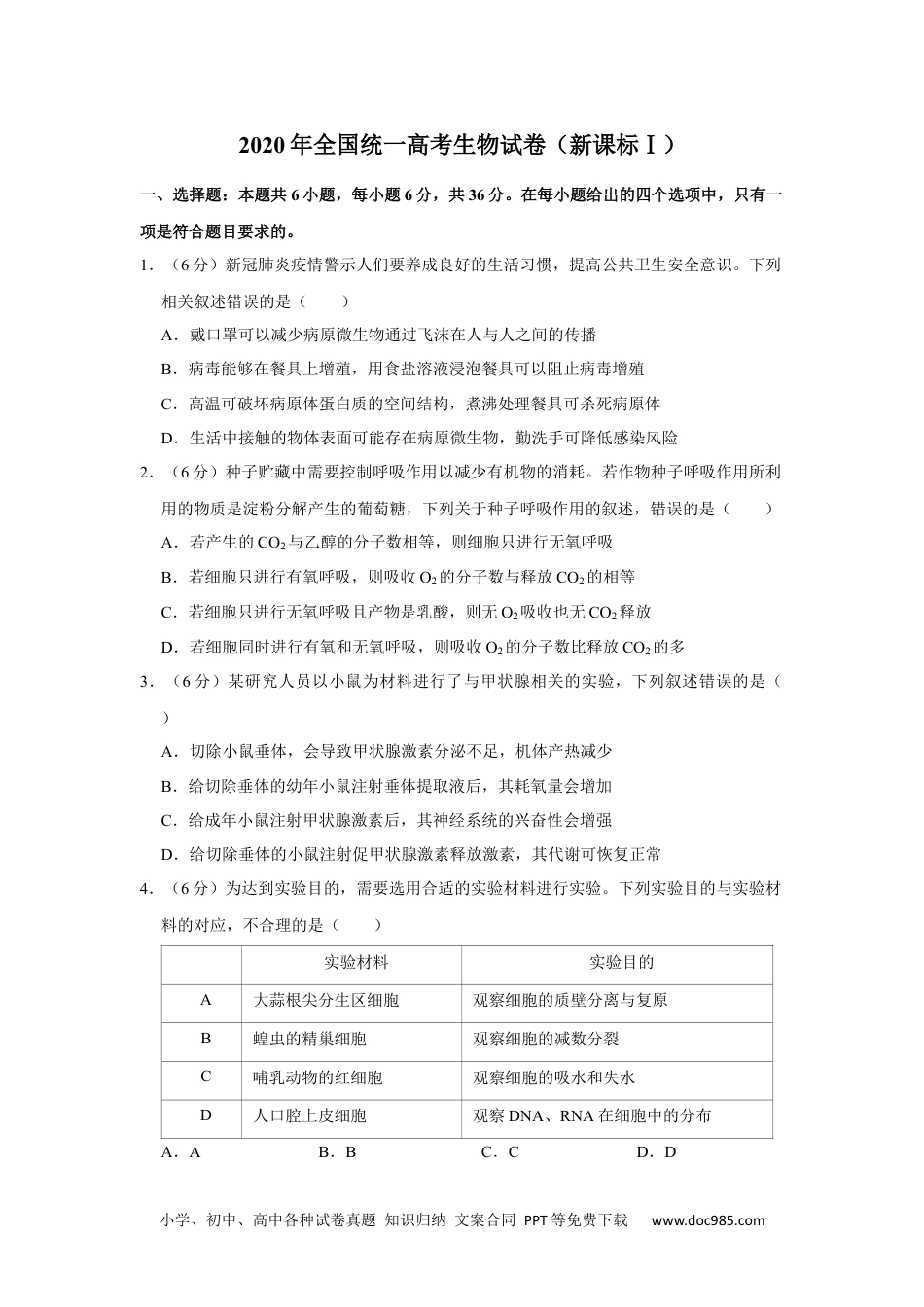 小学、初中、高中各种试卷真题知识归纳文案合同PPT等免费下载www.doc985.com2020年全国统一高考生物试卷(新课标Ⅰ)一、选择题:本题共6小题,每小题6分,共36分。在每小题给出的四个选项中,只有一项是符合题目要求的。1.(6分)新冠肺炎疫情警示人们要养成良好的生活习惯,提高公共卫生安全意识。下列相关叙述错误的是()A.戴口罩可以减少病原微生物通过飞沫在人与人之间的传播B.病毒能够在餐具上增殖,用食盐溶液浸泡餐具可以阻止病毒增殖C.高温可破坏病原体蛋白质的空间结构,煮沸处理餐具可杀死病原体D.生活中接触的物体表面可能存在病原微生物,勤洗手可降低感染风险2.(6分)种子贮藏中需要控制呼吸作用以减少有机物的消耗。若作物种子呼吸作用所利用的物质是淀粉分解产生的葡萄糖,下列关于种子呼吸作用的叙述,错误的是()A.若产生的CO2与乙醇的分子数相等,则细胞只进行无氧呼吸B.若细胞只进行有氧呼吸,则吸收O2的分子数与释放CO2的相等C.若细胞只进行无氧呼吸且产物是乳酸,则无O2吸收也无CO2释放D.若细胞同时进行有氧和无氧呼吸,则吸收O2的分子数比释放CO2的多3.(6分)某研究人员以小鼠为材料进行了与甲状腺相关的实验,下列叙述错误的是()A.切除小鼠垂体,会导致甲状腺激素分泌不足,机体产热减少B.给切除垂体的幼年小鼠注射垂体提取液后,其耗氧量会增加C.给成年小鼠注射甲状腺激素后,其神经系统的兴奋性会增强D.给切除垂体的小鼠注射促甲状腺激素释放激素,其代谢可恢复正常4.(6分)为达到实验目的,需要选用合适的实验材料进行实验。下列实验目的与实验材料的对应,不合理的是()实验材料实验目的A大蒜根尖分生区细胞观察细胞的质壁分离与复原B蝗虫的精巢细胞观察细胞的减数分裂C哺乳动物的红细胞观察细胞的吸水和失水D人口腔上皮细胞观察DNA、RNA在细胞中的分布A.AB.BC.CD.D小学、初中、高中各种试卷真题知识归纳文案合同PPT等免费下载www.doc985.com5.(6分)已知果蝇的长翅和截翅由一对等位基因控制。多只长翅果蝇进行单对交配(每个瓶中有1只雌果蝇和1只雄果蝇),子代果蝇中长翅:截翅=3:1.据此无法判断的是()A.长翅是显性性状还是隐性性状B.亲代雌蝇是杂合子还是纯合子C.该等位基因位于常染色体还是X染色体上D.该等位基因在雌蝇体细胞中是否成对存在6.(6分)土壤小动物对动植物遗体的分解起着重要的作用。下列关于土壤小动物的叙述,错误的是()A.调查身体微小、活动力强的小动物数量常用标志重捕法B.土壤中小动物类群的丰富度高,则该类群含有的物种数目多C.土壤小动物的代谢活动会影响土壤肥力,进而影响植物生长D.土壤小动物呼吸作用产生的CO2参与生态系统中的碳循环二、非选择题:共54分。第7~10题为必考题,每个试题考生都必须作答。第11、12题为选考题,考生根据要求作答。(一)必考题:共39分。7.(10分)真核细胞的膜结构具有重要功能。请参照表中内容完成下表。结构名称突触高尔基体(1)叶绿体的类囊体膜功能(2)(3)控制物质进出细胞作为能量转换的场所膜的主要成分(4)功能举例在缩手反射中参与兴奋在神经元之间的传递参与豚鼠胰腺腺泡细胞分泌蛋白的形成过程参与K+从土壤进入植物根细胞的过程(5)8.(10分)农业生产中的一些栽培措施可以影响作物的生理活动,促进作物的生长发育,达到增加产量等目的。回答下列问题:(1)中耕是指作物生长期中,在植株之间去除杂草并进行松土的一项栽培措施,该栽培措施对作物的作用有(答出2点即可)。(2)农田施肥的同时,往往需要适当的浇水,此时浇水的原因是(答出1点即小学、初中、高中各种试卷真题知识归纳文案合同PPT等免费下载www.doc985.com可)。(3)农业生产常采用间作(同一生长期内,在同一块农田上间隔种植两种作物)的方法提高农田的光能利用率。现有4种作物,在正常条件下生长能达到的株高和光饱和点(光合速率达到最大时所需的光照强度)见下表。从提高光能利用率的角度考虑,最适合进行间作的两种作物是,选择这两种作物的理由是。作物ABCD株高/cm1706559165光饱和点/μmol•m2﹣•s1﹣120011805606239.(10分)某研究人员用药...