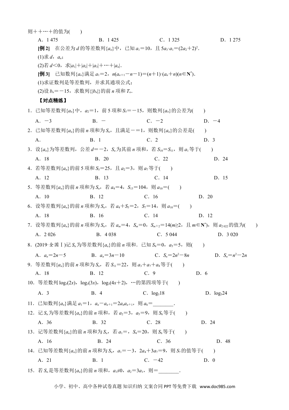 专题06等差数列基本量的计算1.等差数列的有关概念(1)等差数列的定义一般地,如果一个数列从第2项起,每一项与它的前一项的差都等于同一个常数,那么这个数列就叫做等差数列,这个常数叫做等差数列的公差,通常用字母d表示,定义表达式为an-an-1=d(常数)(n≥2,n∈N*)或an+1-an=d(常数)(n∈N*).(2)等差中项若三个数,a,A,b成等差数列,则A叫做a与b的等差中项,且有A=.2.等差数列的有关公式(1)通项公式:an=a1+(n-1)d.(2)前n项和公式:Sn=na1+d或Sn=.【基本方法】解决等差数列基本量计算问题的方法(1)在等差数列{an}中,a1与d是最基本的两个量,一般可设出a1和d,利用等差数列的通项公式和前n项和公式列方程(组)求解即可.(2)与等差数列有关的基本运算问题,主要围绕着通项公式an=a1+(n-1)d和前n项和公式Sn==na1+d,在这两个公式中共涉及五个量:a1,d,n,an,Sn,已知其中三个量,选用恰当的公式,利用方程(组)可求出剩余的两个量.【基本题型】[例1](1)(2017·全国Ⅰ)记Sn为等差数列{an}的前n项和.若a4+a5=24,S6=48,则{an}的公差为()A.1B.2C.4D.8(2)(2018·全国Ⅰ)记Sn为等差数列{an}的前n项和.若3S3=S2+S4,a1=2,则a5=()A.-12B.-10C.10D.12(3)(2014·福建)等差数列{an}的前n项和为Sn,若a1=2,S3=12,则a6等于()A.8B.10C.12D.14(4)(2016·全国Ⅰ)已知等差数列{an}前9项的和为27,a10=8,则a100=()A.100B.99C.98D.97(5)设数列{an}满足a1=1,a2=2,且2nan=(n-1)an-1+(n+1)an+1(n≥2且n∈N*),则a18=()A.B.C.3D.(6)设等差数列{an}的前n项和为Sn,S3=6,S4=12,则S6=________.(7)(2020·全国Ⅱ)记Sn为等差数列{an}的前n项和.若a1=-2,a2+a6=2,则S10=________.(8)(2020·新高考Ⅰ)将数列{2n-1}与{3n-2}的公共项从小到大排列得到数列{an},则{an}的前n项和为________.(9)(2013·全国Ⅰ)设等差数列{an}的前n项和为Sn,Sm-1=-2,Sm=0,Sm+1=3,则m等于()A.3B.4C.5D.6(10)数列{an}不是常数列,满足a1=,a5=,且a1a2+a2a3+…+anan+1=na1an+1对任何的正整数n都成立,小学、初中、高中各种试卷真题知识归纳文案合同PPT等免费下载www.doc985.com则++…+的值为()A.1475B.1425C.1325D.1275[例2]在公差为d的等差数列{an}中,已知a1=10,且5a3·a1=(2a2+2)2.(1)求d,an;(2)若d<0,求|a1|+|a2|+|a3|+…+|an|.[例3]已知数列{an}满足a1=2,n(an+1-n-1)=(n+1)·(an+n)(n∈N*).(1)求证数列是等差数列,并求其通项公式;(2)设bn=-15,求数列{|bn|}的前n项和Tn.【对点精练】1.已知等差数列{an}中,a2=1,前5项和S5=-15,则数列{an}的公差为()A.-3B.-C.-2D.-42.已知等差数列{an}的前n项和为Sn,且满足-=1,则数列{an}的公差是()A.B.1C.2D.33.设{an}为等差数列,公差d=-2,Sn为其前n项和,若S10=S11,则a1等于()A.18B.20C.22D.244.若等差数列{an}的前5项和S5=25,且a2=3,则a7等于()A.12B.13C.14D.155.等差数列{an}的前n项和为Sn,若a4=4,S13=104,则a10=()A.10B.12C.16D.206.设等差数列{an}的前n项和为Sn,若a4+S5=2,S7=14,则a10=()A.18B.16C.14D.127.设等差数列{an}的前n项和为Sn,若am=4,Sm=0,Sm+2=14(m≥2,且m∈N*),则a2022的值为()A.2026B.4038C.5044D.30208.(2019·全国Ⅰ)记Sn为等差数列{an}的前n项和.已知S4=0,a5=5,则()A.an=2n-5B.an=3n-10C.Sn=2n2-8nD.Sn=n2-2n9.等差数列{an}的前n项和为Sn,若S11=22,则a3+a7+a8等于()A.18B.12C.9D.610.等差数列log3(2x),log3(3x),log3(4x+2),…的第四项等于()A.3B.4C.log318D.log32411.已知数列{an}满足a1=1,an-an+1=2anan+1,则a6=________.12.记Sn为等差数列{an}的前n项和,若a2=3,a5=9,则S6等于()A.36B.32C.28D.2413.记等差数列{an}的前n项和为Sn,若a1=,S4=20,则S6等于()A.16B.24C.36D.4814.已知等差数列{an}的前n项和为Sn,a1=-3,2a4+3a7=9,则S7的值等于()A.21B...