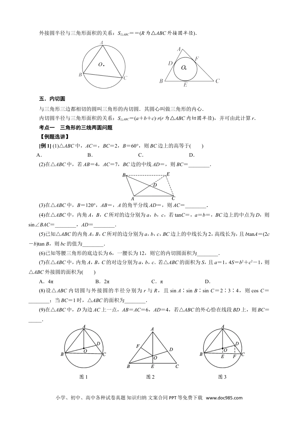 专题二三角形的三线两圆及面积问题一.中线中线定理:一条中线两侧所对边的平方和等于底边平方的一半与该边中线平方的2倍.即:如图,在中,为中点,则.证明在中,,在中,..另外已知两边及其夹角也可表述为:.证明由,,.二.角平分线角平分线定理:如图,在中,是的平分线,则.证法1在中,,在中,,.证法2该结论可以由两三角形面积之比得证,即.三.高高的性质:分别为边上的高,则求高一般采用等面积法,即求某边上的高,需要求出面积和底边长度.四.外接圆过三角形三个顶点的圆叫三角形的外接圆.其圆心叫做三角形的外心.外接圆半径的计算:R===.小学、初中、高中各种试卷真题知识归纳文案合同PPT等免费下载www.doc985.com外接圆半径与三角形面积的关系:S△ABC==(R为△ABC外接圆半径).五.内切圆与三角形三边都相切的圆叫三角形的内切圆.其圆心叫做三角形的内心.内切圆半径与三角形面积的关系:S△ABC=(a+b+c)·r(r为△ABC内切圆半径),并可由此计算r.考点一三角形的三线两圆问题【例题选讲】[例1](1)△ABC中,AC=,BC=2,B=60°,则BC边上的高等于()A.B.C.D.(2)在△ABC中,若AB=4,AC=7,BC边的中线AD=,则BC=________.(3)在△ABC中,B=120°,AB=,A的角平分线AD=,则AC=________.(4)在△ABC中,内角A,B,C所对的边分别为a,b,c,若tanC=,a=b=,BC边上的中点为D,则sin∠BAC=________,AD=________.(5)已知△ABC的内角A,B,C所对的边分别为a,b,c,BC边上的中线长为2,高线长为,且btanA=(2c-b)tanB,则bc的值为________.(6)已知等腰三角形的底边长为6,一腰长为12,则它的内切圆面积为________.(7)在△ABC中,内角A,B,C的对边分别为a,b,c.若△ABC的面积为S,且a=1,4S=b2+c2-1,则△ABC外接圆的面积为()A.4πB.2πC.πD.(8)设△ABC内切圆与外接圆的半径分别为r与R,且sinA∶sinB∶sinC=2∶3∶4,则cosC=________;当BC=1时,△ABC的面积为________.(9)在△ABC中,D为边AC上一点,AB=AC=6,AD=4,若△ABC的外心恰在线段BD上,则BC=_____.图1图2图3小学、初中、高中各种试卷真题知识归纳文案合同PPT等免费下载www.doc985.com(10)已知△ABC的外接圆半径为R,且满足2R(sin2A-sin2C)=(a-b)·sinB,则△ABC面积的最大值为________.【对点训练】1.在△ABC中,AB=3,BC=,AC=4,则AC边上的高为________.2.如图所示,在△ABC中,已知BC=15,AB∶AC=7∶8,sinB=,则BC边上的高AD的长为_____.3.(2016·全国Ⅲ)在△ABC中,B=,BC边上的高等于BC,则cosA=()A.B.C.-D.-4.在锐角△ABC中,内角,所对的边分别为a,b,c,b=4,c=6且asinB=2,D为BC的中点,则AD的长为________.5.在△ABC中,AB=7,AC=6,M是BC的中点,AM=4,则BC等于________.6.在△ABC中,AD为边BC上的中线,AB=1,AD=5,∠ABC=45°,则sin∠ADC=________,AC=________.7.在△ABC中,已知AB=,cos∠ABC=,AC边上的中线BD=,则sinA的值________.8.在△ABC中,A=105°,B=30°,a=,则B的角平分线的长是________.9.已知△ABC的内角A,B,C的对边分别为a,b,c,A=60°,b=3c,角A的平分线交BC于点D,且BD=,则cos∠ADB的值为()A.-B.C.D.±10.在△ABC中,角A,B,C的对边分别是a,b,c,已知A=,b=1,△ABC的外接圆半径为1,则△ABC的面积S=________.11.在△ABC中,内角A,B,C所对的边分别为a,b,c,a=1,B=45°,S△ABC=2,则△ABC的外接圆直径为________.12.△ABC的两边长分别为2,3,其夹角的余弦值为,则其外接圆的直径为________.13.已知三角形两边长分别为1和,第三边上的中线长为1,则三角形的外接圆半径为________.14.△ABC的内角A,B,C的对边分别为a,b,c,若cosC=,bcosA+acosB=2,则△ABC的外接圆面积为()A.4πB.8πC.9πD.36π15.已知圆的半径为4,a,b,c为该圆的内接三角形的三边,若abc=16,则三角形的面积为________.16.如图所示,已知圆内接四边形ABCD中AB=3,AD=5,BD=7,∠BDC=45°,则BC=________.17.在外接圆半径为的...