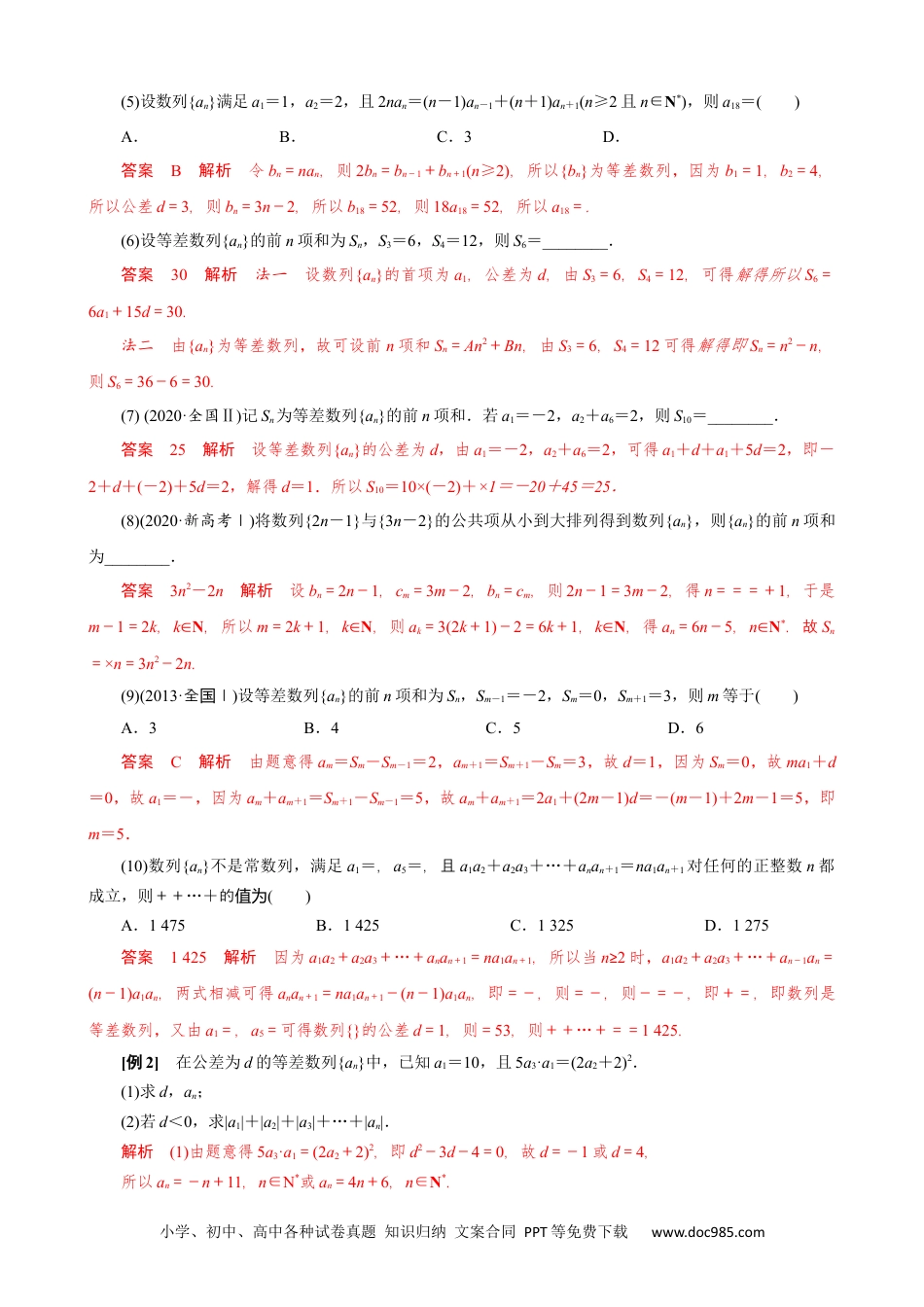 小学、初中、高中各种试卷真题知识归纳文案合同PPT等免费下载www.doc985.com专题06等差数列基本量的计算1.等差数列的有关概念(1)等差数列的定义一般地,如果一个数列从第2项起,每一项与它的前一项的差都等于同一个常数,那么这个数列就叫做等差数列,这个常数叫做等差数列的公差,通常用字母d表示,定义表达式为an-an-1=d(常数)(n≥2,n∈N*)或an+1-an=d(常数)(n∈N*).(2)等差中项若三个数,a,A,b成等差数列,则A叫做a与b的等差中项,且有A=.2.等差数列的有关公式(1)通项公式:an=a1+(n-1)d.(2)前n项和公式:Sn=na1+d或Sn=.【基本方法】解决等差数列基本量计算问题的方法(1)在等差数列{an}中,a1与d是最基本的两个量,一般可设出a1和d,利用等差数列的通项公式和前n项和公式列方程(组)求解即可.(2)与等差数列有关的基本运算问题,主要围绕着通项公式an=a1+(n-1)d和前n项和公式Sn==na1+d,在这两个公式中共涉及五个量:a1,d,n,an,Sn,已知其中三个量,选用恰当的公式,利用方程(组)可求出剩余的两个量.【基本题型】[例1](1)(2017·全国Ⅰ)记Sn为等差数列{an}的前n项和.若a4+a5=24,S6=48,则{an}的公差为()A.1B.2C.4D.8答案C解析设等差数列{an}的公差为d,则由得即解得d=4.(2)(2018·全国Ⅰ)记Sn为等差数列{an}的前n项和.若3S3=S2+S4,a1=2,则a5=()A.-12B.-10C.10D.12答案B解析由3S3=S2+S4,得:3(a1+a2+a3)=a1+a2+a1+a2+a3+a4,∴a1+a2+2a3=a4,设公差为d,则4a1+5d=a1+3d,∴d=-a1=-3.∴a5=a1+4d=2+4×(-3)=-10.(3)(2014·福建)等差数列{an}的前n项和为Sn,若a1=2,S3=12,则a6等于()A.8B.10C.12D.14答案C解析由题意知a1=2,由S3=3a1+×d=12,解得d=2,所以a6=a1+5d=2+5×2=12,故选C.(4)(2016·全国Ⅰ)已知等差数列{an}前9项的和为27,a10=8,则a100=()A.100B.99C.98D.97答案C解析设等差数列{an}的公差为d,由已知,得所以所以a100=a1+99d=-1+99=98.小学、初中、高中各种试卷真题知识归纳文案合同PPT等免费下载www.doc985.com(5)设数列{an}满足a1=1,a2=2,且2nan=(n-1)an-1+(n+1)an+1(n≥2且n∈N*),则a18=()A.B.C.3D.答案B解析令bn=nan,则2bn=bn-1+bn+1(n≥2),所以{bn}为等差数列,因为b1=1,b2=4,所以公差d=3,则bn=3n-2,所以b18=52,则18a18=52,所以a18=.(6)设等差数列{an}的前n项和为Sn,S3=6,S4=12,则S6=________.答案30解析法一设数列{an}的首项为a1,公差为d,由S3=6,S4=12,可得解得所以S6=6a1+15d=30.法二由{an}为等差数列,故可设前n项和Sn=An2+Bn,由S3=6,S4=12可得解得即Sn=n2-n,则S6=36-6=30.(7)(2020·全国Ⅱ)记Sn为等差数列{an}的前n项和.若a1=-2,a2+a6=2,则S10=________.答案25解析设等差数列{an}的公差为d,由a1=-2,a2+a6=2,可得a1+d+a1+5d=2,即-2+d+(-2)+5d=2,解得d=1.所以S10=10×(-2)+×1=-20+45=25.(8)(2020·新高考Ⅰ)将数列{2n-1}与{3n-2}的公共项从小到大排列得到数列{an},则{an}的前n项和为________.答案3n2-2n解析设bn=2n-1,cm=3m-2,bn=cm,则2n-1=3m-2,得n===+1,于是m-1=2k,k∈N,所以m=2k+1,k∈N,则ak=3(2k+1)-2=6k+1,k∈N,得an=6n-5,n∈N*.故Sn=×n=3n2-2n.(9)(2013·全国Ⅰ)设等差数列{an}的前n项和为Sn,Sm-1=-2,Sm=0,Sm+1=3,则m等于()A.3B.4C.5D.6答案C解析由题意得am=Sm-Sm-1=2,am+1=Sm+1-Sm=3,故d=1,因为Sm=0,故ma1+d=0,故a1=-,因为am+am+1=Sm+1-Sm-1=5,故am+am+1=2a1+(2m-1)d=-(m-1)+2m-1=5,即m=5.(10)数列{an}不是常数列,满足a1=,a5=,且a1a2+a2a3+…+anan+1=na1an+1对任何的正整数n都成立,则++…+的值为()A.1475B.1425C.1325D.1275答案1425解析因为a1a2+a2a3+…+anan+1=na1an+1,所以当n≥2时,a1a2+a2a3+…+an-1an=(n-1)a1an,两式相减可得anan+1=na1an+1-(n-1)a1an,...