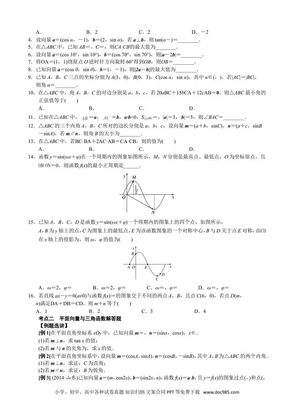 专题六平面向量与三角函数平面向量与三角函数综合问题的类型及求解思路(1)向量平行、垂直与三角函数综合此类题型的解答一般是利用向量平行(共线)、垂直关系得到三角函数式,再利用三角恒等变换对三角函数式进行化简,结合三角函数的图象与性质进行求解.(2)向量的模与三角函数综合此类题型主要是利用向量模的性质|a|2=a2,如果涉及向量的坐标,解答时可利用两种方法:一是先进行向量的运算,再代入向量的坐标进行求解;二是先将向量的坐标代入,再利用向量的坐标运算求解.此类题型主要表现为两种形式:①利用三角函数与向量的数量积直接联系;②利用三角函数与向量的夹角交汇,达到与数量积的综合.考点一平面向量与三角函数选填题【例题选讲】[例1](1)设向量a=(2cosθ,sinθ),向量b=(1,-6),且a·b=0,则等于________.(2)在△ABC中,BC=2,A=,则AB·AC的最小值为________.(3)已知向量a=(cos,sin),b=(cos,-sin),且x∈[-,],则|a+b|=________.(4)已知向量=(2,0),向量=(2,2),向量=(cosα,sinα),则向量与向量的夹角的取值范围是()A.B.C.D.(5)在平面直角坐标系xOy中,点P(,1),将向量OP绕点O按逆时针方向旋转后得到向量OQ,则点Q的坐标是()A.(-,1)B.(-1,)C.(-,1)D.(-1,)(6)已知a,b,c为△ABC的三个内角A,B,C的对边,向量m=(,-1),n=(cosA,sinA).若m⊥n,且acosB+bcosA=csinC,则角A,B的大小分别为()A.,B.,C.,D.,(7)若函数y=Asin(ωx+φ)(A>0,ω>0,|φ|<)在一个周期内的图象如图所示,M,N分别是这段图象的最高点和最低点,且·=0(O为坐标原点),则A等于()A.B.πC.πD.π(8)设向量a=(a1,a2),b=(b1,b2),定义一种向量积ab=(a1b1,a2b2),已知向量m=(2,),n=(,0),点P(x,y)在y=sinx的图象上运动,Q是函数y=f(x)图象上的点,且满足=m+n(其中O为坐标原点),则函数y=f(x)的值域是________.【对点训练】1.已知向量e1=,e2=,则e1·e2=________.2.已知向量a=(1-sinθ,1),b=,若a∥b,则锐角θ=________.3.已知向量m=(1,cosθ),n=(sinθ,-2),且m⊥n,则sin2θ+6cos2θ的值为()小学、初中、高中各种试卷真题知识归纳文案合同PPT等免费下载www.doc985.comA.B.2C.2D.-24.设向量a=(cosα,-1),b=(2,sinα),若a⊥b,则tan(α-)=________.5.在△ABC中,已知AB=,C=,则CA·CB的最大值为________.6.设向量a=(cos10°,sin10°),b=(cos70°,sin70°),则|a-2b|=________.7.将OA=(1,1)绕原点O逆时针方向旋转60°得到OB,则OB=________.8.已知向量a=(cosθ,sinθ),b=(,-1),则|2a-b|的最大值为________.9.已知A,B,C三点的坐标分别为A(3,0),B(0,3),C(cosα,sinα),其中α∈(,).若|AC|=|BC|,则角α=________.10.在△ABC中,角A,B,C的对边分别是a,b,c,若20aBC+15bCA+12cAB=0,则△ABC最小角的正弦值等于()A.B.C.D.11.已知在△ABC中,=a,=b,a·b<0,S△ABC=,|a|=3,|b|=5,则∠BAC=________.12.△ABC的三个内角A,B,C所对的边长分别是a,b,c,设向量m=(a+b,sinC),n=(a+c,sinB-sinA),若m∥n,则角B的大小为________.13.在△ABC中,若BC·BA+2AC·AB=CA·CB,则的值为()A.B.C.D.14.函数y=sin(ωx+φ)在一个周期内的图象如图所示,M,N分别是最高点、最低点,O为坐标原点,且OM·ON=0,则函数f(x)的最小正周期是______.15.已知A,B,C,D是函数y=sin(ωx+φ)一个周期内的图象上的四个点,如图所示,A,B为y轴上的点,C为图象上的最低点,E为该函数图象的一个对称中心,B与D关于点E对称,由CD在x轴上的投影为,则ω,φ的值为()A.ω=2,φ=B.ω=2,φ=C.ω=,φ=D.ω=,φ=16.若直线ax-y=0(a≠0)与函数f(x)=的图象交于不同的两点A,B,且点C(6,0),若点D(m,n)满足DA+DB=CD,则m+n等于()A.1B.2C.3D.4考点二平面向量与三角函数解答题【例题选讲】[例1]在平面直角坐标系xOy中,已知向量m=,n=(sinx,cosx),x∈.(1)若m⊥n,求tanx的值;(2)若...