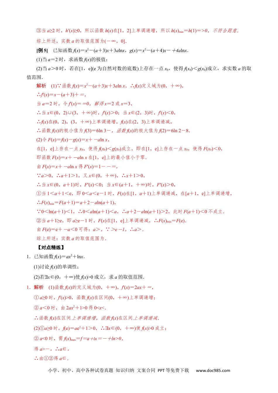 小学、初中、高中各种试卷真题知识归纳文案合同PPT等免费下载www.doc985.com专题34单变量不等式能成立之最值分析法【方法总结】单变量不等式能成立之最值分析法遇到f(x)≥g(x)型的不等式能成立问题时,一般采用作差法,构造“左减右”的函数h(x)=f(x)-g(x)或“右减左”的函数u(x)=g(x)-f(x),进而只需满足h(x)max≥0或u(x)min≤0,将比较法的思想融入函数中,转化为求解函数最值的问题,适用范围较广,但是往往需要对参数进行分类讨论.注意“恒成立”与“存在性”问题的求解是“互补”关系,即f(x)≥g(a)对于x∈D恒成立,应求f(x)的最小值;若存在x∈D,使得f(x)≥g(a)成立,应求f(x)的最大值.在具体问题中究竟是求最大值还是最小值,可以先联想“恒成立”是求最大值还是最小值,这样也就可以解决相应的“存在性”问题是求最大值还是最小值.注意与恒成立问题的区别.特别需要关注等号是否成立问题,以免细节出错.【例题选讲】[例1]设函数f(x)=2lnx-mx2+1.(1)讨论函数f(x)的单调性;(2)当f(x)有极值时,若存在x0,使得f(x0)>m-1成立,求实数m的取值范围.解析(1)函数f(x)的定义域为(0,+∞),f′(x)=-2mx=,当m≤0时,f′(x)>0,∴f(x)在(0,+∞)上单调递增;当m>0时,令f′(x)>0,得0<x<,令f′(x)<0,得x>,∴f(x)在上单调递增,在上单调递减.(2)由(1)知,当f(x)有极值时,m>0,且f(x)在上单调递增,在上单调递减.∴f(x)max=f=2ln-m·+1=-lnm,若存在x0,使得f(x0)>m-1成立,则f(x)max>m-1.即-lnm>m-1,lnm+m-1<0成立.令g(x)=x+lnx-1(x>0), g′(x)=1+>0,∴g(x)在(0,+∞)上单调递增,且g(1)=0,∴0<m<1.∴实数m的取值范围是(0,1).[例2]设f(x)=x--alnx(a∈R).(1)当a=1时,求曲线y=f(x)在点(,f())处的切线方程;(2)当a<1时,在内是否存在一实数x0,使f(x0)>e-1成立?解析(1)当a=1时,f(x)=x-lnx,f()=+ln2,f′(x)=1-,所以曲线y=f(x)在点处的切线的斜率为f′=1-=-1.故所求切线方程为y-=-,即x+y-ln2-1=0.(2)假设当a<1时,在内存在一实数x0,使f(x0)>e-1成立,则只需证明当x∈时,f(x)max>e-1即可.f′(x)=1+-==(x>0),令f′(x)=0得,x1=1,x2=a-1,当a<1时,a-1<0,∴当x∈时,f′(x)<0;当x∈(1,e)时,f′(x)>0.∴函数f(x)在上单调递减,在[1,e]上单调递增,∴f(x)max=max{f(),f(e)}.于是,只需证明f(e)>e-1或f()>e-1即可. f(e)-(e-1)=e--a-(e-1)=>0,∴f(e)>e-1成立.所以假设正确,即当a<1时,在x∈内至少存在一实数x0,使f(x0)>e-1成立.小学、初中、高中各种试卷真题知识归纳文案合同PPT等免费下载www.doc985.com[例3]已知f(x)=xeax-x2-x+1,a≠0.(1)当a=1时,求f(x)的单调区间;(2)若∃x0≥1,使f(x0)<成立,求参数a的取值范围.解析(1)当a=1时,f(x)=xex--x+1,所以f′(x)=ex+xex-x-1=(ex-1)(x+1).由f′(x)>0,得x<-1或x>0;由f′(x)<0,得-1<x<0.所以f(x)的单调递减区间为(-1,0),f(x)的单调递增区间为(-∞,-1),(0,+∞).(2)由题意,得f(x)min<(x≥1),因为f′(x)=(ax+1)(eax-1),由f′(x)=0,解得x1=-,x2=0.①当a>0时,因为x≥1,所以f′(x)>0,所以f(x)单调递增,即f(x)min=f(1).f(1)=ea-<,即ea-a<0.设g(a)=ea-a(a>0),g′(a)=ea-1>0.所以g(a)min>g(0)=e0-0=1>0,即ea>a恒成立,即g(a)>0,所以不等式ea-a<0无解;②当a<0时,当x∈(-∞,0)时,f′(x)>0;当x∈时,f′(x)<0;当x∈时,f′(x)>0.∴函数f(x)在(-∞,0)上单调递增,在上单调递减,在上单调递增.且f(0)=1>0,由①知f(1)>恒成立,若∃x0≥1,使f(x0)<,则所以所以解得1-<a<0.综上所述,参数a的取值范围为.[例4]已知函数f(x)=-alnx-+ax,a∈R.(1)当a<0时,讨论f(x)的单调性;(2)设g(x)=f(x)+xf′(x),若关于x的不等式g(x)≤-ex++(a-1)x在[1,2]上有解,求实数a的取值范围.解析(1)依题设,f′(x)=--+a=(x>0),当a<0时,ax-ex<0恒成立,所以当x>1时,f′(x)<0,当0<x<1时,f′(x)>0,故...