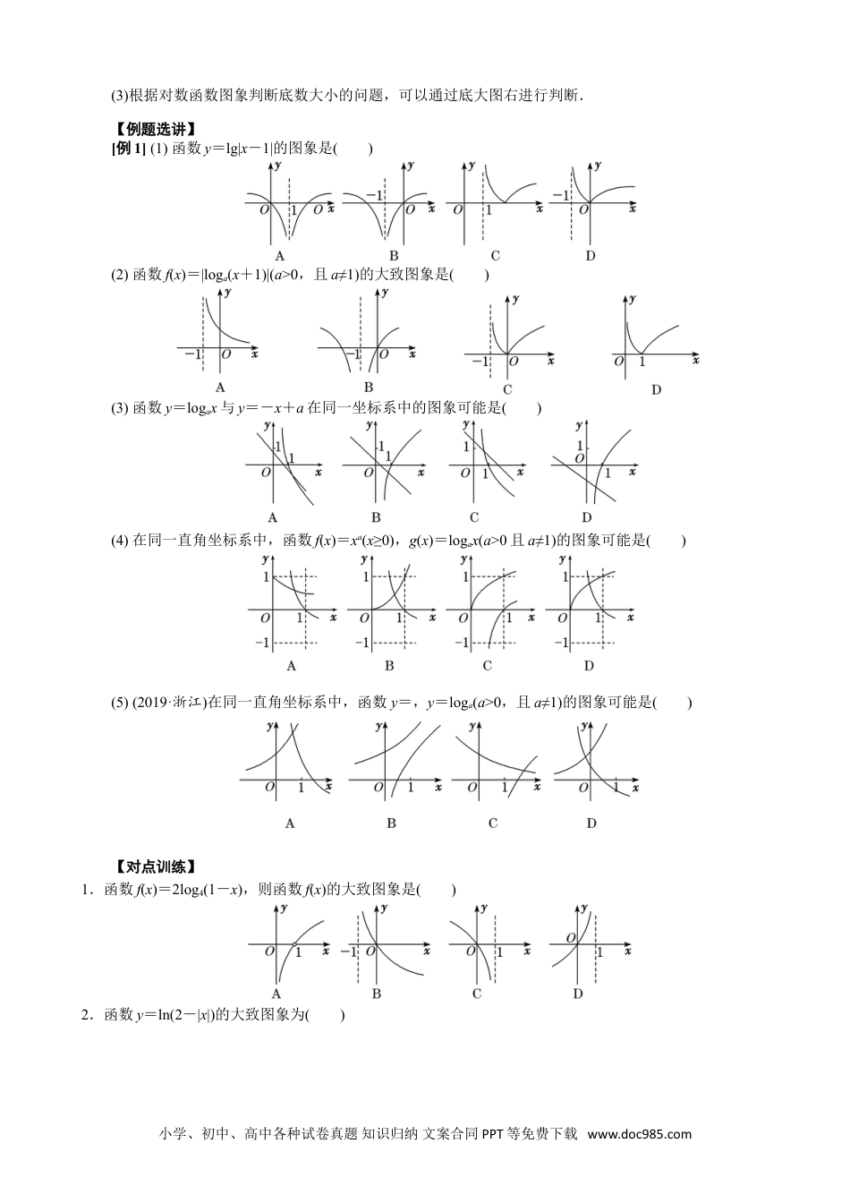 专题十三对数函数考点一对数函数图象辨析【基本知识】1.对数函数的概念函数y=logax(a>0,且a≠1)叫做对数函数,其中x是自变量,函数的定义域是(0,+∞).2.对数函数的图象函数y=logax,a>1y=logax,0<a<1图象图象特征在y轴右侧,过定点(1,0)当x逐渐增大时,图象是上升的当x逐渐增大时,图象是下降的3.指数函数与对数函数的关系指数函数y=ax(a>0,且a≠1)与对数函数y=logax(a>0,且a≠1)互为反函数,它们的图象关于直线y=x对称.【常用结论】(1)对数函数图象的画法画对数函数y=logax(a>0,且a≠1)的图象,应抓住三个关键点:(1,0),(a,1),和一条渐近线x=0.(2)底数a与1的大小关系决定了对数函数图象的“升降”:当a>1时,对数函数的图象“上升”;当0<a<1时,对数函数的图象“下降”.(3)函数y=logax与y=logx(a>0,且a≠1)的图象关于x轴对称.(4)对数函数的图象与底数大小的比较如图是对数函数(1)y=logax,(2)y=logbx,(3)y=logcx,(4)y=logdx的图象,底数a,b,c,d与1之间的大小关系为c>d>1>a>b>0.由此我们可得到以下规律:在第一象限内,对数函数y=logax(a>0,且a≠1)的图象越右,底数越大.简称“底大图右”.xy(4)(3)(2)(1)y=1O【方法总结】有关对数函数图象辨析的解题思路(1)已知函数解析式判断其图象,一般是取特殊点,判断选项中的图象是否过这些点,若不满足则排除.(2)对于有关对数型函数的图象问题,一般是从最基本的对数函数的图象入手,通过平移、伸缩、对称变换而得到.特别地,当底数a与1的大小关系不确定时应注意分类讨论.小学、初中、高中各种试卷真题知识归纳文案合同PPT等免费下载www.doc985.com(3)根据对数函数图象判断底数大小的问题,可以通过底大图右进行判断.【例题选讲】[例1](1)函数y=lg|x-1|的图象是()(2)函数f(x)=|loga(x+1)|(a>0,且a≠1)的大致图象是()(3)函数y=logax与y=-x+a在同一坐标系中的图象可能是()(4)在同一直角坐标系中,函数f(x)=xa(x≥0),g(x)=logax(a>0且a≠1)的图象可能是()(5)(2019·浙江)在同一直角坐标系中,函数y=,y=loga(a>0,且a≠1)的图象可能是()【对点训练】1.函数f(x)=2log4(1-x),则函数f(x)的大致图象是()2.函数y=ln(2-|x|)的大致图象为()小学、初中、高中各种试卷真题知识归纳文案合同PPT等免费下载www.doc985.com3.函数f(x)=lg的大致图象是()4.已知lga+lgb=0(a>0,且a≠1,b>0,且b≠1),则函数f(x)=ax与g(x)=-logbx的图象可能是()5.若函数y=a|x|(a>0,且a≠1)的值域为{y|y≥1},则函数y=loga|x|的图象大致是()考点二对数函数图象的应用【方法总结】一些对数型方程、不等式问题常转化为相应的函数图象问题,利用数形结合法求解.【例题选讲】[例2](1)已知当0<x≤时,有<logax,则实数a的取值范围为________.(2)当0<x≤时,4x<logax,则a的取值范围是()A.B.C.(1,)D.(,2)小学、初中、高中各种试卷真题知识归纳文案合同PPT等免费下载www.doc985.com(3)设方程10x=|lg(-x)|的两个根分别为x1,x2,则()A.x1x2<0B.x1x2=0C.x1x2>1D.0<x1x2<1(4)已知函数f(x)=关于x的方程f(x)+x-a=0有且只有一个实根,则实数a的取值范围是__________.(5)(2018·全国Ⅲ)下列函数中,其图象与函数y=lnx的图象关于直线x=1对称的是()A.y=ln(1-x)B.y=ln(2-x)C.y=ln(1+x)D.y=ln(2+x)【对点训练】6.已知函数f(x)=lnx,g(x)=lgx,h(x)=log3x,直线y=a(a<0)与这三个函数图象的交点的横坐标分别是x1,x2,x3,则x1,x2,x3的大小关系是()A.x2<x3<x1B.x1<x3<x2C.x1<x2<x3D.x3<x2<x17.已知函数f(x)=loga2x+b-1(a>0,a≠1)的图象如图所示,则a,b满足的关系是()A.0<a-1<b<1B.0<b<a-1<1C.0<b-1<a<1D.0<a-1<b-1<18.不等式x2<logax(a>0,且a≠1)对x∈恒成立,求实数a的取值范围.9.设f(x)=|ln(x+1)|,已知f(a)=f(b)(a<b),则()A.a+b>0B.a+b>1C.2a+b>0D.2a+b>110.若f(x)=lgx,g(x)=f(|x|),则g(lgx)>g(1)时,x的取值范围是()A.∪(10,+∞)B.[1,2)C.∪[10,+∞)D.(10,+∞)11.已知函数f(x)=|lgx|.若0<a<b...