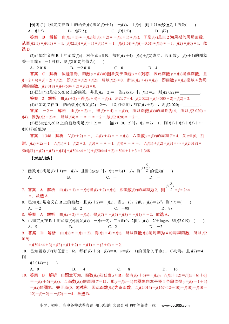 小学、初中、高中各种试卷真题知识归纳文案合同PPT等免费下载www.doc985.com专题六函数的周期性1.周期函数的定义对于函数y=f(x),如果存在一个非零常数T,使得当x取定义域内的任何值时,都有f(x+T)=f(x),那么就称函数y=f(x)为周期函数,称T为这个函数的周期.如果T是函数y=f(x)的周期,则kT(k∈Z且k≠0)也是y=f(x)的周期,即f(x+kT)=f(x);如果在周期函数f(x)的所有周期中存在一个最小的正数,那么这个最小正数就叫做f(x)的最小正周期.2.函数周期性常用的结论结论1:若f(x+a)=f(x-a),则f(x)的一个周期为2a;结论2:若f(x+a)=-f(x),则f(x)的一个周期为2a;结论3:若f(x+a)+f(x)=c(a≠0),则f(x)的一个周期为2a;结论4:若f(x)=f(x+a)+f(x-a)(a≠0),则f(x)的一个周期为6a;结论5:若f(x+a)=,则f(x)的一个周期为2a;结论6:若f(x+a)=-,则f(x)的一个周期为2a;结论7:若函数f(x)关于直线x=a与x=b对称,则f(x)的一个周期为2|b-a|.结论8:若函数f(x)关于点(a,0)对称,又关于点(b,0)对称,则f(x)的一个周期为2|b-a|.结论9:若函数f(x)关于直线x=a对称,又关于点(b,0)对称,则f(x)的一个周期为4|b-a|.结论7—结论9的记忆:两次对称成周期,两轴两心二倍差,一轴一心四倍差.总规律:在函数的奇偶性、对称性、周期性中,知二断一.即这三条性质中,只要已知两条,则第三条一定成立.考点一已知函数的周期性(显性的),求函数值【方法总结】利用函的周期性,可其他上的求等,化到已知上,而解.数将区间值问题转区间进决问题【例题选讲】[例1](1)若f(x)是R上周期为2的函数,且满足f(1)=1,f(2)=2,则f(3)-f(4)=__________.答案-1解析由f(x+2)=f(x)可得f(3)-f(4)=f(1)-f(2)=1-2=-1.(2)设f(x)是定义在R上的周期为3的函数,当x∈[-2,1)时,f(x)=则f=________.答案解析由意可得题f=f=f=4×2-2=,f=.(3)(2016·江苏)设f(x)是定义在R上且周期为2的函数,在区间[-1,1)上,f(x)=其中a∈R.若=,则f(5a)的值是________.答案-解析:由意可得题=f=-+a,=f==,-则+a=,a=,故f(5a)=f(3)=f(-1)=-1+=-.(4)(2018·江苏)函数f(x)满足f(x+4)=f(x)(x∈R),且在区间(-2,2]上,f(x)=则f(f(15))的值为________.答案解析由函数f(x)足满f(x+4)=f(x)(x∈R),可知函数f(x)的周期是4,所以f(15)=f(-1)==,所以f(f(15))=f=cos=.(5)定义在R上的函数f(x),满足f(x+5)=f(x),当x∈(-3,0]时,f(x)=-x-1,当x∈(0,2]时,f(x)=log2x,则f(1)+f(2)+f(3)+…+f(2019)的值等于()A.403B.405C.806D.809答案B解析定在义R上的函数f(x),足满f(x+5)=f(x),即函数f(x)的周期为5.又当x∈(0,2]时,小学、初中、高中各种试卷真题知识归纳文案合同PPT等免费下载www.doc985.comf(x)=log2x,所以f(1)=log21=0,f(2)=log22=1.当x∈(-3,0],时f(x)=-x-1,所以f(3)=f(-2)=1,f(4)=f(-1)=0,f(5)=f(0)=-1.故f(1)+f(2)+f(3)+…+f(2019)=403×[f(1)+f(2)+f(3)+f(4)+f(5)]+f(2016)+f(2017)+f(2018)+f(2019)=403×1+f(1)+f(2)+f(3)+f(4)=403+0+1+1+0=405.【对点训练】1.已知f(x)是R上最小正周期为2的周期函数,且当0≤x<2时,f(x)=x3-x,则函数y=f(x)的图象在区间[0,6]上与x轴的交点个数为________.1.答案7解析因为当0≤x<2,时f(x)=x3-x.又f(x)是R上最小正周期为2的周期函,且数f(0)=0,则f(6)=f(4)=f(2)=f(0)=0.又f(1)=0,∴f(3)=f(5)=f(1)=0,故函数y=f(x)的象在图区间[0,6]上与x的交点有轴7.个2.设f(x)是定义在R上且周期为2的函数,在区间[-1,1]上,f(x)=其中a,b∈R.若f=f,则a+3b的值为________.2.答案-10解析因为f(x)是定在义R上且周期为2的函,所以数f=f且f(-1)=f(1),故f=f,而=-从a+1,即3a+2b=-2,①.由f(-1)=f(1),得-a+1=,即b=-2a,②.由①②得a=2,b=-4,而从a+3b=-10.3.已知函数f(x)=如果任意的对n∈N*,定义fn(x)=,那么f2019(2)的值为()A.0B.1C.2D.33.答案C解析 f1(2)...
