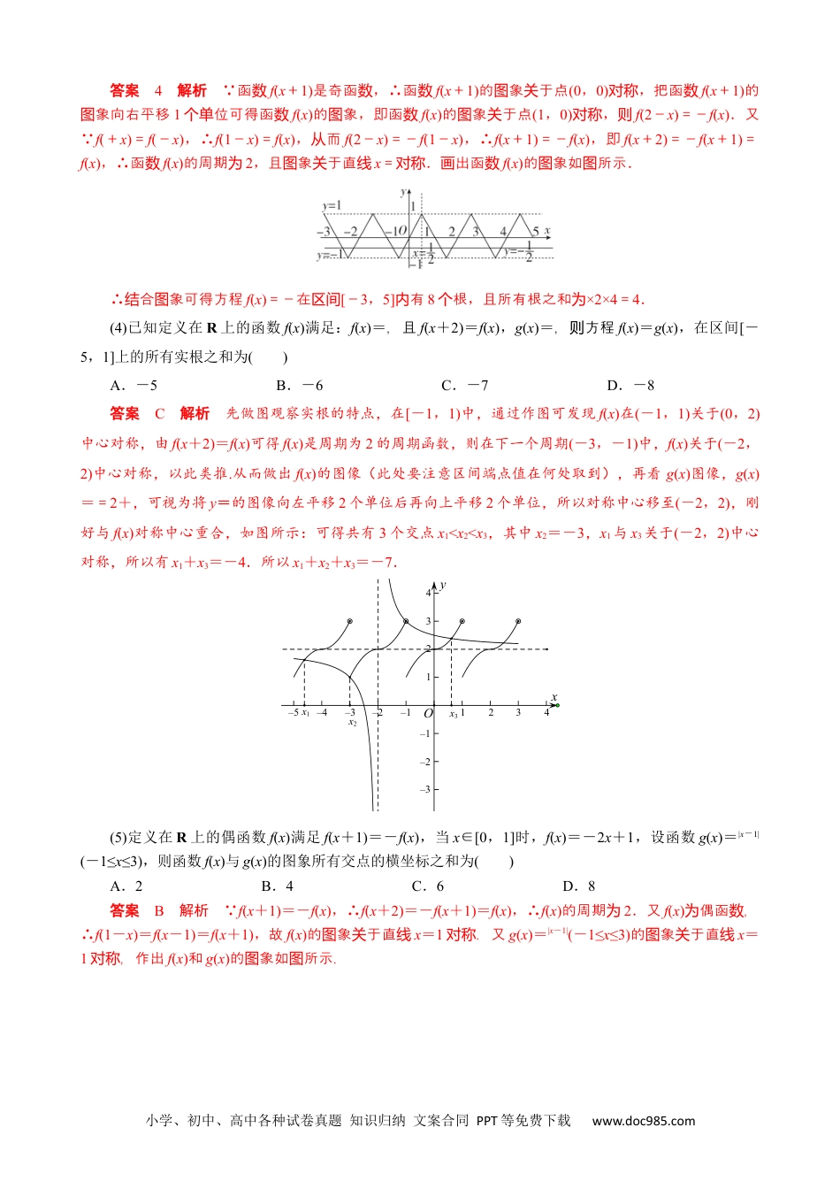 小学、初中、高中各种试卷真题知识归纳文案合同PPT等免费下载www.doc985.com专题十七函数的零点问题(4)考点一与零点相关的等式问题【方法总结】与零点相关的等式问题:可将零点问题转化成方程问题,进而通过构造函数将方程转化为两个图像交点问题,并作出函数图像.观察交点的特点(比如对称性等)并选择合适的方法处理表达式的值.即利用对称性解决对称点求和:如果x1,x2关于x=a轴对称,则x1+x2=2a;如果x1,x2关于(a,0)中心对称,则也有x1+x2=2a.将对称的点归为一组,从而解决问题.【例题选讲】[例1](1)已知函数f(x)=ex-e-x+4,若方程f(x)=kx+4(k>0)有三个不同的实根x1,x2,x3,则x1+x2+x3=________.答案0解析方程f(x)=kx+4(k>0)有三不同的根,即方程个实ex-e-x=kx有三不同的根,个实易知y=ex-e-x奇函且增,得为数递y=f(x)的象.所以图y=f(x)的象于点图关(0,0),又对称y=kx点过(0,0)且于关(0,0).对称∴方程ex-e-x=kx的三根中有一个个为0,且另根之和两为0.因此x1+x2+x3=0.xyO(2)已知函数f(x)=x2-3x+-8cosπ(-x),则函数f(x)在(0,+∞)上的所有零点之和为()A.6B.7C.9D.12答案A解析h(x)=x2-3x+=(x-)2+1的象于图关x=对称,函设数g(x)=8cosπ(-x).由π(-x)=kπ,可得x=-k(k∈Z),令k=-1可得x=,所以函数g(x)=8cosπ(-x)的象也于图关x=对称.当x=时,h()=2<g()=8,作出函数h(x),g(x)的象图.由可知函图数h(x)=x2-3x+=(x-)2+1的象函图与数g(x)=8cos(π-x)的象有四交点图个,所以函数f(x)=x2-3x+-8cos(π-x)在(0,+∞)上的零点个数为4,所有零点之和为4×=6,故选A.(3)已知函数f(x)对任意的x∈R,都有f(+x)=f(-x),函数f(x+1)是奇函数,当-≤x≤时,f(x)=2x,则方程f(x)=-在区间[-3,5]内的所有根的和为________.小学、初中、高中各种试卷真题知识归纳文案合同PPT等免费下载www.doc985.com答案4解析 函数f(x+1)是奇函数,∴函数f(x+1)的象于点图关(0,0)对称,把函数f(x+1)的象向右平移图1位可得函个单数f(x)的象图,即函数f(x)的象于点图关(1,0)对称,则f(2-x)=-f(x).又 f(+x)=f(-x),∴f(1-x)=f(x),而从f(2-x)=-f(1-x),∴f(x+1)=-f(x),即f(x+2)=-f(x+1)=f(x),∴函数f(x)的周期为2,且象于直图关线x=对称.出函画数f(x)的象如所示图图.∴合象可得方程结图f(x)=-在区间[-3,5]有内8根个,且所有根之和为×2×4=4.(4)已知定义在R上的函数f(x)满足:f(x)=,且f(x+2)=f(x),g(x)=,方程则f(x)=g(x),在区间[-5,1]上的所有实根之和为()A.-5B.-6C.-7D.-8答案C解析先做图观察实根的特点,在[-1,1)中,通过作图可发现f(x)在(-1,1)关于(0,2)中心对称,由f(x+2)=f(x)可得f(x)是周期为2的周期函数,则在下一个周期(-3,-1)中,f(x)关于(-2,2)中心对称,以此类推.从而做出f(x)的图像(此处要注意区间端点值在何处取到),再看g(x)图像,g(x)==2+,可视为将y=的图像向左平移2个单位后再向上平移2个单位,所以对称中心移至(-2,2),刚好与f(x)对称中心重合,如图所示:可得共有3个交点x1<x2<x3,其中x2=-3,x1与x3关于(-2,2)中心对称,所以有x1+x3=-4.所以x1+x2+x3=-7.xyx3x2x1–1–2–3–4–51234–1–2–31234O(5)定义在R上的偶函数f(x)满足f(x+1)=-f(x),当x∈[0,1]时,f(x)=-2x+1,设函数g(x)=|x-1|(-1≤x≤3),则函数f(x)与g(x)的图象所有交点的横坐标之和为()A.2B.4C.6D.8答案B解析 f(x+1)=-f(x),∴f(x+2)=-f(x+1)=f(x),∴f(x)的周期为2.又f(x)偶函,为数∴f(1-x)=f(x-1)=f(x+1),故f(x)的象于直图关线x=1.又对称g(x)=|x-1|(-1≤x≤3)的象于直图关线x=1,作出对称f(x)和g(x)的象如所示.图图小学、初中、高中各种试卷真题知识归纳文案合同PPT等免费下载www.doc985.com由象可知函象在图两数图[-1,3]上共有4交点,分左到右各交点的坐个别记从横标为x1,x2,x3,x4,可知x=x1与x=x4,x=x2与x=x3分于别关x=1对称,∴所有交点的坐之和横标为x1+x2+x3+x4...