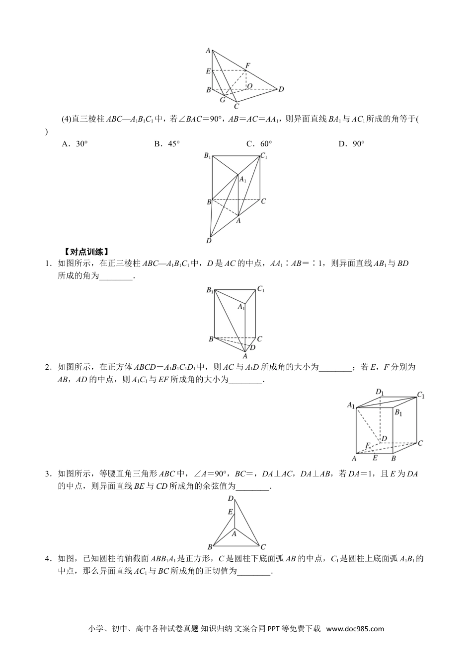 专题07立体几何中空间角的计算考点一异面直线所成的角【方法总结】求异面直线所成的角的方法求异面直线所成的角常用方法是平移法,通过作三角形的中位线,平行四边形等进行平移,作出异面直线所成的角,转化为解三角形问题,进而求解.解三角形,求出作出的角.如果求出的角是锐角或直角,则它就是要求的角;如果求出的角是钝角,则它的补角才是要求的角.【例题选讲】[例1](1)(2018·全国Ⅱ)在正方体ABCD-A1B1C1D1中,E为棱CC1的中点,则异面直线AE与CD所成角的正切值为()A.B.C.D.(2)如图,在底面为正方形,侧棱垂直于底面的四棱柱ABCD—A1B1C1D1中,AA1=2AB=2,则异面直线A1B与AD1所成角的余弦值为()A.B.C.D.(3)在我国古代数学名著《九章算术》中,将四个面都为直角三角形的四面体称为鳖臑.如图,在鳖臑ABCD中,AB⊥平面BCD,且AB=BC=CD,则异面直线AC与BD所成角的余弦值为()A.B.-C.D.-小学、初中、高中各种试卷真题知识归纳文案合同PPT等免费下载www.doc985.com(4)直三棱柱ABC—A1B1C1中,若∠BAC=90°,AB=AC=AA1,则异面直线BA1与AC1所成的角等于()A.30°B.45°C.60°D.90°【对点训练】1.如图所示,在正三棱柱ABC—A1B1C1中,D是AC的中点,AA1∶AB=∶1,则异面直线AB1与BD所成的角为________.2.如图所示,在正方体ABCD-A1B1C1D1中,则AC与A1D所成角的大小为________;若E,F分别为AB,AD的中点,则A1C1与EF所成角的大小为________.3.如图所示,等腰直角三角形ABC中,∠A=90°,BC=,DA⊥AC,DA⊥AB,若DA=1,且E为DA的中点,则异面直线BE与CD所成角的余弦值为________.4.如图,已知圆柱的轴截面ABB1A1是正方形,C是圆柱下底面弧AB的中点,C1是圆柱上底面弧A1B1的中点,那么异面直线AC1与BC所成角的正切值为________.小学、初中、高中各种试卷真题知识归纳文案合同PPT等免费下载www.doc985.com5.在正三棱柱ABC-A1B1C1中,AB=AA1=2,M,N分别为AA1,BB1的中点,则异面直线BM与C1N所成角的余弦值为________.6.如图,四边形ABCD为矩形,平面PCD⊥平面ABCD,且PC=PD=CD=2,BC=2,O,M分别为CD,BC的中点,则异面直线OM与PD所成的角的余弦值为()A.B.C.D.7.点E,F分别是三棱锥P-ABC的棱AP,BC的中点,AB=6,PC=8,EF=5,则异面直线AB与PC所成的角为()A.90°B.45°C.30°D.60°8.已知在四面体ABCD中,E,F分别是AC,BD的中点,若AB=2,CD=4,EF⊥AB,则EF与CD所成的角的大小为()A.90°B.45°C.60°D.30°9.在正三棱柱ABC-A1B1C1中,AB=BB1,则AB1与BC1所成角的大小为()A.30°B.60°C.75°D.90°10.如图所示,在四棱锥PABCD中,∠ABC=∠BAD=90°,BC=2AD,△PAB和△PAD都是等边三角形,则异面直线CD与PB所成角的大小为________.考点二直线与平面所成的角【方法总结】求直线与平面所成角的方法求直线与平面所成角的关键是寻找过直线上一点与平面垂直的垂线、垂足与斜足的连线即为直线在平面内的射影,直线与直线在平面内射影所成的角即为线面角.然后转化为解三角形问题,进而求解.【例题选讲】[例2](1)已知三棱柱ABC-A1B1C1的侧棱与底面垂直,体积为,底面是边长为的正三角形.若P为底面A1B1C1的中心,则PA与平面ABC所成角的大小为________.小学、初中、高中各种试卷真题知识归纳文案合同PPT等免费下载www.doc985.com(2)(2018·全国Ⅰ)在长方体ABCD-A1B1C1D1中,AB=BC=2,AC1与平面BB1C1C所成的角为30°,则该长方体的体积为()A.8B.6C.8D.8【对点训练】1.在正三棱柱ABC-A1B1C1中,AB=1,点D在棱BB1上,且BD=1,则AD与平面AA1C1C所成角的正弦值为()A.B.C.D.2.如图,正四棱锥P-ABCD的体积为2,底面积为6,E为侧棱PC的中点,则直线BE与平面PAC所成的角为()A.60°B.30°C.45°D.90°3.已知正方体ABCD-A1B1C1D1的体积为16,点P在正方形A1B1C1D1上且A1,C到P的距离分别为2,2,则直线CP与平面BDD1B1所成角的正切值为()A.B.C.D.4.在正方体ABCD-A1B1C1D1中,E为棱CD上的一点,且CE=2DE,F为棱AA1的中点,且平面BEF与DD1交于点G,则B1G与平面ABCD所成角的正切值为()A....