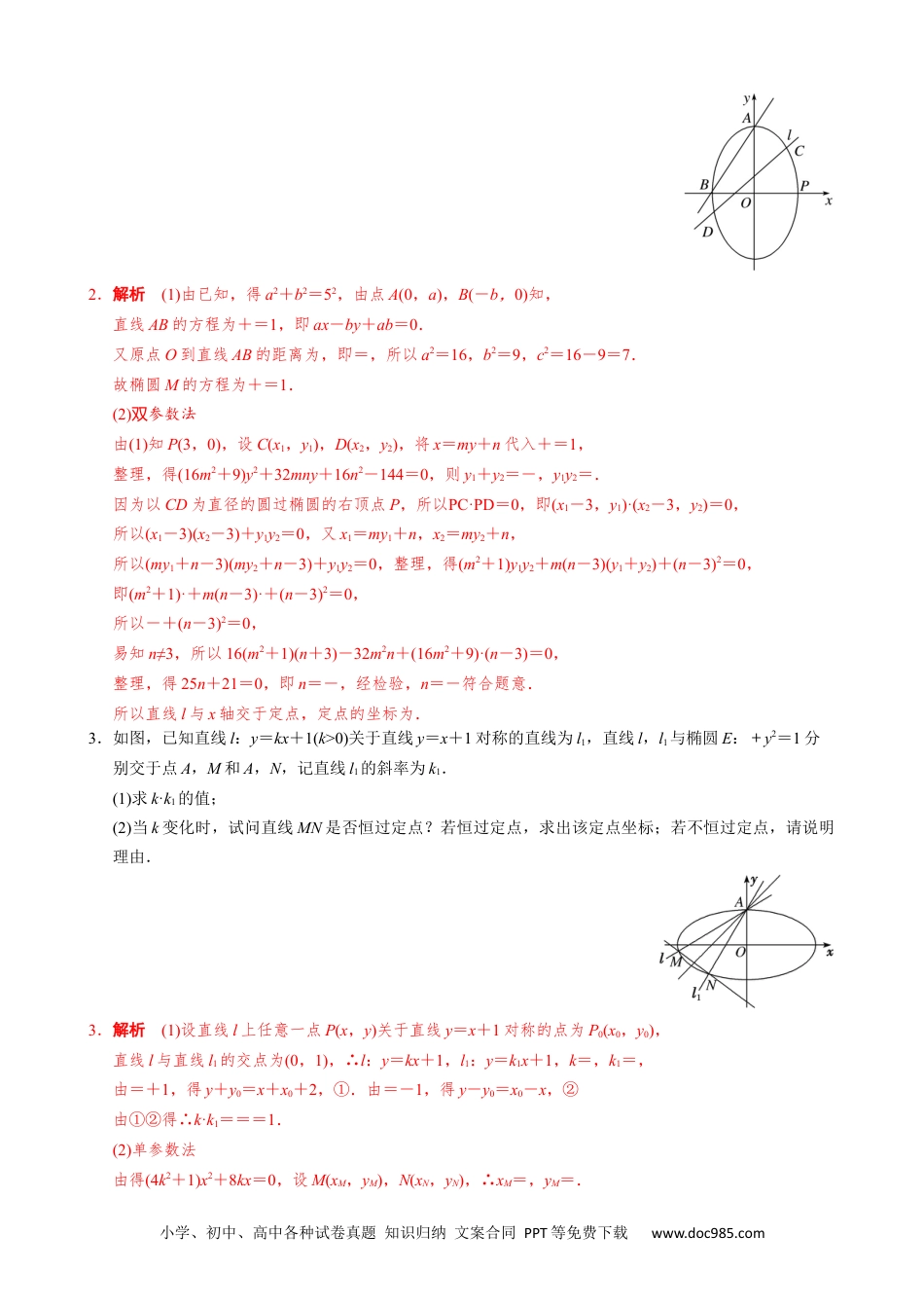 小学、初中、高中各种试卷真题知识归纳文案合同PPT等免费下载www.doc985.com专题16已知核心方程(隐性)和未知核心方程直线过定点模型题型一已知核心方程(隐性)先将隐性核心方程等价地转化为显性核心方程.【方法总结】(1)单参数法:设动直线PM方程为y=k(x-x0)+y0,联立直线与椭圆(抛物线),解出点M的坐标为(A(k),B(k)),同理(由核心方程代换),得出点N的坐标为(C(k),D(k)),然后写出动直线MN方程,即kf(x,y)+g(x,y)=0,根据直线过定点时与参数没有关系(即方程对参数的任意值都成立),得到方程组以方程组的解为坐标的点就是直线所过的定点.(2)双参数法:设动直线MN方程(斜率存在)为y=kx+t,由核心方程得到f(k,t)=0,把t用k表示或把k用t表示,即kf(x,y)+g(x,y)=0(或tf(x,y)+g(x,y)=0),根据直线过定点时与参数没有关系(即方程对参数的任意值都成立),得到方程组以方程组的解为坐标的点就是直线所过的定点.【例题选讲】[例1]已知椭圆C:+=1(a>b>0)的右焦点F(,0),半短半的比长轴长与轴长值为2.(1)求椭圆C的标准方程;(2)设不经过点B(0,1)的直线l与椭圆C相交于不同的两点M,N,若点B在以线段MN为直径的圆上,证明直线l过定点,并求出该定点的坐标.[规范解答](1)由题意得,c=,=2,a2=b2+c2,∴a=2,b=1,∴椭圆C的标准方程为+y2=1.(2)双参数法当直线l的斜率存在时,设直线l的方程为y=kx+m(m≠1),M(x1,y1),N(x2,y2).联立消去y,可得(4k2+1)x2+8kmx+4m2-4=0.∴Δ=16(4k2+1-m2)>0,x1+x2=,x1x2=. 点B在以线段MN为直径的圆上,∴BM·BN=0.则BM·BN=(x1,kx1+m-1)·(x2,kx2+m-1)=(k2+1)x1x2+k(m-1)(x1+x2)+(m-1)2=0,∴(k2+1)+k(m-1)+(m-1)2=0,整理,得5m2-2m-3=0,解得m=-或m=1(舍去).∴直线l的方程为y=kx-.易知当直线l的斜率不存在时,不符合题意.故直线l过定点,且该定点的坐标为.[例2]已知椭圆O:+=1(a>b>0)的左、右顶点分别为A,B,点P在椭圆O上运动,若△PAB面积的最大值为2,椭圆O的离心率为.(1)求椭圆O的标准方程;(2)过B点作圆E:x2+(y-2)2=r2(0<r<2)的两条切线,分别与椭圆O交于两点C,D(异于点B),当r变化时,直线CD是否恒过某定点?若是,求出该定点坐标;若不是,请说明理由.[规范解答](1)由题可知当点P在椭圆O的上顶点(或下顶点)时,S△PAB最大,小学、初中、高中各种试卷真题知识归纳文案合同PPT等免费下载www.doc985.com此时S△PAB=×2ab=ab=2,∴⇒a=2,b=,c=1,∴椭圆O的标准方程为+=1.(2)单参数法设过点B(2,0)与圆E相切的直线方程为y=k(x-2),即kx-y-2k=0, 直线与圆E:x2+(y-2)2=r2相切,∴d==r,即(4-r2)k2+8k+4-r2=0.设两切线的斜率分别为k1,k2(k1≠k2),则k1k2=1,设C(x1,y1),D(x2,y2),由⇒(3+4k)x2-16kx+16k-12=0,∴2x1=,即x1=,∴y1=;同理,x2==,y2==;∴kCD===.∴直线CD的方程为y+=,整理得y=x-=(x-14).∴直线CD恒过定点(14,0).【对点训练】1.椭圆C:+=1(a>b>0)的离心率为,其左焦点到点P(2,1)的距离为.(1)求椭圆C的标准方程;(2)若直线l:y=kx+m与椭圆C相交于A,B两点(A,B不是左、右顶点),且以AB为直径的圆过椭圆C的右顶点,求证:直线l过定点,并求出该定点的坐标.1.解析(1)由e==,得a=2c, a2=b2+c2,∴b2=3c2,则椭圆方程变为+=1.又由题意知=,解得c=1,故a2=4,b2=3,即得椭圆的标准方程为+=1.(2)双参数法设A(x1,y1),B(x2,y2),联立得(3+4k2)x2+8mkx+4(m2-3)=0,则①∴y1y2=(kx1+m)(kx2+m)=k2x1x2+mk(x1+x2)+m2=. 椭圆的右顶点为A2(2,0),AA2⊥BA2,∴(x1-2)(x2-2)+y1y2=0,∴y1y2+x1x2-2(x1+x2)+4=0,∴+++4=0,∴7m2+16mk+4k2=0,解得m1=-2k,m2=-.由Δ>0,得3+4k2-m2>0,②当m1=-2k时,l的方程为y=k(x-2),直线过定点(2,0),与已知矛盾.当m2=-时,l的方程为y=k,直线过定点,且满足②,∴直线l过定点,定点坐标为.2.如图所示,已知椭圆M:+=1(a>b>0)的四个顶点构成边长为5的菱形,原...