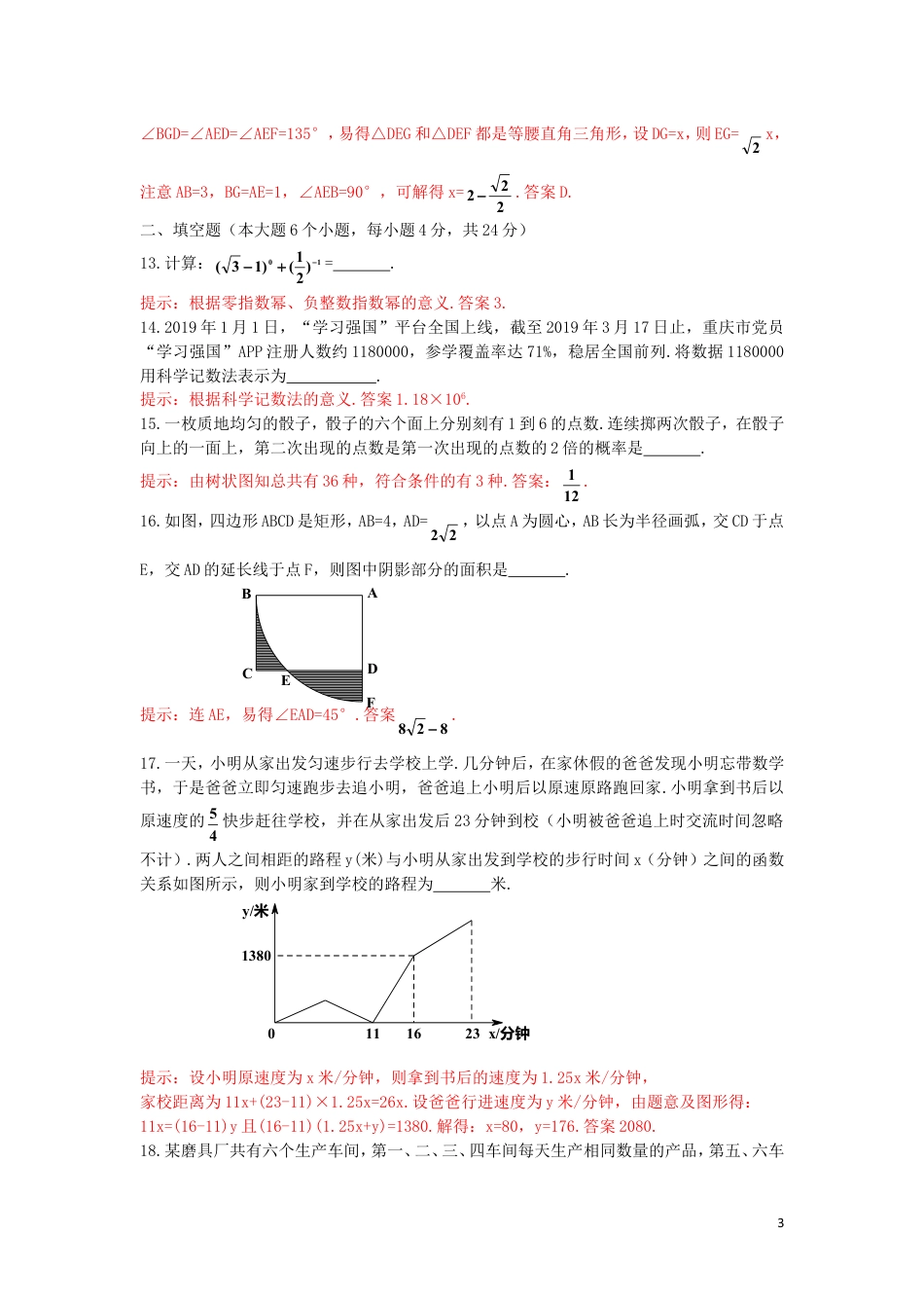 DCBAOCBA输出yy=-2x+by=-x+b2x<3x≥3输入x重庆市2019年初中学业水平暨高中招生考试数学试题(B卷)(全卷共四个大题,满分150分,考试时间120分钟)参考公式:抛物线y=ax2+bx+c(a≠0)的顶点坐标为(a2b,a4bac42),对称轴公式为x=a2b.一、选择题(本大题12个小题,每小题4分,共48分)1.5的绝对值是()A、5;B、-5;C、51;D、51.提示:根据绝对值的概念.答案A.2.如图是一个由5个相同正方体组成的立体图形,它的主视图是()提示:根据主视图的概念.答案D.3.下列命题是真命题的是()A、如果两个三角形相似,相似比为4︰9,那么这两个三角形的周长比为2︰3;B、如果两个三角形相似,相似比为4︰9,那么这两个三角形的周长比为4︰9;C、如果两个三角形相似,相似比为4︰9,那么这两个三角形的面积比为2︰3;D、如果两个三角形相似,相似比为4︰9,那么这两个三角形的面积比为4︰9.提示:根据相似三角形的性质.答案B.4.如图,AB是⊙O的直径,AC是⊙O的切线,A为切点,若∠C=40°,则∠B的度数为()A、60°;B、50°;C、40°;D、30°.提示:利用圆的切线性质.答案B.5.抛物线y=-3x2+6x+2的对称轴是()A、直线x=2;B、直线x=-2;C、直线x=1;D、直线x=-1.提示:根据试卷提供的参考公式.答案C.6.某次知识竞赛共有20题,答对一题得10分,答错或不答扣5分,小华得分要超过120分,他至少要答对的题的个数为()A、13;B、14;C、15;D、16.提示:用验证法.答案C.7.估计1025的值应在()A、5和6之间;B、6和7之间;C、7和8之间;D、8和9之间.提示:化简得53.答案B.8.根据如图所示的程序计算函数y的值,若输入x的值是7,则输出y的值是-2,若输入x的值是-8,则输出y的值是()A、5;B、10;C、19;D、21.提示:先求出b.答案C.1yxOCBAFEDCBAGFEDCBA9.如图,在平面直角坐标系中,菱形OABC的边OA在x轴上,点A(10,0),sin∠COA=54.若反比例函数)0x,0k(xky经过点C,则k的值等于()A、10;B、24;C、48;D、50.提示:因为OC=OA=10,过点C作OA的垂线,记垂足为D,解直角三角形OCD.答案C.10.如图,AB是垂直于水平面的建筑物,为测量AB的高度,小红从建筑底端B点出发,沿水平方向行走了52米到达点C,然后沿斜坡CD前进,到达坡顶D点处,DC=BC,在点D处放置测角仪,测角仪支架DE的高度为0.8米,在E点处测得建筑物顶端A点的仰角∠AEF为27°(点A,B,C,D,E在同一平面内).斜坡CD的坡度(或坡比)i=1︰2.4,那么建筑物AB的高度约为()(参考数据sin27°≈0.45,cos27°≈0.89,tan27°≈0.51)A、65.8米;B、71.8米;C、73.8米;D、119.8米.提示:作DG⊥BC于G,延长EF交AB于H.因为DC=BC=52,i=1︰2.4,易得DG=20,CG=48,所以BH=DE+DG=20.8,EH=BC+CG=100,所以AH=51.答案B.11.若数a使关于x的不等式组)x1(5a2x6)7x(4123x有且仅有三个整数解,且使关于y的分式方程3y1a1yy21的解为正数,则所有满足条件的整数a的值之和是()A、-3;B、-2;C、-1;D、1.提示:由不等式组的条件得:-2.5≤a<3.由分式方程的条件得:a<2且a≠1.综上所述,整数a为-2,-1,0.答案A.12.如图,在△ABC中,∠ABC=45°,AB=3,AD⊥BC于点D,BE⊥AC于点E,AE=1,连接DE,将△AED沿直线沿直线AE翻折至△ABC所在的平面内,得到△AEF,连接DF,过点D作DG⊥DE交BE于点G.则四边形DFEG的周长为()A、8;B、24;C、422;D、223.提示:易证△AED≌△AEF≌△BGD,得ED=EF=GD,∠DGE=45°,进而得2FEDCBAy/米x/分钟13802316110∠BGD=∠AED=∠AEF=135°,易得△DEG和△DEF都是等腰直角三角形,设DG=x,则EG=2x,注意AB=3,BG=AE=1,∠AEB=90°,可解得x=222.答案D.二、填空题(本大题6个小题,每小题4分,共24分)13.计算:10)21()13(=.提示:根据零指数幂、负整数指数幂的意义.答案3.14.2019年1月1日,“学习强国”平台全国上线,截至2019年3月17日止,重庆市党员“学习强国”APP注册人数约1180000,参学覆盖率达71%,稳居全国前列.将数据1180000用科学记数法表示为.提示:根据科学记数法的意义.答案1.18×106.15.一枚质地均匀的骰子,骰子的六个面上分别刻有1到6的点数....