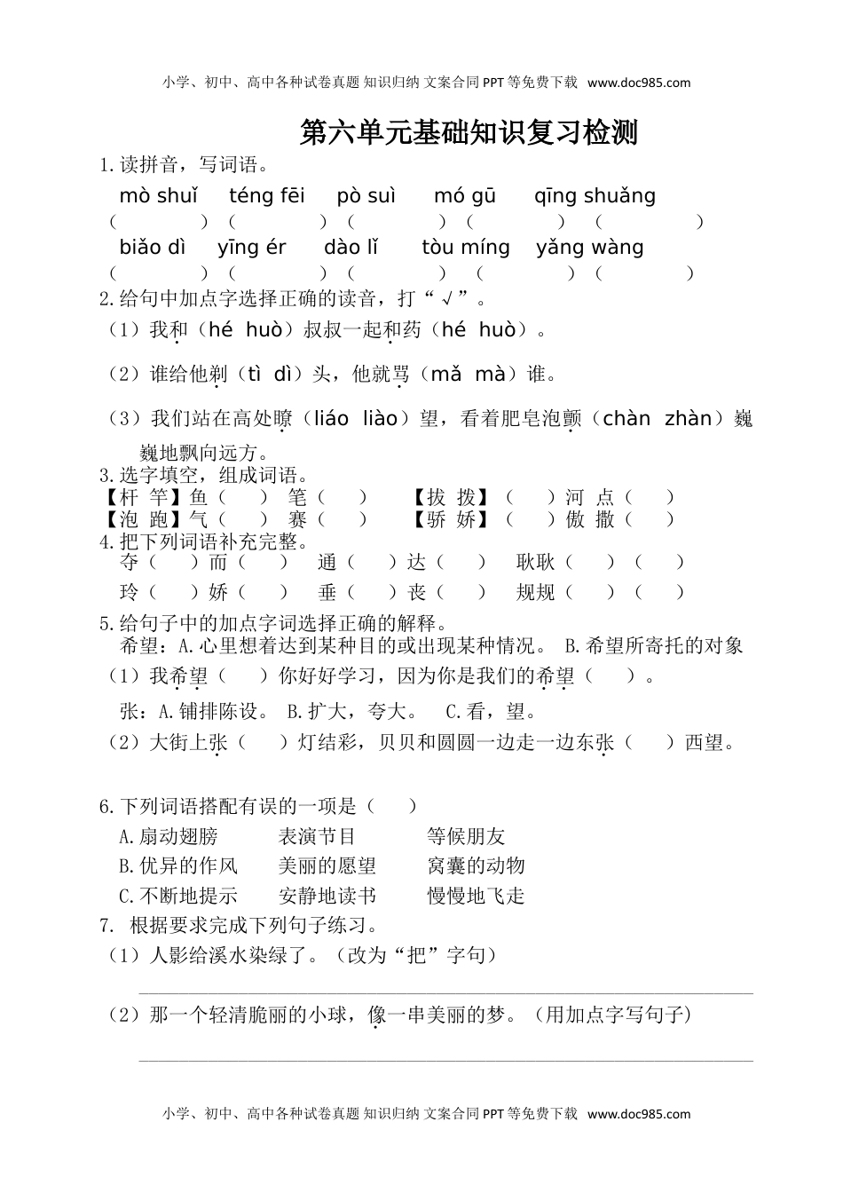 小学、初中、高中各种试卷真题知识归纳文案合同PPT等免费下载www.doc985.com第六单元基础知识复习检测1.读拼音,写词语。mòshuǐténgfēipòsuìmógūqīngshuǎng()()()()()biǎodìyīngérdàolǐtòumíngyǎngwàng()()()()()2.给句中加点字选择正确的读音,打“√”。(1)我和(héhuò)叔叔一起和药(héhuò)。(2)谁给他剃(tìdì)头,他就骂(mǎmà)谁。(3)我们站在高处瞭(liáoliào)望,看着肥皂泡颤(chànzhàn)巍巍地飘向远方。3.选字填空,组成词语。【杆竿】鱼()笔()【拔拨】()河点()【泡跑】气()赛()【骄娇】()傲撒()4.把下列词语补充完整。夺()而()通()达()耿耿()()玲()娇()垂()丧()规规()()5.给句子中的加点字词选择正确的解释。希望:A.心里想着达到某种目的或出现某种情况。B.希望所寄托的对象(1)我希望()你好好学习,因为你是我们的希望()。张:A.铺排陈设。B.扩大,夸大。C.看,望。(2)大街上张()灯结彩,贝贝和圆圆一边走一边东张()西望。6.下列词语搭配有误的一项是()A.扇动翅膀表演节目等候朋友B.优异的作风美丽的愿望窝囊的动物C.不断地提示安静地读书慢慢地飞走7.根据要求完成下列句子练习。(1)人影给溪水染绿了。(改为“把”字句)______________________________________________________________(2)那一个轻清脆丽的小球,像一串美丽的梦。(用加点字写句子)______________________________________________________________小学、初中、高中各种试卷真题知识归纳文案合同PPT等免费下载www.doc985.com小学、初中、高中各种试卷真题知识归纳文案合同PPT等免费下载www.doc985.com(3)伯伯家养的鸽子,尖尖的嘴巴,红红的眼睛,漂亮及啦!(仿写句子)奶奶家养的小狗,______________________________________________,可爱极啦!8.根据课文理解填空。(1)见善则迁,____________。(2)人谁无过?____________,善莫大焉。(3)《童年的水墨画》通过描写儿童____________、____________、____________三个场景中的生活画面,表现了孩子们__________________。(4)《剃头大师》讲述了“我”自以为是____________给表弟小沙剃头,结果把小沙的头发剃得更糟的童年趣事。(5)《肥皂泡》写的是_______回忆自己小时候玩吹泡泡的游戏的事,表达了作者对童年时代快乐生活的_______之情。(6)《我不能失信》讲了__________小时候____________的故事,表现了宋庆龄____________的可贵品质。参考答案1.墨水腾飞破碎蘑菇清爽表弟婴儿道理透明仰望2.(1)héhuò(2)tìmà(3)liàochàn3.竿杆拔拨泡跑骄娇4.门逃情理于怀珑软头气矩矩5.(1)AB(2)AC6.B7.(1)溪水把人影染绿了。(2)十五的月亮像个大圆盘。(3)示例:又圆又亮的眼睛,雪白的长毛8.(1)有过则改(2)过而能改(3)溪边垂钓江上戏水林中采菇童年生活的快乐(4)剃头大师(5)冰心留恋(6)宋庆龄诚实守信诚实守信小学、初中、高中各种试卷真题知识归纳文案合同PPT等免费下载www.doc985.com