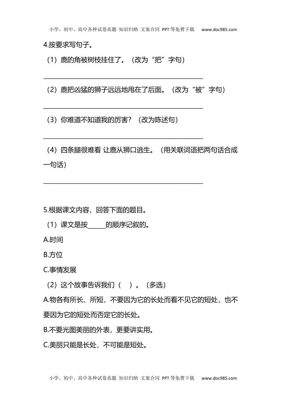 小学、初中、高中各种试卷真题知识归纳文案合同PPT等免费下载www.doc985.com三年级下册语文分层作业优秀设计07《鹿角和鹿腿》7.鹿角和鹿腿A类基础必做题1.根据拼音写词语。lùjiǎochítángdàoyǐngxīnshǎng()()()()yúnchènjīngzhìchuánshuōāiyā()()()()2.给下面的多音字注音并组词。称____(_____)____(_____)禁____(_____)____(_____)挣____(_____)____(_____)3.选择正确的字填空。喝渴(1)鹿口_____了,找到一个池塘,痛痛快快地____起水来。到倒(2)他看着自己____映在水面上的影子,不解地自言自语:“这____底是怎么回事呢?”小学、初中、高中各种试卷真题知识归纳文案合同PPT等免费下载www.doc985.com小学、初中、高中各种试卷真题知识归纳文案合同PPT等免费下载www.doc985.com4.按要求写句子。(1)鹿的角被树枝挂住了。(改为“把”字句)_____________________________________________________[来源:Zxxk.Com](2)鹿把凶猛的狮子远远地甩在了后面。(改为“被”字句)_____________________________________________________(3)你难道不知道我的厉害?(改为陈述句)_____________________________________________________(4)四条腿很难看让鹿从狮口逃生。(用关联词语把两句话合成一句话)_____________________________________________________5.根据课文内容,回答下面的题目。(1)课文是按______的顺序记叙的。A.时间B.方位C.事情发展(2)这个故事告诉我们()。(多选)A.物各有所长、所短,不要因为它的长处而看不见它的短处,也不要因为它的短处而否定它的长处。B.不要光图美丽的外表,更要讲实用。C.美丽只能是长处,不可能是短处。小学、初中、高中各种试卷真题知识归纳文案合同PPT等免费下载www.doc985.com小学、初中、高中各种试卷真题知识归纳文案合同PPT等免费下载www.doc985.comB类提升选做题6.课内阅读。鹿不敢犹豫,撒开长腿就跑。有力的长腿在灌木丛中蹦来跳去,不一会儿,就把凶猛的狮子远远地甩在了后面。就在狮子灰心丧气不想再追的时候,鹿的角却被树枝挂住了。狮子赶紧抓住这个机会,猛扑过来。眼看就要追上了,鹿用尽全身力气,使劲一扯,才把两只角从树枝中挣脱出来,然后又拼命向前奔去。这次,狮子再也没有追上。(1)从哪里可以看出鹿的长腿非常灵活?用“——”在文中画出来。(2)“狮子赶紧抓住这个机会”中的“这个机会”指[来源:学科网ZXXK](3)在逃命过程中,帮助鹿的是_____________,害得鹿差点送命的是____________。你从中明白了什么道理?[来源:学§科§网Z§X§X§K]__________________________________________________________________________________________________________________________________C类拓展挑战题7.课外阅读。乌鸦兄弟乌鸦兄弟俩同住在一个窠里。有一天,窠破了一个洞。小学、初中、高中各种试卷真题知识归纳文案合同PPT等免费下载www.doc985.com小学、初中、高中各种试卷真题知识归纳文案合同PPT等免费下载www.doc985.com大乌鸦想:“老二会去修的。”小乌鸦想:“老大会去修的。”结果谁也没有去修。后来洞越来越大了。大乌鸦想:“这一下老二一定会去修了,难道窠这样破了,它还能住吗?”小乌鸦想:“这一下老大一定会去修了,难道窠这样破了,它还能住吗?”结果又是谁也没有去修。一直到了严寒的冬天,西北风呼呼地刮着,大雪纷纷地飘落。乌鸦兄弟俩都蜷缩在破窠里,哆嗦地叫着:“冷啊!冷啊!”大乌鸦想:“这样冷的天气,老二一定耐不住,它会去修的。”小乌鸦想:“这样冷的天气,老大还耐得住吗?它一定会去修的。”可是谁也没有动手,只是把身子蜷缩得更紧些。风越刮越凶,雪越下越大。结果,窠被吹到地上,两只乌鸦都冻僵了。(1)选字填空。①鸦鸭()子鸟()②结洁()白()果③修休()理()息(2)写出下列词语的反义词。大——()紧——()落——()后——()冷——()下——()(3)读句子,找出与例句意思一样的句子,并画上“√”。例:难道窠这样破了,它还能住吗?①窠这样破了,它能住。()小学、初中、高中各种...