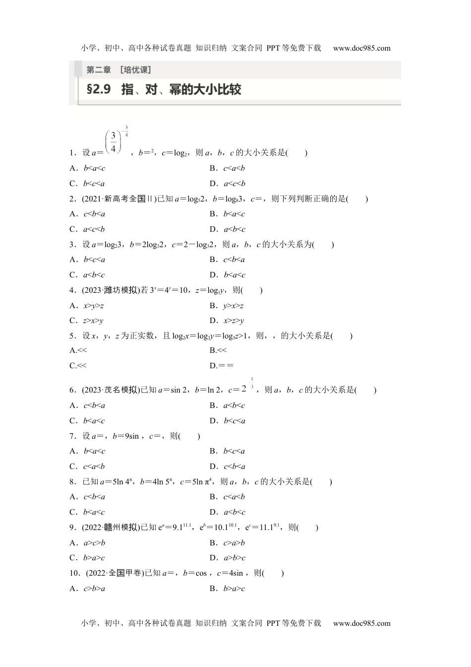 小学、初中、高中各种试卷真题知识归纳文案合同PPT等免费下载www.doc985.com1.设a=,b=2,c=log2,则a,b,c的大小关系是()A.b<a<cB.c<a<bC.b<c<aD.a<c<b2.(2021·新高考全国Ⅱ)已知a=log52,b=log83,c=,则下列判断正确的是()A.c<b<aB.b<a<cC.a<c<bD.a<b<c3.设a=log23,b=2log32,c=2-log32,则a,b,c的大小关系为()A.b<c<aB.c<b<aC.a<b<cD.b<a<c4.(2023·坊模潍拟)若3x=4y=10,z=logxy,则()A.x>y>zB.y>x>zC.z>x>yD.x>z>y5.设x,y,z为正实数,且log2x=log3y=log5z>1,则,,的大小关系是()A.<<B.<<C.<<D.==6.(2023·茂名模拟)已知a=sin2,b=ln2,c=,则a,b,c的大小关系是()A.c<b<aB.a<b<cC.b<a<cD.b<c<a7.设a=,b=9sin,c=,则()A.b<a<cB.b<c<aC.c<a<bD.c<b<a8.已知a=5ln4π,b=4ln5π,c=5lnπ4,则a,b,c的大小关系是()A.c<b<aB.c<a<bC.b<a<cD.a<b<c9.(2022·州模赣拟)已知ea=9.111.1,eb=10.110.1,ec=11.19.1,则()A.a>c>bB.c>a>bC.b>a>cD.a>b>c10.(2022·全甲卷国)已知a=,b=cos,c=4sin,则()A.c>b>aB.b>a>c小学、初中、高中各种试卷真题知识归纳文案合同PPT等免费下载www.doc985.com小学、初中、高中各种试卷真题知识归纳文案合同PPT等免费下载www.doc985.comC.a>b>cD.a>c>b小学、初中、高中各种试卷真题知识归纳文案合同PPT等免费下载www.doc985.com