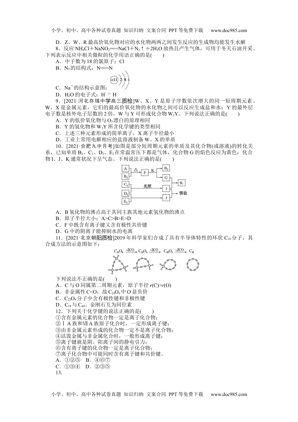 小学、初中、高中各种试卷真题知识归纳文案合同PPT等免费下载www.doc985.com专练23原子结构与化学键1.[2021·浙江1月]下列含有共价键的盐是()A.CaCl2B.H2SO4C.Ba(OH)2D.Na2CO32.[2021·北京海淀期中]利用固体表面催化工艺进行NO分解的过程如图所示。下列说法不正确的是()A.NO属于共价化合物B.O2含有非极性共价键C.过程②吸收能量,过程③释放能量D.标准状况下,NO分解生成11.2LN2转移电子数为6.02×10233.[2021·广卷东]一种麻醉剂的分子结构式如图所示。其中,X的原子核只有1个质子;元素Y、Z、W原子序数依次增大,且均位于X的下一周期;元素E的原子比W原子多8个电子。下列说法不正确的是()A.XEZ4是一种强酸B.非金属性:W>Z>YC.原子半径:Y>W>ED.ZW2中,Z的化合价为+2价4.[2021·安徽省江南片高三入摸底考学试]一定条件下,氨气与氟气发生反应:4NH3+3F2===NF3+3NH4F,其中NF3分子构型与NH3相似。下列有关说法错误的是()A.NF3中只含极性共价键B.NF3既是氧化产物,又是还原产物C.NH4F中既含有离子键又含有共价键D.上述反应中,反应物和生成物均属于共价化合物5.[2021·湖南大附中高三月考卷师试]Q、W、X、Y、Z是原子序数依次增大的短周期元素,X、Y是金属元素,X的焰色呈黄色。5种元素核电荷数之和为54,最外层电子数之和为20。W、Z最外层电子数相同,Z的核电荷数是W的2倍。工业上一般通过电解氧化物的方法获得Y的单质。则下列说法不正确的是()A.原子半径:X>Y>Q>WB.Q的单质都具有良好的导电性C.Q和Z所形成的分子的空间构型为直线形D.Y和Z的简单离子不能在水中化合形成化合物Y2Z36.[2021·浙江嘉高三月考兴]下列说法正确的是()A.干冰和石英晶体中的化学键类型相同,熔化时需克服微粒间的作用力类型也相同B.CO2和CS2每个原子的最外层都具有8电子稳定结构C.H2O、H2S、H2Se由于分子间作用力依次增大,所以熔沸点依次升高D.某晶体固态时不导电,水溶液能导电,说明该晶体是离子晶体7.[2021·湖北沙市中高三能力学测试]短周期元素X、Y、Z、W、R的原子序数依次增大,Y原子达到稳定结构获得的电子数目和它的内层电子数目相等,X与Z同主族,Z是所在周期主族元素中原子半径最大的元素,W的最外层电子数与电子层数相同,R与Z形成的化合物其水溶液呈碱性。下列说法正确的是()A.离子半径由大到小的顺序为R、Z、W、YB.X、Y分别与Z形成的化合物中可以存在非极性共价键C.由X、Y、Z、R四种元素形成的两种化合物在水中不能发生反应小学、初中、高中各种试卷真题知识归纳文案合同PPT等免费下载www.doc985.com小学、初中、高中各种试卷真题知识归纳文案合同PPT等免费下载www.doc985.comD.Z、W、R最高价氧化物对应的水化物两两之间发生反应的生成物均能发生水解8.反应NH4Cl+NaNO2===NaCl+N2↑+2H2O放热且产生气体,可用于冬天石油开采。下列表示反应中相关微粒的化学用语正确的是()A.中子数为18的氯原子:ClB.N2的结构式:N===NC.Na+的结构示意图:D.H2O的电子式:HH9.[2021·河北存瑞中高三学质检]W、X、Y是原子序数依次增大的同一短周期元素。W、X是金属元素,它们的最高价氧化物的水化物之间可以反应生成盐和水;Y的最外层电子数是核外电子层数的2倍,W与Y可形成化合物W2Y。下列说法正确的是()A.Y的低价氧化物与O3漂白的原理相同B.Y的氢化物和W2Y所含化学键的类型相同C.上述三种元素形成的简单离子,X离子半径最小D.工业上常用电解相应的盐溶液制备W、X的单质10.[2021·合肥九中月考]如图是部分短周期元素的单质及其化合物(或溶液)的转化关系,已知单质B2、C2、D2、E2在常温常压下都是气体,化合物G的焰色反应为黄色;化合物I、J、K通常状况下呈气态。下列说法正确的是()A.B氢化物的沸点高于其同主族其他元素氢化物的沸点B.原子半径大小:A>C>B>E>DC.F中既含有离子键又含有极性共价键D.G中的阴离子能抑制水的电离11.[2021·北京朝阳质检]2019年科学家们合成了具有半导体特性的环状C18分子,其合成方法的示意图如下:下列说法不正确的是()A.C与O同属第二周期元素,原子半径r(C)>r(O)B.非金属性C<O,故C24O6中O显负价C.C22O4分子中含...