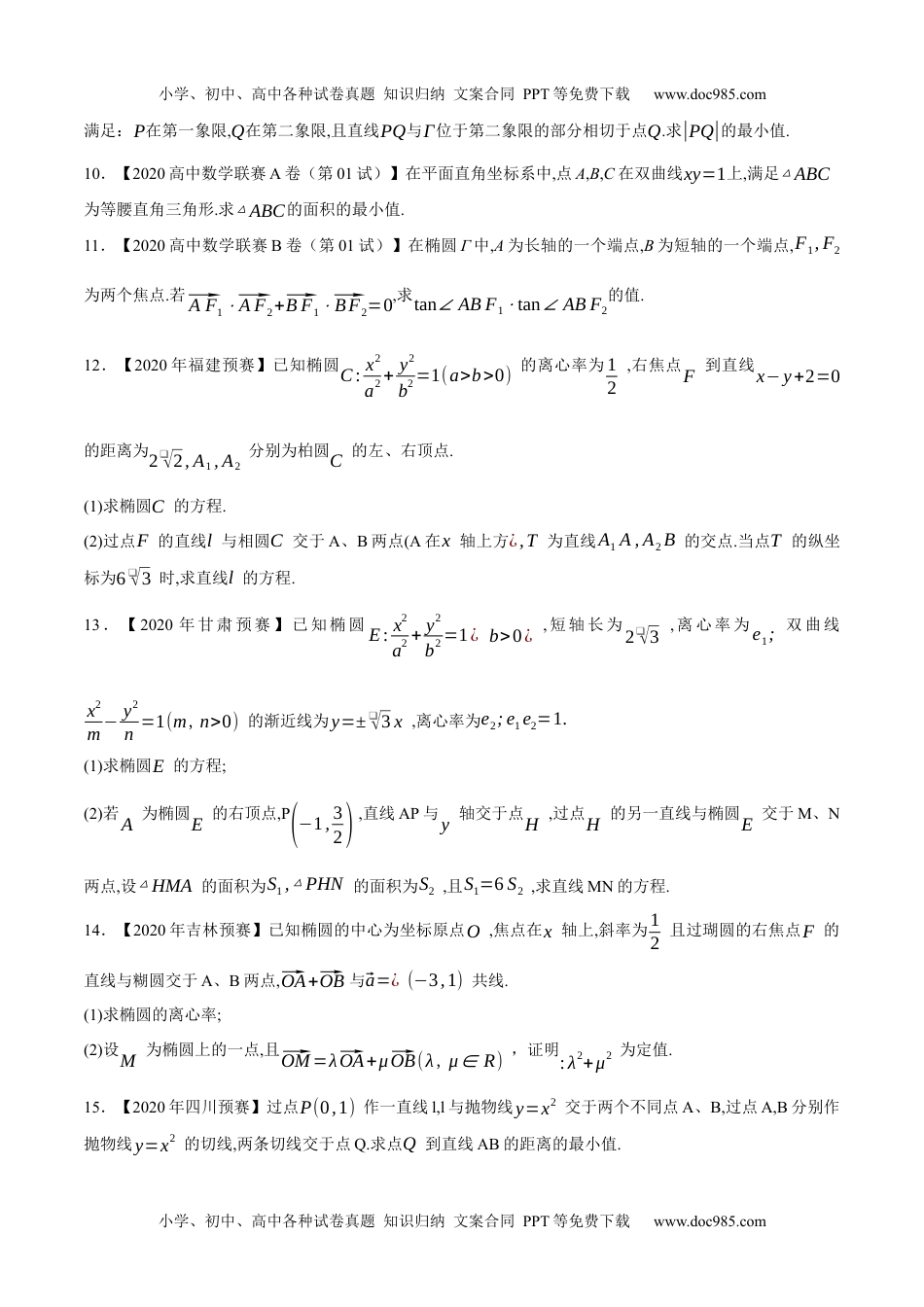 小学、初中、高中各种试卷真题知识归纳文案合同PPT等免费下载www.doc985.com备战2022年高中数学联赛之历年真题分类汇编(2015-2021)专题45平面解析几何第五缉1.【2021年江西预赛】给定圆P:x2+y2=2x及抛物线S:y2=4x,过圆心P作直线l,此直线与上述两曲线的四个交点,自上而下顺次记为A,B,C,D,如果线段AB,BC,CD的长按此顺序构成一个等差数列,求直线l的方程.2.【2021年福建预赛】已知椭圆C:x2a2+y2b2=1(a>b>0)的离心率为23,A1、A2分别为椭圆C的左、右顶点,B为椭圆C的上顶点,F1为椭圆C的左焦点,且△A1F1B的面积为❑√52.(1)求椭圆C的方程;(2)设过点D(1,0)的动直线l交椭圆C于E、F两点(点E在x轴上方¿,M、N分别为直线A1E,A2F与y轴的交点,求¿OM∨¿¿ON∨¿¿¿的值.3.【2021年福建预赛】如图,△ABC的内切圆I与三边分别相切于点D,E,F,连接AD与内切圆I的另一个交点为P,过点P分别作AC,AB的平行线,与圆I的另一个交点分别为R,Q,△DPQ和△DPR和的内心分别为I1和I2,求证:I1I2/¿EF.4.【2021年重庆预赛】如图,在平面直角坐标系,已知F1,F2分别:x2a2+y2b2=1(a>b>0)的左,右焦点.设点D(1,0)为线段OF2的中点,直线MN(不与x轴重合)过点F1且与椭圆C交于M,N两点,延长小学、初中、高中各种试卷真题知识归纳文案合同PPT等免费下载www.doc985.com小学、初中、高中各种试卷真题知识归纳文案合同PPT等免费下载www.doc985.comMD,ND与椭圆C交于P,Q两点,设直线MN,PQ的斜率存在且分删为k1,k2,请将k2k1表示成关于a的函数,即f(a)=k2k1,求f(a)的值域.5.【2021年四川预赛】已知椭圆Γ:x2a2+y2b2=1(a>b>0)的两顶点为A(−2,0),B(2,0),离心率为12.点P(不同于A,B¿¿在椭圆Γ上,点D的坐标为(−4,0),⃑DE=35⃑DP,直线AP与BE交于点Q.求点Q的轨迹方程.6.【2021年浙江预赛】设C为椭圆x28+y24=1的左焦点,直线y=kx+1与椭圆交于A,B两点.(1)求¿CA∨+¿CB∨¿的最大值;(2)若直线y=kx+1与x轴、y轴分别交于M,N,且以MN为直径的圆与线段MN的垂直平分线的交点在椭圆内部(包括在边界上),求实数k的取值范围.7.【2021年新疆预赛】在平面直角坐标系xOy中,曲线C1:(x+1)2+y2=16,曲线C2:x24+y22=1,过M(−1,0)斜率不为零的直线与C1交于A,B两点,N(1,0),AN,BN的垂直平分线分别为l1,l2,求证:(1)l1,l2均与C2相切;(2)l1,l2的交点P在一条定直线上.8.【2021年全国高中数学联赛A卷一试】在平面直角坐标系中,函数y=x+1¿x∨+1的图像上有三个不同的点位于直线l上,且这三点的横坐标之和为0.求l的斜率的取值范围.9.【2021年全国高中数学联赛B卷一试】在平面直角坐标系中,函数y=1|x|的图像为Γ.设Γ上的两点P,Q小学、初中、高中各种试卷真题知识归纳文案合同PPT等免费下载www.doc985.com小学、初中、高中各种试卷真题知识归纳文案合同PPT等免费下载www.doc985.com满足:P在第一象限,Q在第二象限,且直线PQ与Γ位于第二象限的部分相切于点Q.求|PQ|的最小值.10.【2020高中数学联赛A卷(第01试)】在平面直角坐标系中,点A,B,C在双曲线xy=1上,满足△ABC为等腰直角三角形.求△ABC的面积的最小值.11.【2020高中数学联赛B卷(第01试)】在椭圆Γ中,A为长轴的一个端点,B为短轴的一个端点,F1,F2为两个焦点.若⃗AF1⋅⃗AF2+⃗BF1⋅⃗BF2=0,求tan∠ABF1⋅tan∠ABF2的值.12.【2020年福建预赛】已知椭圆C:x2a2+y2b2=1(a>b>0)的离心率为12,右焦点F到直线x−y+2=0的距离为2❑√2,A1,A2分别为柏圆C的左、右顶点.(1)求椭圆C的方程.(2)过点F的直线l与相圆C交于A、B两点(A在x轴上方¿,T为直线A1A,A2B的交点.当点T的纵坐标为6❑√3时,求直线l的方程.13.【2020年甘肃预赛】已知椭圆E:x2a2+y2b2=1¿b>0¿,短轴长为2❑√3,离心率为e1;双曲线x2m−y2n=1(m,n>0)的渐近线为y=±❑√3x,离心率为e2;e1e2=1.(1)求椭圆E的方程;(2)若A为椭圆E的右顶点,P(−1,32),直线AP与y轴交于点H,过点H的另一直线与椭圆E交于M、N两点,设△HMA的面积为S1,△PHN的面积为S2,且S1=6S2,求直线MN的方程.14.【2020年吉林预赛】已知椭圆的中心为坐标原点O,焦点在x轴上,斜率为12且过瑚圆的右焦点F的直线与糊圆交于A、B两点,⃗OA+⃗OB与⃗a=¿(−3,1)共线.(1)求椭圆的离心率;(2)...