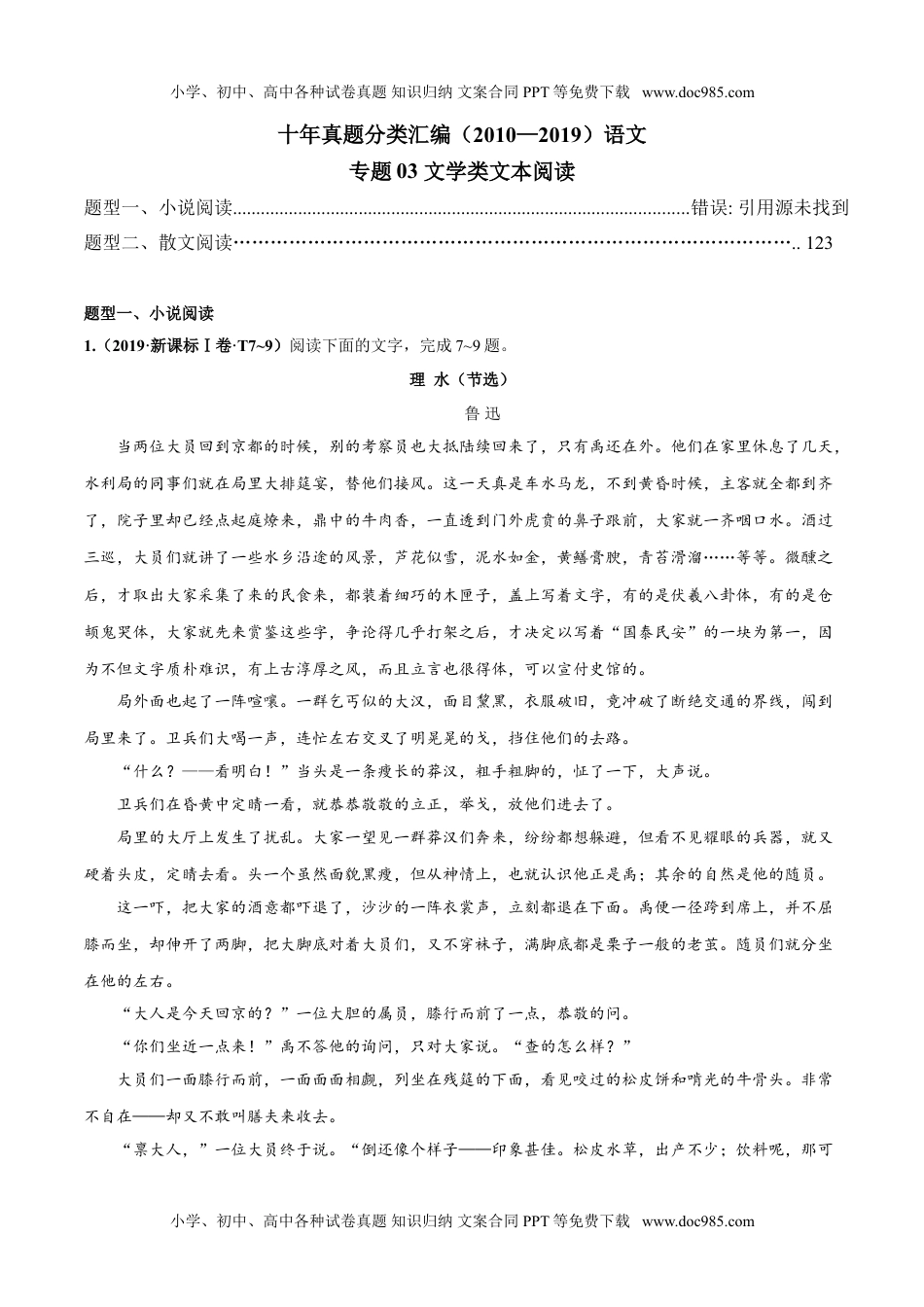 小学、初中、高中各种试卷真题知识归纳文案合同PPT等免费下载www.doc985.com十年真题分类汇编(2010—2019)语文专题03文学类文本阅读题型一、小说阅读..................................................................................................错误:引用源未找到题型二、散文阅读………………………………………………………………………………..123题型一、小说阅读1.(2019·新课标Ⅰ卷·T7~9)阅读下面的文字,完成7~9题。理水(节选)鲁迅当两位大员回到京都的时候,别的考察员也大抵陆续回来了,只有禹还在外。他们在家里休息了几天,水利局的同事们就在局里大排筵宴,替他们接风。这一天真是车水马龙,不到黄昏时候,主客就全都到齐了,院子里却已经点起庭燎来,鼎中的牛肉香,一直透到门外虎贲的鼻子跟前,大家就一齐咽口水。酒过三巡,大员们就讲了一些水乡沿途的风景,芦花似雪,泥水如金,黄鳝膏腴,青苔滑溜……等等。微醺之后,才取出大家采集了来的民食来,都装着细巧的木匣子,盖上写着文字,有的是伏羲八卦体,有的是仓颉鬼哭体,大家就先来赏鉴这些字,争论得几乎打架之后,才决定以写着“国泰民安”的一块为第一,因为不但文字质朴难识,有上古淳厚之风,而且立言也很得体,可以宣付史馆的。局外面也起了一阵喧嚷。一群乞丐似的大汉,面目黧黑,衣服破旧,竟冲破了断绝交通的界线,闯到局里来了。卫兵们大喝一声,连忙左右交叉了明晃晃的戈,挡住他们的去路。“什么?——看明白!”当头是一条瘦长的莽汉,粗手粗脚的,怔了一下,大声说。卫兵们在昏黄中定睛一看,就恭恭敬敬的立正,举戈,放他们进去了。局里的大厅上发生了扰乱。大家一望见一群莽汉们奔来,纷纷都想躲避,但看不见耀眼的兵器,就又硬着头皮,定睛去看。头一个虽然面貌黑瘦,但从神情上,也就认识他正是禹;其余的自然是他的随员。这一吓,把大家的酒意都吓退了,沙沙的一阵衣裳声,立刻都退在下面。禹便一径跨到席上,并不屈膝而坐,却伸开了两脚,把大脚底对着大员们,又不穿袜子,满脚底都是栗子一般的老茧。随员们就分坐在他的左右。“大人是今天回京的?”一位大胆的属员,膝行而前了一点,恭敬的问。“你们坐近一点来!”禹不答他的询问,只对大家说。“查的怎么样?”大员们一面膝行而前,一面面面相觑,列坐在残筵的下面,看见咬过的松皮饼和啃光的牛骨头。非常不自在——却又不敢叫膳夫来收去。“禀大人,”一位大员终于说。“倒还像个样子——印象甚佳。松皮水草,出产不少;饮料呢,那可小学、初中、高中各种试卷真题知识归纳文案合同PPT等免费下载www.doc985.com小学、初中、高中各种试卷真题知识归纳文案合同PPT等免费下载www.doc985.com丰富得很。百姓都很老实,他们是过惯了的。”“卑职可是已经拟好了募捐的计划,”又一位大员说。“准备开一个奇异食品展览会,另请女隗小姐来做时装表演,来看的可以多一点。”“这很好。”禹说着,向他弯一弯腰。“不过第一要紧的是赶快派一批大木筏去,把学者们接上高原来。”第三位大员说,“学者们有一个公呈在这里,他们以为文化是一国的命脉,学者是文化的灵魂,只要文化存在,华夏也就存在,别的一切,倒还在其次……”“他们以为华夏的人口太多了,”第一位大员道,“减少一些倒也是致太平之道。况且那些不过是愚民,那喜怒哀乐,也决没有智者所推想的那么精微的。……”“放他妈的屁!”禹心里想,但嘴上却大声的说道:“我经过查考,知道先前的方法:‘湮’,确是错误了。以后应该用‘导’!不知道诸位的意见怎么样?”静得好像坟山;大员们的脸上也显出死色,许多人还觉得自己生了病,明天恐怕要请病假了。“这是蚩尤的法子!”一个勇敢的青年官员悄悄的愤激着。“卑职的愚见,窃以为大人是似乎应该收回成命的。”一位白须白发的大员,这时觉得天下兴亡,系在他的嘴上了,便把心一横,置死生于度外,坚决的抗议道:“湮是老大人的成法。‘三年无改于父之道,可谓孝矣。’——老大人升天还不到三年。”禹一声也不响。“况且老大人化过多少心力呢。借了上帝的息壤,来湮洪水,虽然触了上帝的恼怒,洪水的深度可也浅了一点...
