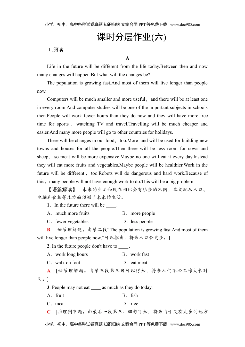 小学、初中、高中各种试卷真题知识归纳文案合同PPT等免费下载www.doc985.com课时分层作业(六)Ⅰ.阅读ALifeinthefuturewillbedifferentfromthelifetoday.Betweenthenandnowmanychangeswillhappen.Butwhatwillthechangesbe?Thepopulationisgrowingfast.Andmostofthemwilllivelongerthanpeoplenow.Computerswillbemuchsmallerandmoreuseful,andtherewillbeatleastoneineveryroom.Andcomputerstudieswillbeoneoftheimportantsubjectsinschoolsthen.Peoplewillworkfewerhoursthantheydonowandtheywillhavemorefreetimeforsports,watchingTVandtravel.Travellingwillbemuchcheaperandeasier.Andmanymorepeoplewillgotoothercountriesforholidays.Therewillbechangesinourfood,too.Morelandwillbeusedforbuildingnewtownsandhousesforallthepeople.Thentherewillbelessroomforcowsandsheep,someatwillbemoreexpensive.Maybenoonewilleatiteveryday.Insteadtheywilleatmorefruitsandvegetables.Maybepeoplewillbehealthier.Workinthefuturewillbedifferent,too.Robotswilldodangerousandhardwork.Becauseofthis,manypeoplewillnothaveenoughworktodo.Thiswillbeabigproblem.【语篇解读】未来的生活和现在相比会有很多的不同,本文就从人口、电脑和食物等几方面预测了未来的生活。1.Inthefuturetherewillbe.A.muchmorefruitsB.morepeopleC.fewervegetablesD.lesspeopleB[细节理解题。由第二段“Thepopulationisgrowingfast.Andmostofthemwilllivelongerthanpeoplenow.”可以推出,将来人口会更多。]2.Inthefuturepeopledon'thaveto.A.worklonghoursB.workfastC.walkonfootD.eatmeatA[细节理解题。由第三段第三句可以得知,将来人们不必工作太长时间。]3.Peoplemaynoteatasmuchastheydotoday.A.fruitB.fishC.meatD.riceC[推理判断题。由最后一段第三、四句可知,将来由于没有太多的地方小学、初中、高中各种试卷真题知识归纳文案合同PPT等免费下载www.doc985.com小学、初中、高中各种试卷真题知识归纳文案合同PPT等免费下载www.doc985.com饲养动物,肉的价格会上涨,人们可能不会每天吃肉了。]4.Onebigprobleminthefutureisthat.A.manypeopledon'thavetoworkB.manypeoplewillnotbeabletofindworkC.peoplehavetoworkfastD.alltheworkwillbedonebyrobotsB[细节理解题。由短文最后一段最后两句可以得出答案。]BSomepeoplearepessimistic(悲观的)whentheythinkaboutthefuture.Theysaythat,ahundredyearsfromnow,wewillhaveusedmostoftheearth'sresources.Wewillhavepollutedourseasbadly,andbeunabletoeatfishfromthem.Wewillhavemadetheairsodirtythatwewillneedtowearmasks.Theworld'spopulationwillhavedoubled,andwewillhaveusedallthecountrysideforhousing;therewillbenofarmlandleft.Otherpeoplebelievethatmanadaptsveryeasily.Theyhaveadifferentideaofthefuture.How,intheirviews,willpeoplebelivinginahundredyears'time?Onearchitect(建筑师)believesthatmanwillmoveofftheland.Hesuggeststhatthecityofthefuturewillbeahuge,pyramidshaped(金字塔形的)building,whichwillbefloatingonthesurfaceofthesea.About5,000familieswillbelivingthere,andthebuildingwillcontainshopsandschoolsaswellashomes.Bylivingonthesea,wewillgivefarmersmorelandtogrowcrops.Asforoil,peoplewillnolongerneedit:wewillbeheatingourhomeswithpowerfromthesun.Andwewillnotbeshortofminerals,becausethereareplentyunderouroceans.Atthemoment,wedonothavethetechnologytogetthemout.But,inahundredyears'time,theoptimistssay,thenewseacitieswillbeusingtheseresources.Whatwillbeintheshopsintheyear3000?Whatwillpeoplebewearing?Howwillpeoplebetravelling?Scientistswhomakepredictionsaboutthefuturesuggestthat,bytheyear3000,shopswillnolongerexist.Computerswillhavereplacedthem;andpeoplewillordergoodsfromhome.Peoplewillbewearingveryl...