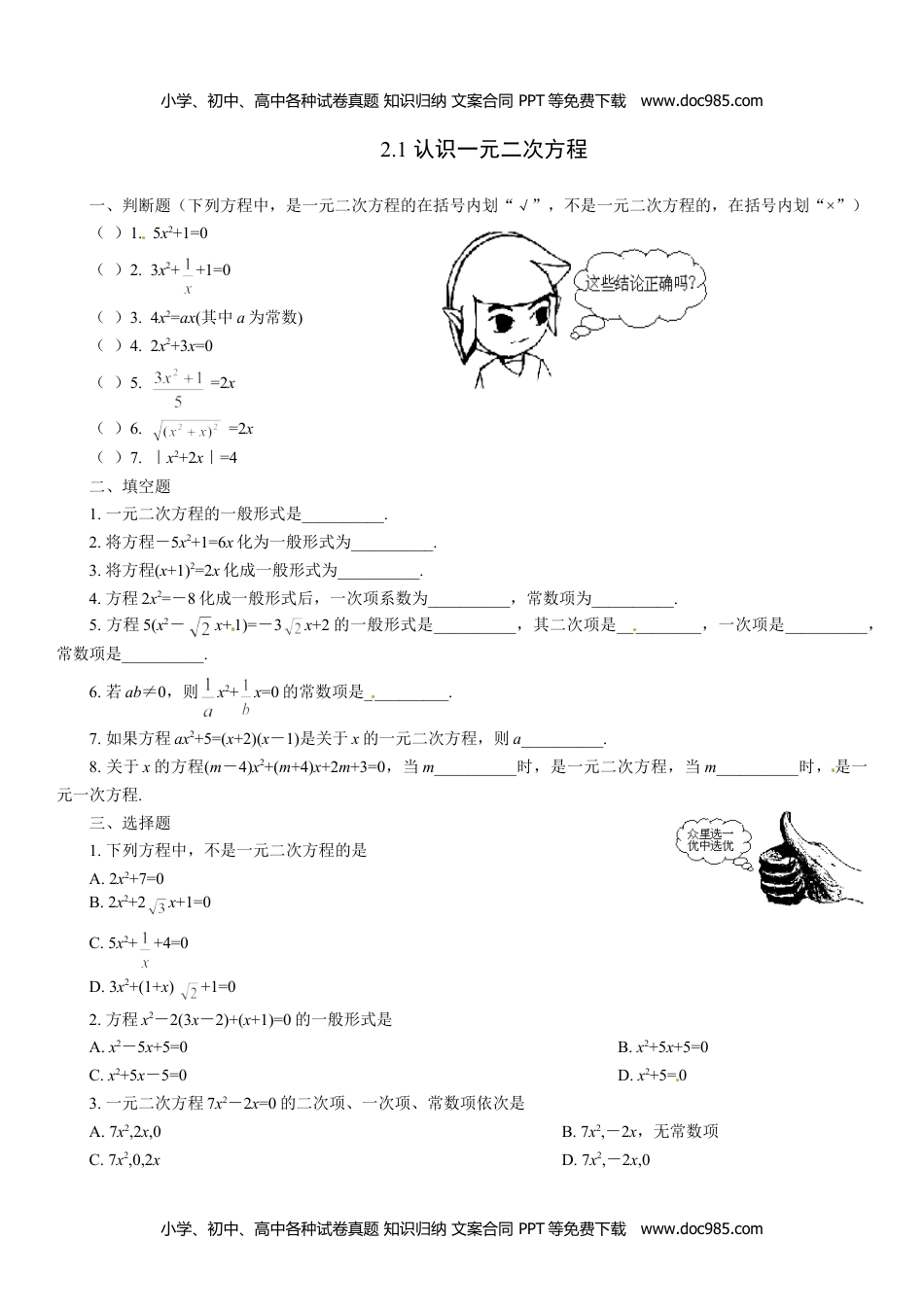 小学、初中、高中各种试卷真题知识归纳文案合同PPT等免费下载www.doc985.com2.1认识一元二次方程一、判断题(下列方程中,是一元二次方程的在括号内划“√”,不是一元二次方程的,在括号内划“×”)()1.5x2+1=0()2.3x2++1=0()3.4x2=ax(其中a为常数)()4.2x2+3x=0()5.=2x()6.=2x()7.|x2+2x|=4二、填空题1.一元二次方程的一般形式是__________.2.将方程-5x2+1=6x化为一般形式为__________.3.将方程(x+1)2=2x化成一般形式为__________.4.方程2x2=-8化成一般形式后,一次项系数为__________,常数项为__________.5.方程5(x2-x+1)=-3x+2的一般形式是__________,其二次项是__________,一次项是__________,常数项是__________.6.若ab≠0,则x2+x=0的常数项是__________.7.如果方程ax2+5=(x+2)(x-1)是关于x的一元二次方程,则a__________.8.关于x的方程(m-4)x2+(m+4)x+2m+3=0,当m__________时,是一元二次方程,当m__________时,是一元一次方程.三、选择题1.下列方程中,不是一元二次方程的是A.2x2+7=0B.2x2+2x+1=0C.5x2++4=0D.3x2+(1+x)+1=02.方程x2-2(3x-2)+(x+1)=0的一般形式是A.x2-5x+5=0B.x2+5x+5=0C.x2+5x-5=0D.x2+5=03.一元二次方程7x2-2x=0的二次项、一次项、常数项依次是A.7x2,2x,0B.7x2,-2x,无常数项C.7x2,0,2xD.7x2,-2x,0小学、初中、高中各种试卷真题知识归纳文案合同PPT等免费下载www.doc985.com小学、初中、高中各种试卷真题知识归纳文案合同PPT等免费下载www.doc985.com4.方程x2-=(-)x化为一般形式,它的各项系数之和可能是A.B.-C.D.5.若关于x的方程(ax+b)(d-cx)=m(ac≠0)的二次项系数是ac,则常数项为A.mB.-bdC.bd-mD.-(bd-m)6.若关于x的方程a(x-1)2=2x2-2是一元二次方程,则a的值是A.2B.-2C.0D.不等于27.关于x2=-2的说法,正确的是A.由于x2≥0,故x2不可能等于-2,因此这不是一个方程B.x2=-2是一个方程,但它没有一次项,因此不是一元二次方程C.x2=-2是一个一元二次方程D.x2=-2是一个一元二次方程,但不能解四、解答题现有长40米、宽30米场地,欲在中央建一游泳池,周围是等宽的便道及休息区,且游泳池与周围部分面积之比为3∶2,请给出这块场地建设的设计方案,并用图形及相关尺寸表示出来。小学、初中、高中各种试卷真题知识归纳文案合同PPT等免费下载www.doc985.com小学、初中、高中各种试卷真题知识归纳文案合同PPT等免费下载www.doc985.com参考答案一、1.√2.×3.√4.√5.√6.√7.√二、1.ax2+bx+c=0(a≠0)2.5x2+6x-1=03.x2+1=04.085.5x2-2x+3=05x2-2x36.07.≠18.≠4=4三、1.C2.A3.D4.D5.D6.A7.C四、设计方案:即求出满足条件的便道及休息区的宽度.若设便道及休息区宽度为x米,则游泳池面积为(40-2x)(30-2x)米2,便道及休息区面积为2[40x+(30-2x)x]米2,依题意,可得方程:(40-2x)(30-2x)∶2[40x+(30-2x)x]=3∶2由此可求得x的值,即可得游泳池长与宽.小学、初中、高中各种试卷真题知识归纳文案合同PPT等免费下载www.doc985.com