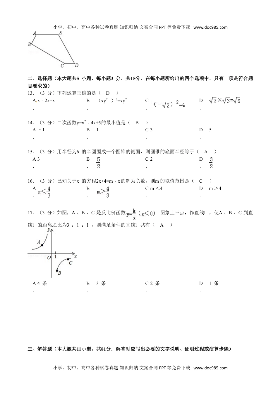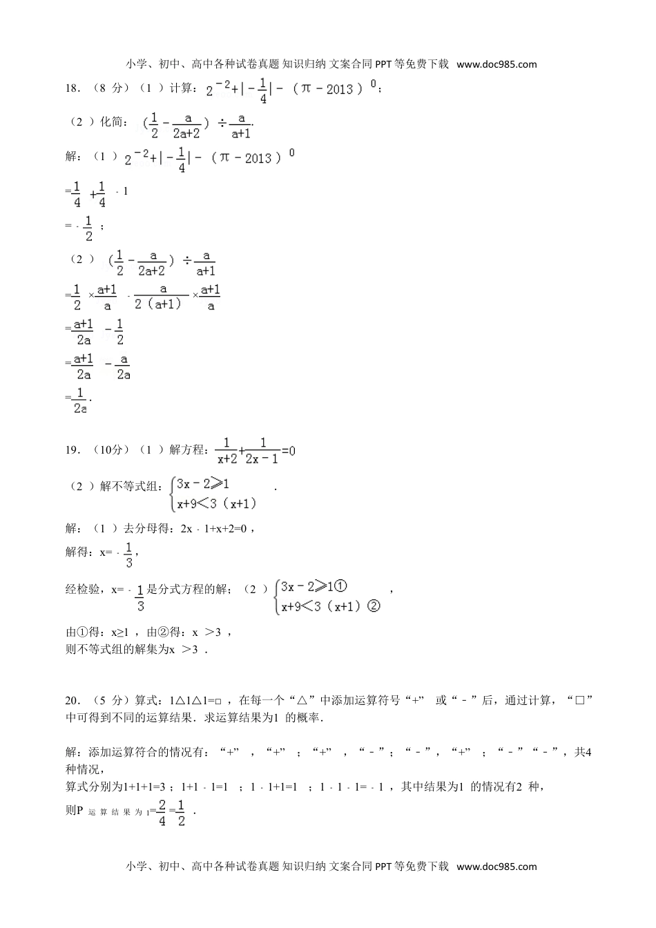 小学、初中、高中各种试卷真题知识归纳文案合同PPT等免费下载www.doc985.com2013年江苏省镇江市中考数学试卷一、填空题(本大题共12小题,每小题2分,共24分)1.(2分)的相反数是﹣.2.(2分)计算:(﹣2)×=﹣1.3.(2分)若在实数范围内有意义,则x的取值范围是x≥1.4.(2分)化简:(x+1)22x=﹣x2+1.5.(2分)若x3=8,则x=2.6.(2分)如图,AD平分△ABC的外角∠EAC,且ADBC∥,若∠BAC=80°,则∠B=50°.7.(2分)有一组数据:2,3,5,5,x,它们的平均数是10,则这组数据的众数是5.8.(2分)写一个你喜欢的实数m的值0,使关于x的一元二次方程x2x+m=0﹣有两个不相等的实数根.9.(2分)已知点P(a,b)在一次函数y=4x+3的图象上,则代数式4ab2﹣﹣的值等于﹣5.10.(2分)如图,AB是半圆O的直径,点P在AB的延长线上,PC切半圆O于点C,连接AC.若∠CPA=20°,则∠A=35°.11.(2分)地震中里氏震级增加1级,释放的能量增大到原来的32倍,那么里氏7级地震释放的能量是3级地震释放能量的324倍.12.(2分)如图,五边形ABCDE中,ABBC⊥,AECD∥,∠A=E=120°∠,AB=CD=1,AE=2,则五边形ABCDE的面积等于.小学、初中、高中各种试卷真题知识归纳文案合同PPT等免费下载www.doc985.com小学、初中、高中各种试卷真题知识归纳文案合同PPT等免费下载www.doc985.com二、选择题(本大题共5小题,每小题3分,共15分.在每小题所给出的四个选项中,只有一项是符合题目要求的)13.(3分)下列运算正确的是(D)A.x2x=x﹣B.(xy2)0=xy2C.D.14.(3分)二次函数y=x24x+5﹣的最小值是(B)A.﹣1B.1C.3D.515.(3分)用半径为6的半圆围成一个圆锥的侧面,则圆锥的底面半径等于(A)A.3B.C.2D.16.(3分)已知关于x的方程2x+4=mx﹣的解为负数,则m的取值范围是(C)A.B.C.m<4D.m>417.(3分)如图,A、B、C是反比例函数图象上三点,作直线l,使A、B、C到直线l的距离之比为3:1:1,则满足条件的直线l共有(A)A.4条B.[来源:学§科§网]3条C.2条D.1条三、解答题(本大题共11小题,共81分.解答时应写出必要的文字说明、证明过程或演算步骤)小学、初中、高中各种试卷真题知识归纳文案合同PPT等免费下载www.doc985.com小学、初中、高中各种试卷真题知识归纳文案合同PPT等免费下载www.doc985.com18.(8分)(1)计算:;(2)化简:.解:(1)=1﹣=﹣;(2)=×﹣×===.19.(10分)(1)解方程:(2)解不等式组:.解:(1)去分母得:2x1+x+2=0﹣,解得:x=﹣,经检验,x=﹣是分式方程的解;(2),由①得:x≥1,由②得:x>3,则不等式组的解集为x>3.20.(5分)算式:111=□△△,在每一个“△”中添加运算符号“+”或“﹣”后,通过计算,“□”中可得到不同的运算结果.求运算结果为1的概率.解:添加运算符合的情况有:“+”,“+”;“+”,“﹣”;“﹣”,“+”;“﹣”“﹣”,共4种情况,算式分别为1+1+1=3;1+11=1﹣;11+1=1﹣;111=1﹣﹣﹣,其中结果为1的情况有2种,则P运算结果为1==.小学、初中、高中各种试卷真题知识归纳文案合同PPT等免费下载www.doc985.com小学、初中、高中各种试卷真题知识归纳文案合同PPT等免费下载www.doc985.com21.(6分)如图,ABCD∥,AB=CD,点E、F在BC上,且BE=CF.(1)求证:△ABEDCF△≌;(2)试证明:以A、F、D、E为顶点的四边形是平行四边形.证明:(1)如图, ABCD∥,∴∠B=C∠. 在△ABE与△DCF中,,∴△ABEDCF≌△(SAS);(2)如图,连接AF、DE.由(1)知,△ABEDCF≌△,∴AE=DF,∠AEB=DFC∠,∴∠AEF=DFE∠,∴AEDF∥,∴以A、F、D、E为顶点的四边形是平行四边形.22.(6分)某市对一大型超市销售的甲、乙、丙3种大米进行质量检测.共抽查大米200袋,质量评定分为A、B两个等级(A级优于B级),相应数据的统计图如下:根据所给信息,解决下列问题:(1)a=55,b=5;(2)已知该超市现有乙种大米750袋,根据检测结果,请你估计该超市乙种大米中有多少袋B级大米?(3)对于该超市的甲种和丙种大米,你会选择购买哪一种?运用统计知识简述理由.小学、初中、高中各种试卷真题知识...