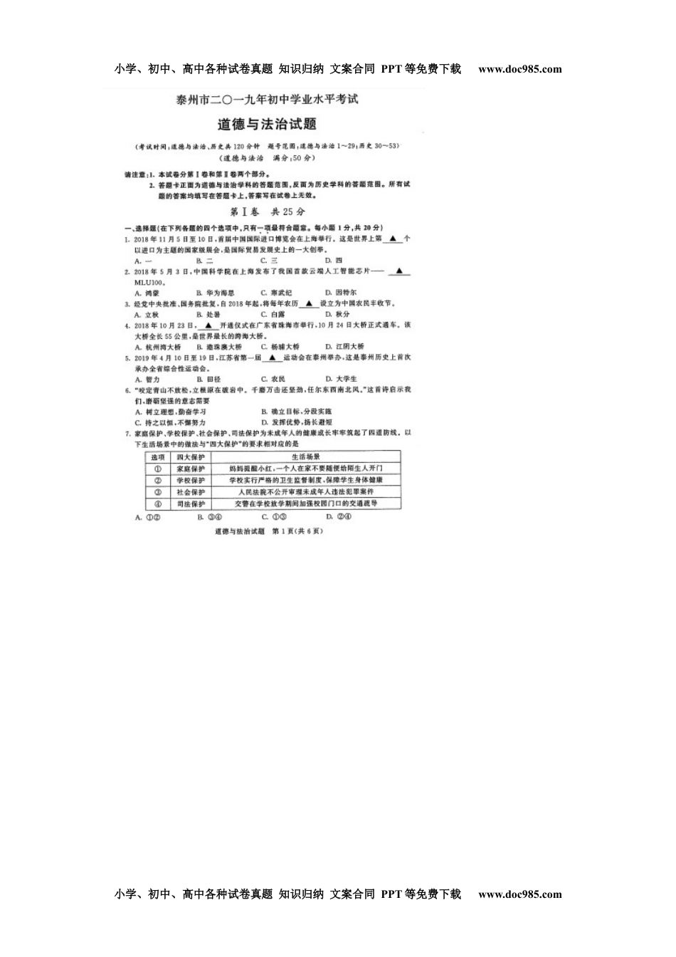 2019年江苏泰州道法试卷(图片word版)历年中考真题 电子版免费下载.docx本文件免费下载 【共6页】