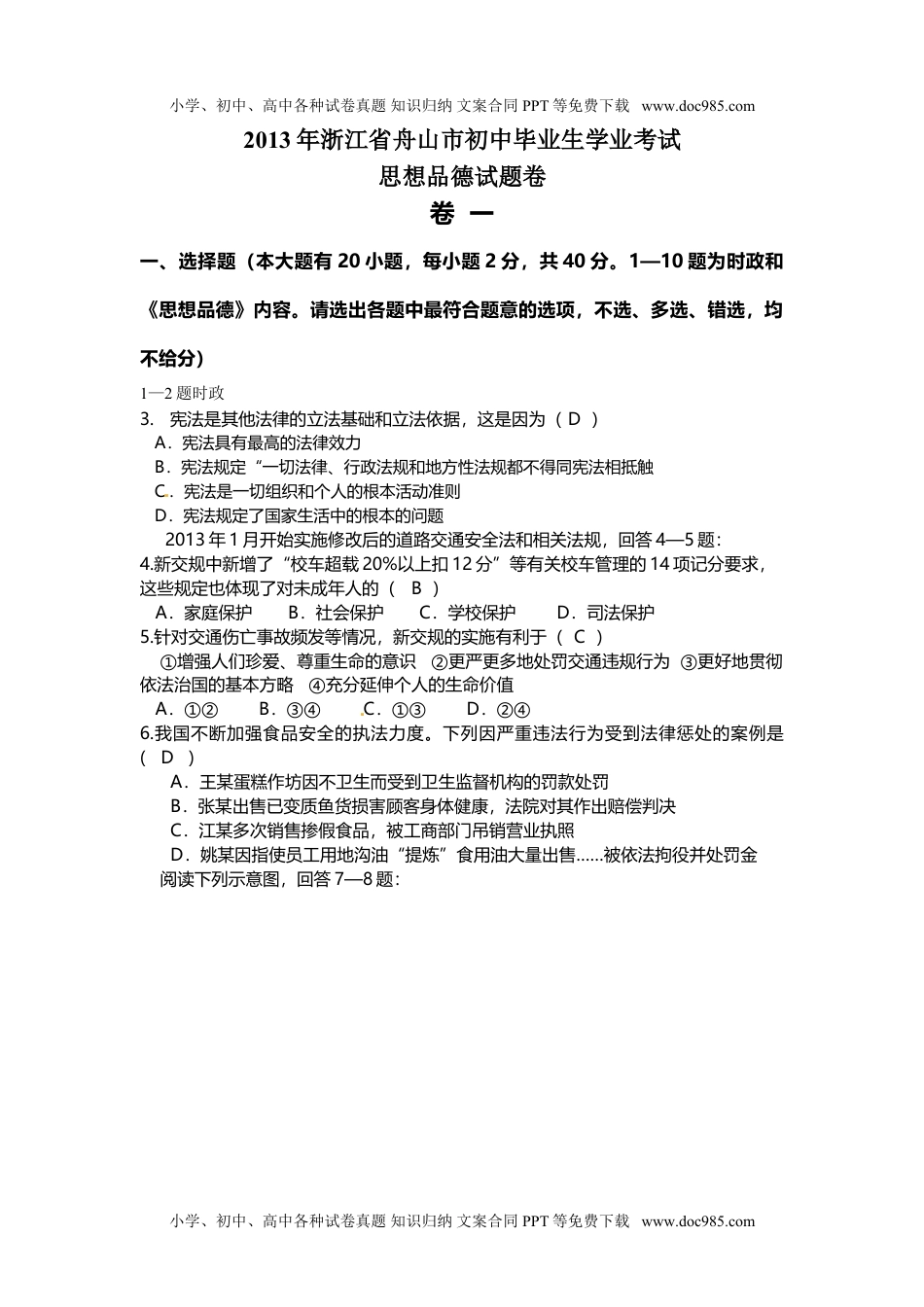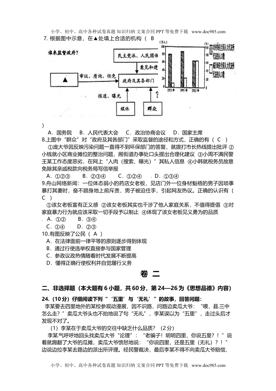 小学、初中、高中各种试卷真题知识归纳文案合同PPT等免费下载www.doc985.com2013年浙江省舟山市初中毕业生学业考试思想品德试题卷卷一一、选择题(本大题有20小题,每小题2分,共40分。1—10题为时政和《思想品德》内容。请选出各题中最符合题意的选项,不选、多选、错选,均不给分)1—2题时政3.宪法是其他法律的立法基础和立法依据,这是因为(D)A.宪法具有最高的法律效力B.宪法规定“一切法律、行政法规和地方性法规都不得同宪法相抵触C.宪法是一切组织和个人的根本活动准则D.宪法规定了国家生活中的根本的问题2013年1月开始实施修改后的道路交通安全法和相关法规,回答4—5题:4.新交规中新增了“校车超载20%以上扣12分”等有关校车管理的14项记分要求,这些规定也体现了对未成年人的(B)A.家庭保护B.社会保护C.学校保护D.司法保护5.针对交通伤亡事故频发等情况,新交规的实施有利于(C)①增强人们珍爱、尊重生命的意识②更严更多地处罚交通违规行为③更好地贯彻依法治国的基本方略④充分延伸个人的生命价值A.①②B.③④C.①③D.②④[来源:Zxxk.Com]6.我国不断加强食品安全的执法力度。下列因严重违法行为受到法律惩处的案例是(D)A.王某蛋糕作坊因不卫生而受到卫生监督机构的罚款处罚B.张某出售已变质鱼货损害顾客身体健康,法院对其作出赔偿判决C.江某多次销售掺假食品,被工商部门吊销营业执照D.姚某因指使员工用地沟油“提炼”食用油大量出售……被依法拘役并处罚金阅读下列示意图,回答7—8题:小学、初中、高中各种试卷真题知识归纳文案合同PPT等免费下载www.doc985.com小学、初中、高中各种试卷真题知识归纳文案合同PPT等免费下载www.doc985.com7.根据图中示意,在▲处填上合适的机构(B)A.国务院B.人民代表大会C.政治协商会议D.国家主席8.上图中“群众”对“政府及其各部门”采取监督的途径和方式,正确的有(C)①庞大爷因反映污染问题一直得不到环保部门的答复,就拨打市长热线提出批评②小钱就小区商业摊位的整治问题,厢街道办事处口头提出合理化建议③小周不满民警王某工作态度恶劣,在网上“人肉(搜索、曝光)”其私人信息④小韩就税务员故意免除其亲戚税款向税务局写信举报A.①②③B.②③④C.①②④D.①③④9.舟山网络新闻:一位体态弱小的药店女老板,见店门外一位身材魁梧的男子因琐事暴打其妻时,奋不顾身地上前斥责,男子被迫住手,引起网友热议。正确的认识有(C)①该女老板富有正义感②该女老板其实也干涉了他人家庭关系,不值得提倡③对家庭暴力行为就应该采取一切手段予以制止④体现了该女老板见义勇为的品质A.①②B.③④C.①④D.②③10.有图反映了公民(A)A.在法律面前一律平等的原则逐步得到体现B.通过行使选举权直接参与国家管理C.参政议政热情随着时代发展不断提高D.懂得正确行使权利并自觉履行义务卷二二、非选择题(本大题有6小题,共60分,第24—26为《思想品德》内容)24.(10分)仔细阅读下列“‘五里’与‘无礼’”的故事,回答问题:李某要去四里地外的某校参观动漫展,因不识路,问路边卖瓜大爷:“喂,县三中怎么走?”卖瓜大爷头也不抬地说了句“无礼”,李某误以为“五里”,走过头后才发现不对了。(1)李某在于卖瓜大爷的交往中缺乏什么品质?(2分)李某气呼呼地回头找卖瓜大爷“论理”:“老骗子!明明四里,你说五里?!”说着就踢翻了大爷的瓜摊,卖瓜大爷愤怒地说:“你说四里,还是五里(无礼)?!”边说边拉李某去路边的派出所评理。经民警裁决,最后李某不得不向卖瓜大爷赔偿、小学、初中、高中各种试卷真题知识归纳文案合同PPT等免费下载www.doc985.com小学、初中、高中各种试卷真题知识归纳文案合同PPT等免费下载www.doc985.com道歉。(2)李某必须向卖瓜大爷赔偿、道歉的法律根据是什么?(3)李某应从此事中吸取哪些教训?(2分)如果再现上述情景时,请具体描述李某该如何“问路”和消除“误解”?(2分)[来源:学#科#网]25.(8分)根据情景,回答问题:暑期来自嘉兴和舟山不同学校的20名同学参加了中韩少年国际文化交流活动,以下是部分情景:26.(12分)2011年6月国务院批准设...