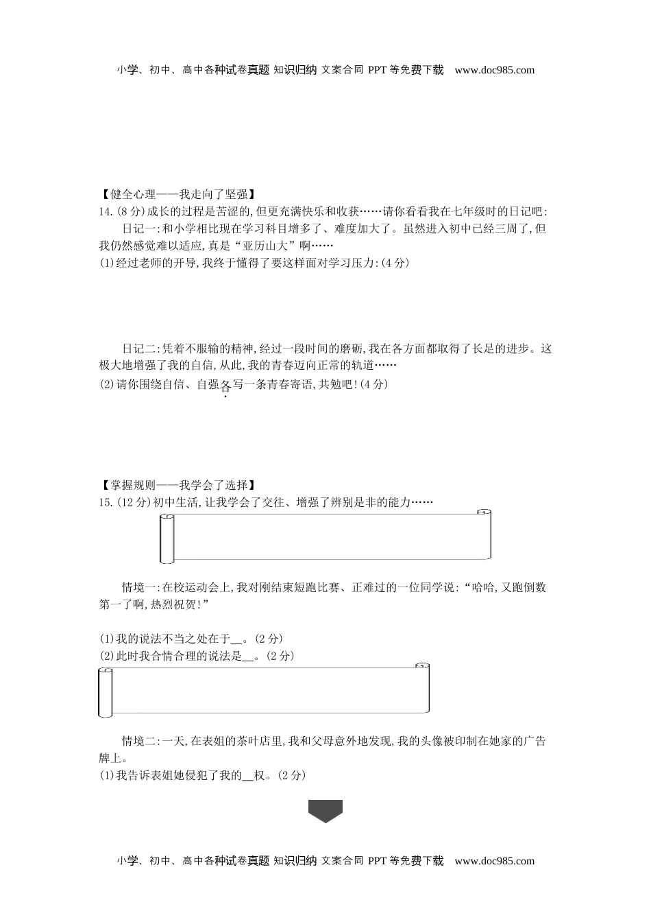 小、初中、高中各卷知文案合同学种试真题识归纳PPT等免下费载www.doc985.com2014年安徽省初中毕业学业考试思想品德部分4A(满分:80分时间:与历史共用120分钟开卷)一、单项选择题(下列各题4个备选答案中,只有1个是最符合题意的。共24分,12小题,每小题2分)1.2013年4月19日,中央政治局召开会议,决定从2013年下半年起,用一年左右时间,在全党自上而下分批开展党的教育实践活动。()A.廉政建设B.群众路线C.保持先进性D.科学发展观2.2013年8月,国务院正式批准设立中国()自由贸易试验区。()A.北京B.广州C.上海D.合肥3.2013年12月14日,中国探测器在月球表面预选着陆区域成功着陆。()A.天宫一号B.天宫二号C.嫦娥一号D.嫦娥三号4.2014年2月27日,十二届全国人大常委会第七次会议经表决通过了两个决定,分别将9月3日确定为纪念日,将12月13日确定为死难者国家公祭日。()A.中国人民抗日战争胜利旅顺大屠杀B.中国人民解放战争胜利唐山大地震C.中国人民抗日战争胜利南京大屠杀D.中国人民解放战争胜利汶川大地震5.央视2014年5月11日播出的《中国成语大会》节目,展现了中国成语独有的语境之美。下列成语寓意相同的是()①悬梁刺股②三顾茅庐③映雪读书④凿壁偷光A.①②③B.①②④C.①③④D.②③④6.2014年全国中小学生安全教育日的主题为“强化安全意识,提升安全素养”。下列行为能体现这一主题的是()①不在楼梯或狭窄的通道嬉戏打闹②雨天打雷时,立即到大树下面躲避③不得随意食用野菌、野菜、野果子④暑假,和小伙伴们偷偷到河里游泳A.①②B.①③C.②④D.③④7.某校严格遵照有关规定,禁止在校园内吸烟。此举()①能杜绝未成年人沾染不良行为②为未成年人的健康成长营造了良好的家庭环境③体现了对未成年人的学校保护④有利于引导未成年人分辨是非,做出正确选择A.①②B.①④C.②③D.③④8.《增广贤文》曰:“鸦有反哺之孝,羊知跪乳之恩。”这句话给我们的启示是()A.子女对父母的要求应全顺从B.子女要懂得感恩和回报父母C.父母对子女的爱是伟大无私的D.父母对子女要尽到抚养的义务小、初中、高中各卷知文案合同学种试真题识归纳PPT等免下费载www.doc985.com小、初中、高中各卷知文案合同学种试真题识归纳PPT等免下费载www.doc985.com9.做人要讲诚信,但做到诚信的具体条件又是复杂的。对此,下列说法正确的是()A.大事情不能说谎,小事情可以说谎B.善意的谎言,并不违背诚信的道德C.为了表明自己的诚实,可以泄露朋友的隐私D.不论什么情况,医生都对病人说真实的病情10.右面漫画告诉我们,跳广场舞()A.有益人的身心健康,要多跳B.影响他人休息,应坚决取缔C.丰富了人们的业余文化生活D.也要懂得尊重其他人的权利11.随着电视剧《来自星星的你》的热播,男主角金秀贤成了众多少男少女崇拜的偶像。小梅连金秀贤是哪国人都不知道也跟着痴迷起来。对此,你给小梅的正确建议是()①对从众心理和好奇心要坚决消除②应该发展自己独立思考和自我控制能力③盲目从众是一种正常的心理现象④要克服盲目从众,理智把握自己的行为A.②④B.③④C.①②D.①③12.2013年最高人民法院通过多种媒体直播社会关注案件庭审情况,加大庭审公开力度。庭审公开()A.有利于保障法律有效实施和司法公正B.表明我国已经完善了监督和制约机制C.表明在我国公民行使监督权享有立法保障D.表明舆论监督是保证司法公正的唯一途径二、非选择题(共56分,5小题)【扣好第一扣——我们提高了觉悟】13.(8分)各位同学大家好,和你一样,我也正在考场考试。记得前不久习近平总书记说过青年处在价值观形成和确立时期,抓好这一时期的价值观养成十分重要。这就像穿衣服扣扣子一样,如果第一粒扣子扣错了,剩余的扣子都会扣错。这不禁让我想起刚进入初中时的两个生活镜头——(1)从公民层面看,镜头一、二分别倡导的社会主义核心价值观是:(2分)镜头一:镜头二:(2)请任选··其中一个镜头,结合所学知识,谈谈你打算如何响应这一倡导。(6分)小、初中、高中各卷知文案合同学种试真题识归纳PPT等免下费载www.doc985.com小、初中、高中各卷知文案合同学种试真题识归纳PPT等免下费载www.doc985.com【健全心理——我走向了坚强】14.(8分)成长的过程是苦涩的,但更充满快乐和收获……请你看看我在...