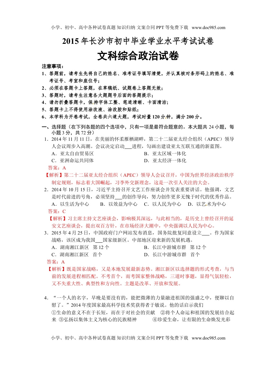 小学、初中、高中各种试卷真题知识归纳文案合同PPT等免费下载www.doc985.com2015年长沙市初中毕业学业水平考试试卷文科综合政治试卷注意事项:1、答题前,请考生先将自己的姓名、准考证号填写清楚,并认真核对条形码上的姓名、准考证号、考室和座位号;[来源:Zxxk.Com]2、必须在答题卡上答题,在草稿纸、试题卷上答题无效;3、答题时,请考生注意各大题题号后面的答题提示;4、请勿折叠答题卡,保持字体工整、笔迹清晰、卡面清洁;5、答题卡上不得使用涂改液、涂改胶和贴纸;6、本学科为开卷考试,全卷共六道大题,考试时量120分钟,满分200分。一、选择题(在下列各题的四个选项中,只有一项是最符合题意的。本大题共24小题,每小题3分,共72分)1.2014年11月11日,在美丽的怀柔雁栖湖畔,第二十二届亚太经合组织(APEC)领导人会议周步入高潮。会议决定启动进程,勾画出建设亚太互联互通的新蓝图。A.亚太自由贸易区B.亚太区域一体化C.亚洲命运共同体D.亚太经济一体化答案:A【解析】第二十二届亚太经合组织(APEC)领导人会议召开,中国为世界经济政治秩序制定规则,标志着大国崛起,习李外交新理念,这是一次引人关注的大会。2.2014年10月15日,习近平主持召开文艺工作座谈会并发表重要讲话。他强调,文艺是时代前进的号角,必须坚持的创作导向,努力创作更多无愧于时代的优秀作品。A.以生活为中心B.以效益为中心C.以人民为中心D.以艺术为中心答案:C【解析】习主席主持文艺座谈会,影响极其深远,与此相当的,是历史上曾经召开的延安文艺座谈会,提出双百方针,在市场经济大潮中,中央强调以人民为中心。3.2015年4月25日,中国政府门户网站发布消息,国务院批复同意设立。作为国家战略,该区成为我国国家级新区。中部地区迎来新的发展机遇。A.湖南湘江新区第12个B.长江中游城市群第12个C.湖南湘江新区首个D.长江中游城市群首个答案:A【解析】既是国家战略,又是本地发展最新态势。湘江新区以选择题的形式考查,与当前的发展进程相匹配。不考首个,而考国家整体战略,三道时事题,显得气氛轻松,又不失重大性、典型性和方向性。主题是改革、开放和发展。4.“一个人的名字,早晚是要没有的,能把微薄的力量融进祖国的强盛之中,便聊以自慰了。”2014年度国家最高科学技术奖获得者于敏说。他的话启示我们①生命的意义不在于长短,而在于对社会的贡献②将个人命运和祖国的发展结合起来③弘扬以集体主义为核心的民族精神④珍爱生命,让有限的生命焕发光彩小学、初中、高中各种试卷真题知识归纳文案合同PPT等免费下载www.doc985.com小学、初中、高中各种试卷真题知识归纳文案合同PPT等免费下载www.doc985.comA.①②③B.①③④C.②③④D.①②④答案:D【解析】坚持正确的价值导向,激发正能量,先进人物事迹的感召作用。于敏的话体现了个人与国家的关系。③弘扬以集体主义为核心的民族精神观点错误,④珍爱生命,让有限的生命焕发光彩,对生命的理解要全面。5.城关中学积极开展学生社团活动,校园里有文学社、书画社、足球社、摄影社、礼仪社……丰富多彩的活动促进了学生多元发展。中学生参加社团活动有利于①培养高雅的生活情趣②增强社会实践的能力③磨砺坚强的意志品质④消除学习带来的压力A.①②③B.②③④C.①③④D.①②④答案:A【解析】回归学校生活,材料中隐含信息,摄影社、礼仪社对增强社会实践能力是有帮助的,足球社对于磨砺坚强的意志品质有帮助。④消除学习带来的压力本身观点错误。6.友善是中华民族的传统美德。中华民族历来提倡厚德载物、和谐共处。友善已渗透到了我们民族心理和思维方式之中。下列语句体现了这一美德的有①己所不欲,勿施于人②人不为己,天诛地灭③勿以恶小而为之,勿以善小而不为④笑一笑,十年少;愁一愁,白了头A.①②B.①③C.①④D.③④答案:B【解析】直接考查社会主义核心价值观友善,友善是中华民族的传统美德。厚德载物、和谐共处,己所不欲,勿施于人,勿以恶小而为之,勿以善小而不为都是我最喜欢的处世原则。还有“授人玫瑰,手留余香”,只是它不是我们民族传统语言。④笑一笑,十年少;愁一愁,白了...