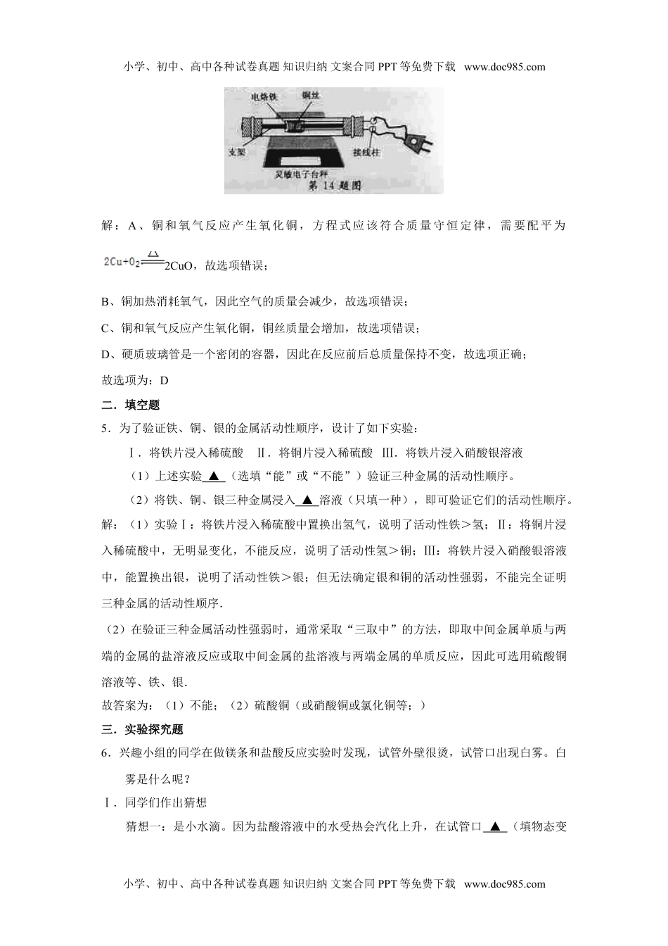 小学、初中、高中各种试卷真题知识归纳文案合同PPT等免费下载www.doc985.com浙江省衢州市2015年中考化学试卷本卷可能用到的相对原子质量:H-1C-12O-16Na-23Cl-35.5Ca-40Cu-64Ba-1371.科学家发现一种新元素。该元素原子核外电子数为117,中子数为174,相对原子质量为291,元素名称Ununseptium,符号Uus。请模仿甲,将该元素对应信息编写到图乙中相应位置,“①”处应填()A.291B.174C.117D.57解:科学家发现一种新元素,该元素原子核外电子数为117,根据原子序数=核电荷数=质子数=核外电子数,则其原子序数为117;根据元素周期表中的一格可知,“①”处表示的应为原子序数,则应填117.故选:C示意图。下列说法A.该反应属于分解反应B.甲烷是无机物C.甲烷中碳、氢元素质量比为1:4D.单中心铁催化剂改变了反应速度,反应后本身质量减少的化学方程为:小学、初中、高中各种试卷真题知识归纳文案合同PPT等免费下载www.doc985.com小学、初中、高中各种试卷真题知识归纳文案合同PPT等免费下载www.doc985.com操作与目的分选项操作目的A用剩的食盐放回原试剂瓶避免浪费B天平调平后在左、右托盘中各垫一张相同的纸保证称取的食盐质量更准确C用50ml量筒替代天平量取所需的水更加简便D溶解时用玻璃棒搅拌增加食盐的溶解能力解:A、对化学实验中的剩余药品,不能放回原瓶,以免污染试剂,故选项说法错误.B、天平调平后在左、右托盘中各垫一张相同的纸,并不是为了保证称取的食盐质量更准确,而是因为防止避免污染天平,故选项说法错误.C、用50mL量筒替代天平量取所需的水,更加简便,故选项说法正确.D、溶解时用玻璃棒搅拌,是为了加速食盐的溶解速率,而不是食盐的溶解能力,故选项说法错误.故选:C4.如图为小柯做的创新实验:将铜丝绕在电烙铁上,电烙铁用支架固定在密闭的硬质玻璃管中,玻璃管置于灵敏电子台秤上。接通电路,电烙铁开始工作,可以观察到铜丝表面逐渐变黒,电子台秤读数保持不变。下列说法正确的是()A.该反应的化学方程式为Cu+O2=2CuOB.加热过程中,玻璃管内空气的质量保持不变C.加热过程中,铜丝的质量保持不变D.硬质玻璃管内物质在反应前后总质量保持不变小学、初中、高中各种试卷真题知识归纳文案合同PPT等免费下载www.doc985.com小学、初中、高中各种试卷真题知识归纳文案合同PPT等免费下载www.doc985.com解:A、铜和氧气反应产生氧化铜,方程式应该符合质量守恒定律,需要配平为2CuO,故选项错误;B、铜加热消耗氧气,因此空气的质量会减少,故选项错误;C、铜和氧气反应产生氧化铜,铜丝质量会增加,故选项错误;D、硬质玻璃管是一个密闭的容器,因此在反应前后总质量保持不变,故选项正确;故选项为:D二.填空题5.为了验证铁、铜、银的金属活动性顺序,设计了如下实验:Ⅰ.将铁片浸入稀硫酸Ⅱ.将铜片浸入稀硫酸Ⅲ.将铁片浸入硝酸银溶液(1)上述实验▲(选填“能”或“不能”)验证三种金属的活动性顺序。(2)将铁、铜、银三种金属浸入▲溶液(只填一种),即可验证它们的活动性顺序。解:(1)实验Ⅰ:将铁片浸入稀硫酸中置换出氢气,说明了活动性铁>氢;Ⅱ:将铜片浸入稀硫酸中,无明显变化,不能反应,说明了活动性氢>铜;Ⅲ:将铁片浸入硝酸银溶液中,能置换出银,说明了活动性铁>银;但无法确定银和铜的活动性强弱,不能完全证明三种金属的活动性顺序.(2)在验证三种金属活动性强弱时,通常采取“三取中”的方法,即取中间金属单质与两端的金属的盐溶液反应或取中间金属的盐溶液与两端金属的单质反应,因此可选用硫酸铜溶液等、铁、银.故答案为:(1)不能;(2)硫酸铜(或硝酸铜或氯化铜等;)三.实验探究题6.兴趣小组的同学在做镁条和盐酸反应实验时发现,试管外壁很烫,试管口出现白雾。白雾是什么呢?Ⅰ.同学们作出猜想猜想一:是小水滴。因为盐酸溶液中的水受热会汽化上升,在试管口▲(填物态变小学、初中、高中各种试卷真题知识归纳文案合同PPT等免费下载www.doc985.com小学、初中、高中各种试卷真题知识归纳文案合同PPT等免费下载www.doc985.com化名称)成小水滴。猜想二:是盐酸小液滴。因为浓盐酸具有▲...