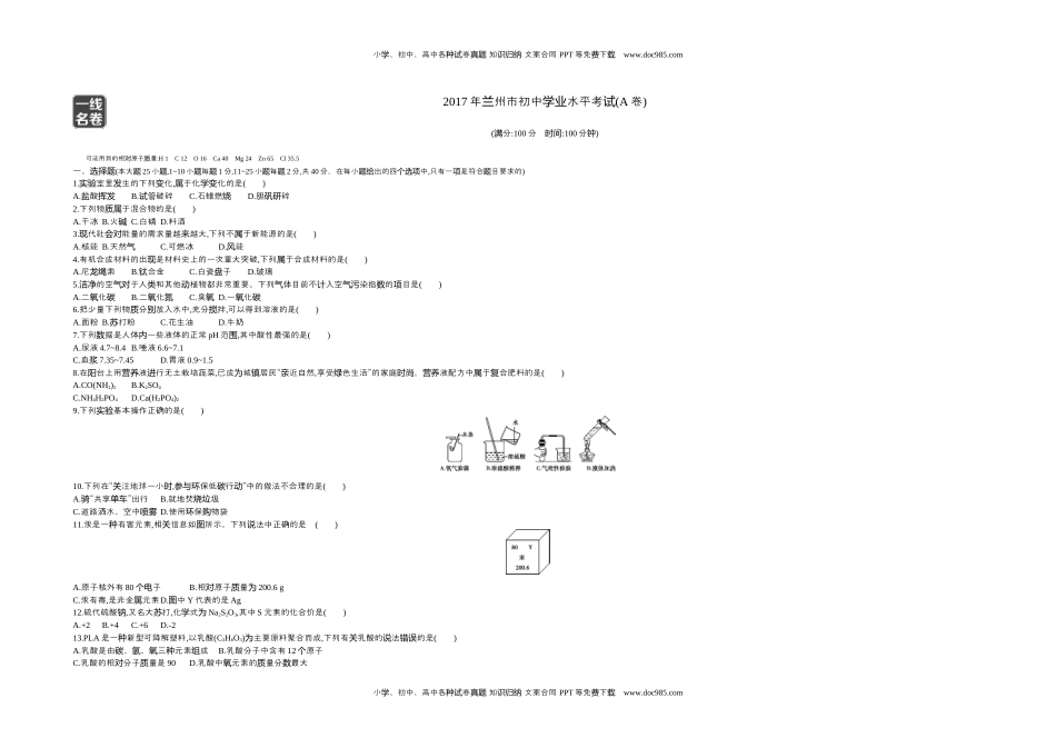 小、初中、高中各卷知文案合同学种试真题识归纳PPT等免下费载www.doc985.com2017年州市初中水平考兰学业试(A卷)(分满:100分时间:100分钟)可能用到的相原子量对质:H1C12O16Ca40Mg24Zn65Cl35.5一、选择题(本大题25小题,1~10小每题题1分,11~25小每题题2分,共40分。在每小出的四中题给个选项,只有一是符合目要求的项题)1.室里生的下列化实验发变,于化化的是属学变()A.酸盐挥发B.管破碎试C.石蜡燃烧D.胆碎矾研2.下列物于混合物的是质属()A.干冰B.火碱C.白磷D.料酒3.代社能量的需求量越越大现会对来,下列不于新能源的是属()A.核能B.天然气C.可燃冰D.能风4.有机合成材料的出是材料史上的一次重大突破现,下列于合成材料的是属()A.尼索龙绳B.合金钛C.白瓷子盘D.玻璃5.的空于人和其他植物都非常重要。下列体目前不入空染指的目是洁净气对类动气计气污数项()A.二化氧碳B.二化氧氮C.臭氧D.一化氧碳6.把少量下列物分放入水中质别,充分拌搅,可以得到溶液的是()A.面粉B.打粉苏C.花生油D.牛奶7.下列据是人体一些液体的正常数内pH范围,其中酸性最强的是()A.尿液4.7~8.4B.唾液6.6~7.1C.血浆7.35~7.45D.胃液0.9~1.58.在台上用液行无土栽培蔬菜阳营养进,已成城居民“近自然为镇亲,享受色生活”的家庭。液配方中于合肥料的是绿时尚营养属复()A.CO(NH2)2B.K2SO4C.NH4H2PO4D.Ca(H2PO4)29.下列基本操作正确的是实验()10.下列在“注地球一小关时,保低行”中的做法不合理的是参与环碳动()A.“共享”出行骑单车B.就地焚圾烧垃C.道路洒水、空中喷雾D.使用保物袋环购11.汞是一有害元素种,相信息如所示。下列法中正确的是关图说()A.原子核外有80子个电B.相原子量对质为200.6gC.汞有毒,是非金元素属D.中图Y代表的是Ag12.硫代硫酸钠,又名大打苏,化式学为Na2S2O3,其中S元素的化合价是()A.+2B.+4C.+6D.-213.PLA是一新型可降解塑料种,以乳酸(C3H6O3)主要原料聚合而成为,下列有乳酸的法的是关说错误()A.乳酸是由、、三元素成碳氢氧种组B.乳酸分子中含有12原子个C.乳酸的相分子量是对质90D.乳酸中元素的量分最大氧质数小、初中、高中各卷知文案合同学种试真题识归纳PPT等免下费载www.doc985.com小、初中、高中各卷知文案合同学种试真题识归纳PPT等免下费载www.doc985.com14.下列于四粒子的示意法正确的是关种结构图说()A.①、②的化性相似学质B.②所示的粒子符号为NaC.③在化反中易失去子学应电D.④中X可能为815.“84消毒”是以次酸主要有效成分的消毒液。制次酸的原理可表示剂氯钠为备氯钠为:2NaOH+Cl2NaClO+X+H2O,则X的化式是学()A.Na2OB.NaClC.NaHD.NaClO316.如是用燃磷法定“空中含量”的图测气氧气实验,下列法正确的是说()A.装置中的磷可以用代替红铁丝来B.待磷熄冷却后红灭并,打簧开弹夹,再察象观现C.磷在空中燃生大量的白红气烧产雾D.定的量占空量的实验测氧气质约气总质1/517.是化常用的方法。下列全部正确的是归纳学习学归纳()A.操作序顺B.生活化学①制取O2停止加热时,先熄酒精灯灭,后撤管导②配制溶液需算、量、溶经过计称解等①酸可用于治胃酸多症碳氢钠疗过②化可用改良酸性土壤氢氧钠来C.解明释说D.化学鉴别①稀有体作保气护气,因其化性为学定质稳②一化用于冶金氧碳炼属,因其具为有原性还①看色羊毛和棉颜鉴别纤维纤维②火星的小木带条鉴别O2和CO218.下列有的性和关碳单质质结构,法正确的是说()A.金石和石墨的物理性有很大差是因成的原子大小不同刚质异为构它们B.用墨或制的字能保存很而不色是因的化性不活书写绘画长时间变为碳学质泼C.C60表示一个C60分子D.所有燃只生成二化碳单质烧氧碳19.如所示图:装置密性良好气,广口装有某固体瓶内种,向其中滴加某液体后种,U形管液面内a低于b,不符合上述象的一是实验现组试剂()A.生石灰和水B.粉和稀酸铁盐C.硝酸和水铵D.和稀酸纯碱盐20.下列做法中不合理的是()A.燃泄漏立即、窗通发现气应关闭阀门开风B.制品暗后用砂或球打磨铝变旧变纸钢丝C.点燃可燃性体之前必气须验纯D.硫酸到皮上浓溅肤,立即用大量水冲洗,再涂上3%~5%的小打溶液苏小、初中、高中各卷知文案合同学种试真题识归纳PPT等免下费载www.doc985.com小、初中、高中各卷知文案合同学种试真题识归纳PPT等免下...