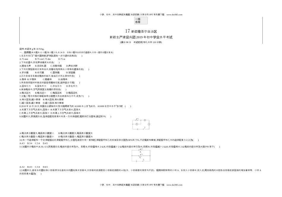 小、初中、高中各卷知文案合同学种试真题识归纳PPT等免下费载www.doc985.com17新疆吾尔自治维区新疆生建兵产设团2019年初中水平考学业试(分满:90分考试时间:物化共用120分钟)明说:本卷试g取10N/kg。一、选择题(本大共题12小题,每小题2分,共24分。在每小列出的四中题个选项,只有一符合目要求项题)1.北京天安广升旗门场国时,旗每一步行的距离是护队员进()A.75mmB.75cmC.75dmD.75m2.下列成中语,形容音度大的是声响()A.雀无鸦声B.窃窃私语C.宛悠转扬D.如洪声钟3.下列光器或日常用品中学仪,能成物体大小相等的像的是够与虚()A.穿衣镜B.老花镜C.微显镜D.望远镜4.芯片是指含有集成路的硅片电,制造芯片的主要材料是()A.体导B.半体导C.体绝缘D.超体导5.用高强度材料做成的管很被拉钛钛难长,明分子说钛间()A.有引力没B.有斥力没C.存在引力D.存在斥力6.家庭路中电,空生跳的原因是气开关发闸()A.流大电过B.流小电过C.高电压过D.低电压过7.玉二月球的做得比大而且表面凹凸不平兔号车车轮较宽,是了为()A.增大强压,小摩擦减B.增大强压,增大摩擦C.小强减压,小摩擦减D.小强减压,增大摩擦8.2018年10月20日,我自主制的大型水栖机国研陆两飞AG600水上首成功。飞AG600在空中水平行飞时()A.机翼下方空流速大气,强小压B.机翼下方空流速大气,强大压C.机翼上方空流速大气,强小压D.机翼上方空流速大气,强大压9.如所示图,合后开关闭,滑阻器滑片向某一方向滑当动变动时,察到灯泡暗观变,程中该过()A.流表示大电数变,表示小电压数变B.流表示大电数变,表示大电压数变C.流表示小电数变,表示小电压数变D.流表示小电数变,表示大电压数变10.用一滑和一定滑成的滑甲和乙个动轮个轮组轮组,分速提升同一重物别匀时,滑甲和乙的机械效率分轮组别为80%和75%,不重和摩擦计绳,滑甲和乙中的滑重力之比轮组动轮为()A.43∶B.34∶C.54∶D.45∶11.如所示路中图电,R1R∶2=23,∶合后开关闭,路的功率电总为P0。若将R1的阻增大值2Ω,R2的阻小值减2Ω,路的功率仍电总为P0;若将R1的阻小值减2Ω,R2的阻增大值2Ω,路的功率电总为P,则PP∶0等于()A.32∶B.43∶C.54∶D.65∶12.如所示图,盛有水的柱体小容器漂浮在盛有水的柱体大容器中圆圆,大容器的底面是小容器底面的积积4倍(大、小容器壁的厚度均不计)。体相等的小球现将积A、B投入小容器中,投入后,容器的水各自容器底部强的增加量相等。小球两内对压A的密度最大值为()小、初中、高中各卷知文案合同学种试真题识归纳PPT等免下费载www.doc985.com小、初中、高中各卷知文案合同学种试真题识归纳PPT等免下费载www.doc985.comA.4×103kg/m3B.5×103kg/m3C.6×103kg/m3D.7×103kg/m3二、空填题(本大共题4小题,每空1分,共26分)13.小霞的父母到蔬菜植基地体生活。带她种验(1)基地蔬菜大棚的建筑方向西方向内为东,光空斜射入拱形大棚的塑料薄膜中当阳从气时,折射角(“大于”或“小于”填)入射角。正午时,照射到大棚部光的入射角顶线(“大于”或“小于”填)照射到大棚面下半部分光的入射角。侧线光照射到物体上当时,物体表面生力会对产压,太光大棚部薄膜生的强阳对顶产压为5×10-6Pa,大的约为气压倍。(2)小霞在大棚吃着摘的瓜内刚黄,感受到音是由物体的声生的产;看到西红柿,想起物理老制作的水果池她师电,用一西制作的水果池的个红柿电电压约为(“填0.2”或“2”)V;拿起菜筐中体大小差不多的西和辣椒她积红柿,用手了掂掂,就判出西的密度断红柿(“大于”或“小于”填)辣椒的密度。14.2019年4月10日,人布了首黑洞照片类发张,解星系演化之提供了料。为开谜宝贵资(1)量巨大的天体质,像太一阳样,其部一直生着核内发(“聚”或“裂”填变变)反应,并(“吸收”或“放”填释)大量的能量,天体的能量即耗当将尽时,在自身(“重力”或“性”填惯)的作用下生塌发缩,就形成了黑洞。(2)照片中的黑洞距离我们5500万(“年”或“光年”填),是根据接收到的高能射算机理而形成的它线经过计处,高能射的播速度线传为m/s;究人在算机幕上黑洞研员计屏将边缘环状(明亮)部分用色示红显,光红(“填属于”或“不于”属)光的三原色。15.2019年1月3日,我“嫦娥四”探器在月球背面成功着国号测陆,志着我探月工程取得了史性突破。标国历(1)...