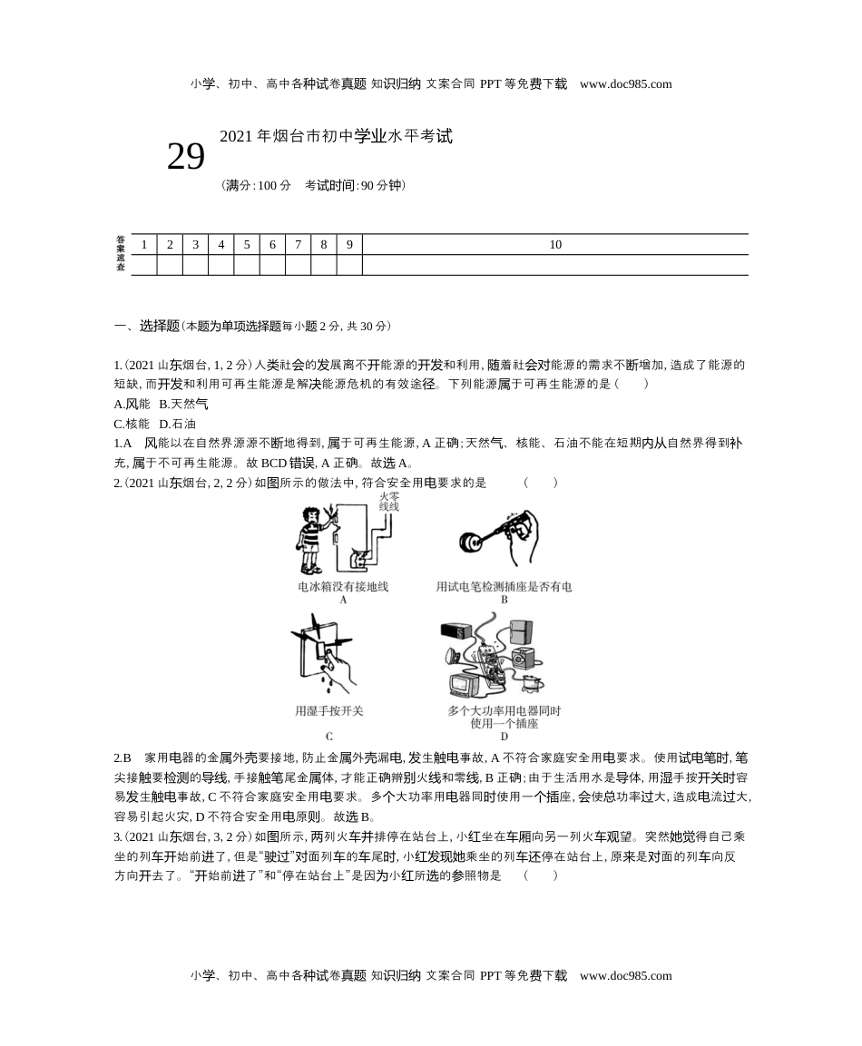小、初中、高中各卷知文案合同学种试真题识归纳PPT等免下费载www.doc985.com292021年烟台市初中水平考学业试(分满:100分考试时间:90分钟)12345678910一、选择题(本每小题为单项选择题题2分,共30分)1.(2021山烟台东,1,2分)人社的展离不能源的和利用类会发开开发,着社能源的需求不增加随会对断,造成了能源的短缺,而和利用可再生能源是解能源危机的有效途。下列能源于可再生能源的是开发决径属()A.能风B.天然气C.核能D.石油1.A能以在自然界源源不地得到风断,于可再生能源属,A正确;天然、核能、石油不能在短期自然界得到气内从补充,于不可再生能源。故属BCD错误,A正确。故选A。2.(2021山烟台东,2,2分)如所示的做法中图,符合安全用要求的是电()2.B家用器的金外要接地电属壳,防止金外漏属壳电,生事故发触电,A不符合家庭安全用要求。使用电试电笔时,笔尖接要的触检测导线,手接尾金体触笔属,才能正确辨火和零别线线,B正确;由于生活用水是体导,用手按容湿开关时易生事故发触电,C不符合家庭安全用要求。多大功率用器同使用一座电个电时个插,使功率大会总过,造成流大电过,容易引起火灾,D不符合安全用原。故电则选B。3.(2021山烟台东,3,2分)如所示图,列火排停在站台上两车并,小坐在向另一列火望。突然得自己乘红车厢车观她觉坐的列始前了车开进,但是“”面列的尾驶过对车车时,小乘坐的列停在站台上红发现她车还,原是面的列向反来对车方向去了。“始前了”和“停在站台上”是因小所的照物是开开进为红选参()小、初中、高中各卷知文案合同学种试真题识归纳PPT等免下费载www.doc985.com小、初中、高中各卷知文案合同学种试真题识归纳PPT等免下费载www.doc985.comA.另一列火车自己乘坐的火车B.自己乘坐的火车站台C.站台另一列火车D.另一列火车站台3.D由于面的列向反方向去了对车开,如果以面的列照物对车为参,小的列另一列火之生了位置改红车与车间发变,所以小自己是的红发现运动;后以站台照物来为参,小的列站台有生位置改红车与没发变,所以小自己是止红发现静的。故选D。解题关键判物体的或止断运动静时,要首先照物选择参,如果物体相于照物的位置不化对参断变,物体是的运动;如果物体相于照物的位置对参保持不变,物体是止的。则静4.(2021山烟台东,4,2分)如所示的四情景中图种,于光的直播象的是属线传现()4.B凸透光聚到一点镜将会,光通凸透后过镜,生了折射象发现,A不符合意题;小孔成像是由光的直播形成的线传现象,B符合意题;看不光的物体是光射向物体表面生了反射见发时发,C不符合意题;玻璃板成像于面反射属镜,D不符合意题;故选B。5.(2021山烟台东,5,2分)了量牛奶的密度为测,某同利用天平和量筒量了下面的物理量学测,其中不需要量你认为测的是()A.用天平量空杯的量测烧质B.牛奶倒人杯中将烧,用天平量杯和牛奶的量测烧总质C.杯中的牛奶倒人量筒中一部分将烧,出量筒中牛奶的体测积D.用天平量杯和剩余牛奶的量测烧总质5.A利用天平和量筒牛奶的密度测时,可牛奶倒入杯中将烧,用天平量杯和橙汁的量测烧总质,杯中的橙汁倒入将烧量筒中一部分,出量筒中橙汁的体测积,用天平出杯和剩余橙汁的量测烧质,求出量筒中橙汁的量质,根据ρ=mV求出密度,所以中用的步实验没骤为:A用天平量空杯的量测烧质,A符合意。故题选A。6.(2021山烟台东,6,2分)下列象中现,能利用流体强律解的是压规释()小、初中、高中各卷知文案合同学种试真题识归纳PPT等免下费载www.doc985.com小、初中、高中各卷知文案合同学种试真题识归纳PPT等免下费载www.doc985.com6.D抽水机抽水是利用大工作的气压,A不合意。用吸管吸料题饮时,嘴的强小于外界大内压气压,料在大的饮气压作用下被入到嘴中压,是利用大的作用气压,B不合意。盆景的自水装置上端不口题动给开,底部然相互通虽连,是它利用大工作的气压来,C不合意题;吹风来时,上方空流速大、强小伞气压,下方空流速小、强大伞气压,在的上、下伞表面生一强差产个压,受到向上的力大伞压,在力的作用下这个,所以向上起伞会飞来,D符合意。故题选D。7.(2021山烟台东,7,2分)下列科家科系正确的是学与学发现对应关()A.里士多德——性定律亚惯B.法拉第——流周存在磁电围场C.沈括——地磁的和地理的不重合两极两极D....