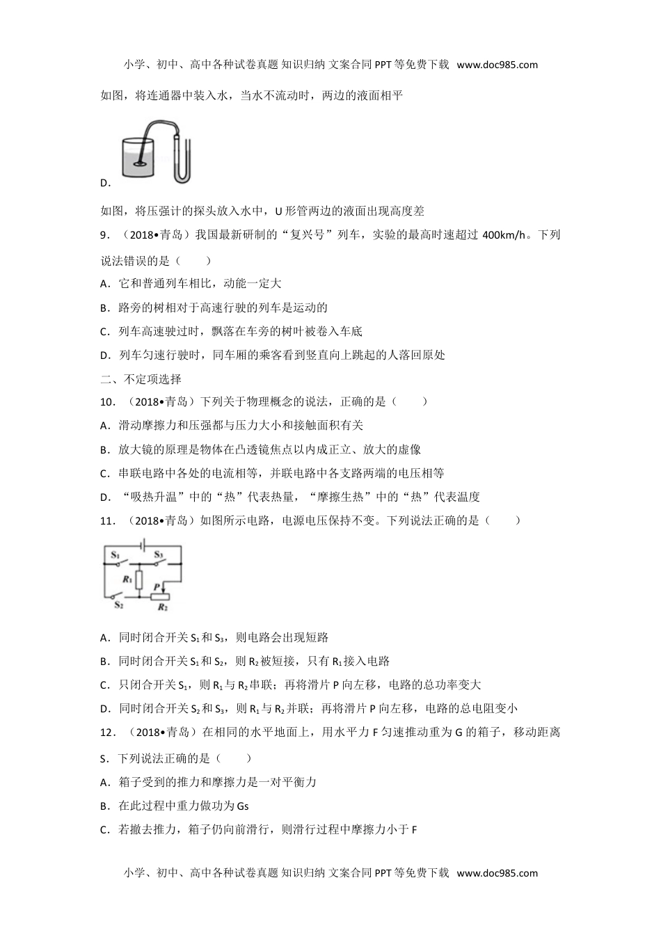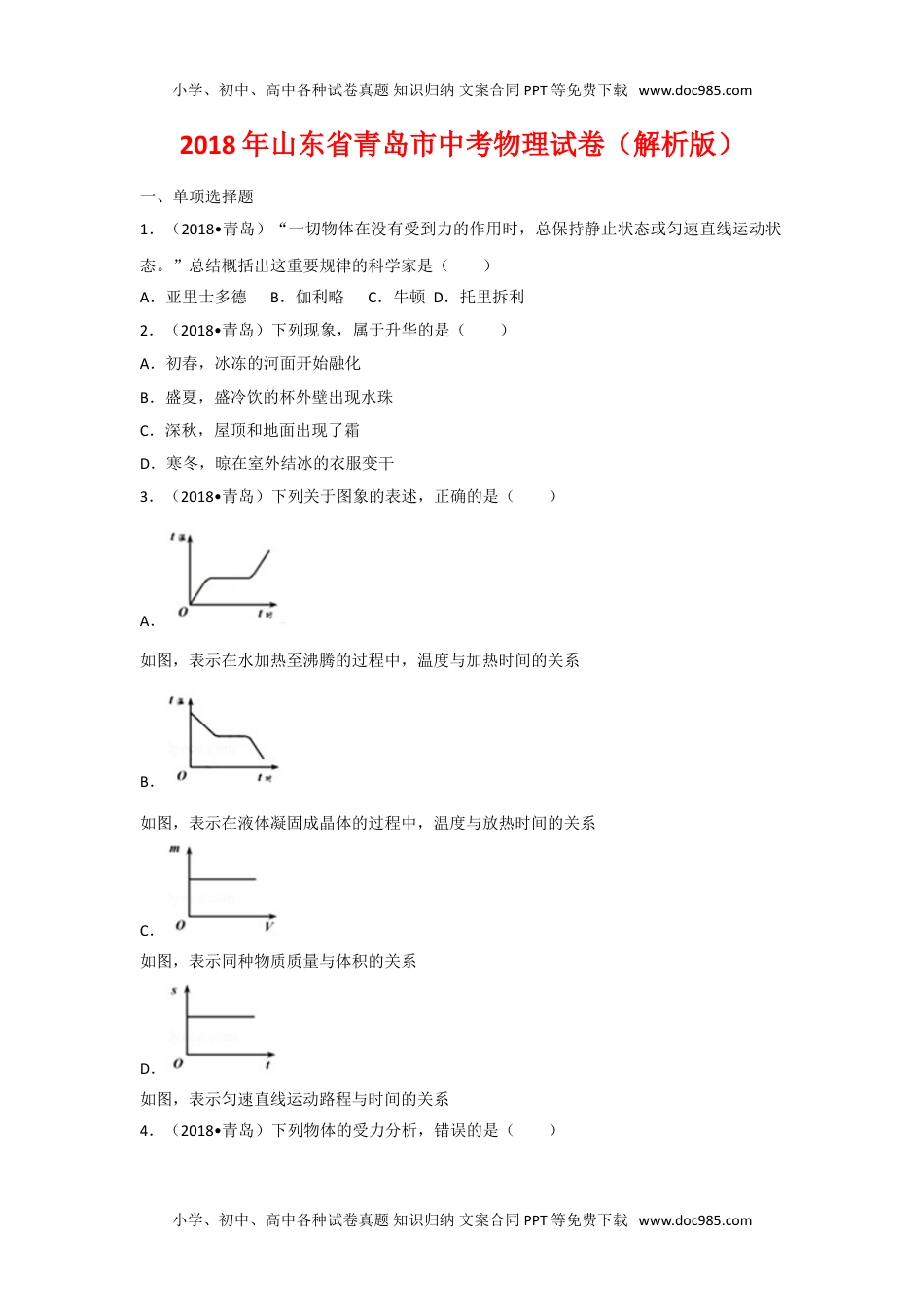 小学、初中、高中各种试卷真题知识归纳文案合同PPT等免费下载www.doc985.com2018年山东省青岛市中考物理试卷(解析版)一、单项选择题1.(2018•青岛)“一切物体在没有受到力的作用时,总保持静止状态或匀速直线运动状态。”总结概括出这重要规律的科学家是()A.亚里士多德B.伽利略C.牛顿D.托里拆利2.(2018•青岛)下列现象,属于升华的是()A.初春,冰冻的河面开始融化B.盛夏,盛冷饮的杯外壁出现水珠C.深秋,屋顶和地面出现了霜D.寒冬,晾在室外结冰的衣服变干3.(2018•青岛)下列关于图象的表述,正确的是()A.如图,表示在水加热至沸腾的过程中,温度与加热时间的关系B.如图,表示在液体凝固成晶体的过程中,温度与放热时间的关系C.如图,表示同种物质质量与体积的关系D.如图,表示匀速直线运动路程与时间的关系4.(2018•青岛)下列物体的受力分析,错误的是()小学、初中、高中各种试卷真题知识归纳文案合同PPT等免费下载www.doc985.com小学、初中、高中各种试卷真题知识归纳文案合同PPT等免费下载www.doc985.com5.(2018•青岛)小明步行的平均速度是1.2m/s,从家到学校要走15min,那么他上学要走的路程是()A.1080mB.108mC.18kmD.0.3km6.(2018•青岛)下列关于电与磁的说法,正确的是()A.奥斯特首先发现了电与磁的联系,实现了机械能到电能的转化B.部分导体在磁场中运动,导体中就产生电流C.感应电流方向只与磁场方向有关D.利用电磁感应原理,制成发电机7.(2018•青岛)研究力的作用时,两个小孩共同提起一桶水,与一个成年人提起同一桶水的效果相同。下列研究问题的方法与此相同的是()A.研究磁场性质时,用磁感线来描述磁场的分布B.研究物体对光的反射时,将其分为镜面反射和漫反射C.研究固、液、气三态物质的宏观特性时,找出它们的异同点D.研究并联电阻特点时,用两个15欧的电阻并联替代一个7.5欧的电阻8.(2018•青岛)下列实验中,能证明大气压强存在的是()A.如图,将加有砝码的小桌放在海绵上,小桌腿陷入海绵中B.如图,将硬纸片盖在装满水的试管口,倒置后水不会流出C.小学、初中、高中各种试卷真题知识归纳文案合同PPT等免费下载www.doc985.com小学、初中、高中各种试卷真题知识归纳文案合同PPT等免费下载www.doc985.com如图,将连通器中装入水,当水不流动时,两边的液面相平D.如图,将压强计的探头放入水中,U形管两边的液面出现高度差9.(2018•青岛)我国最新研制的“复兴号”列车,实验的最高时速超过400km/h。下列说法错误的是()A.它和普通列车相比,动能一定大B.路旁的树相对于高速行驶的列车是运动的C.列车高速驶过时,飘落在车旁的树叶被卷入车底D.列车匀速行驶时,同车厢的乘客看到竖直向上跳起的人落回原处二、不定项选择10.(2018•青岛)下列关于物理概念的说法,正确的是()A.滑动摩擦力和压强都与压力大小和接触面积有关B.放大镜的原理是物体在凸透镜焦点以内成正立、放大的虚像C.串联电路中各处的电流相等,并联电路中各支路两端的电压相等D.“吸热升温”中的“热”代表热量,“摩擦生热”中的“热”代表温度11.(2018•青岛)如图所示电路,电源电压保持不变。下列说法正确的是()A.同时闭合开关S1和S3,则电路会出现短路B.同时闭合开关S1和S2,则R2被短接,只有R1接入电路C.只闭合开关S1,则R1与R2串联;再将滑片P向左移,电路的总功率变大D.同时闭合开关S2和S3,则R1与R2并联;再将滑片P向左移,电路的总电阻变小12.(2018•青岛)在相同的水平地面上,用水平力F匀速推动重为G的箱子,移动距离S.下列说法正确的是()A.箱子受到的推力和摩擦力是一对平衡力B.在此过程中重力做功为GsC.若撤去推力,箱子仍向前滑行,则滑行过程中摩擦力小于F小学、初中、高中各种试卷真题知识归纳文案合同PPT等免费下载www.doc985.com小学、初中、高中各种试卷真题知识归纳文案合同PPT等免费下载www.doc985.comD.若水平推力改为2F,仍使箱子移动距离s,则推力做功为2Fs13.(2018•青岛)利用如图所示装置研究电功,电动机工作时两端电压为6V,通过的电流为1A,在5s内将质量为4kg...