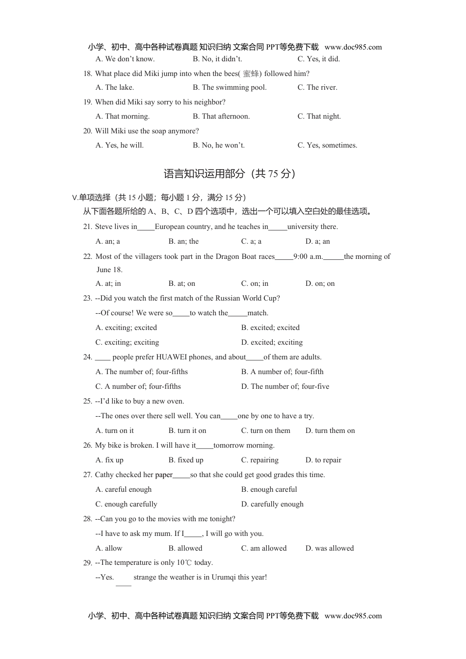 小学、初中、高中各种试卷真题知识归纳文案合同PPT等免费下载www.doc985.com2018年乌鲁木齐市初中毕业生学业水平测试英语试卷(问卷)注意事项:1.本试卷分第Ⅰ卷(选择题)和第Ⅱ卷(非选择题)两部分。共8页。2.答题前,考生须将自己的姓名、准考证号、考场号、座位号填写在指定的位置上。3.选择题的每小题选出答案后,用2B铅笔把答题卡上对应题目的答案标号涂黑。如需改动,用橡皮擦干净后,再选涂其它答案标号。非选择题须用黑色字迹的签字笔按照题号顺序在答题卡上的答题区域内作答。在草稿纸、本问卷上答题无效。4.开考30分钟后放听力录音,只播放一次。5.考试结束后,将本试卷和答题卡一并交回。第I卷(选择题共105分)听力部分(共30分)I.图片理解(共5小题;每小题1分,满分5分)听录音,从图中所给的A、B、C三个选项中选出与所听到内容相符的图片。(读两遍)1.2.3.小学、初中、高中各种试卷真题知识归纳文案合同PPT等免费下载www.doc985.com小学、初中、高中各种试卷真题知识归纳文案合同PPT等免费下载www.doc985.com4.5.II.情景反应(共5小题;每小题1分,满分5分)听句子,从题中所给的A、B、C三个选项中选出一个最佳应答。(读两遍)6.A.Heisyoung.B.Hehasastomachache.C.Hewearsacoat.7.A.Yes,shewas.B.No,shedidn’t.C.Shewasexercising.8.A.Twodaysago.B.Insixyears.C.Forthreeweeks.9.A.Watchout!B.Whatapity!C.Helpyourself!10.A.Yes,Ido.B.No,Idon’t.C.No,thanks.III.对话理解(共5小题;每小题2分,满分10分)听下面5段对话,从题中所给的A、B、C三个选项中选出一个最佳选项。(读两遍)11.WhatsizeofT-shirtwouldthemanlike?A.SizeS.B.SizeL.C.SizeXL.12.What’stheweatherlikenow?A.It’ssunny.B.It’sraining.C.It’ssnowing.13.Whenwilltheymeetattheschoolgate?A.At6:40.B.At7:40.C.At7:20.14.WhatdoesEricwanttobewhenhegrowsup?A.Apilot.B.Ateacher.C.Awriter.15.WhydidTedstayuplatelastnight?A.Hestudiedforatest.B.Heplayedcomputergames.C.Hepreparedforthetalentshow.IV.短文理解(共5小题;每小题2分,满分10分)听短文,从题中所给的A、B、C三个选项中选出一个最佳选项。(读两遍)16.WhosentabirthdaygifttoMiki?A.Hisuncle.B.Hisaunt.C.Hismother.17.Didthesoapsmellgood?小学、初中、高中各种试卷真题知识归纳文案合同PPT等免费下载www.doc985.com小学、初中、高中各种试卷真题知识归纳文案合同PPT等免费下载www.doc985.comA.Wedon’tknow.B.No,itdidn’t.C.Yes,itdid.18.WhatplacedidMikijumpintowhenthebees(蜜蜂)followedhim?A.Thelake.B.Theswimmingpool.C.Theriver.19.WhendidMikisaysorrytohisneighbor?A.Thatmorning.B.Thatafternoon.C.Thatnight.20.WillMikiusethesoapanymore?A.Yes,hewill.B.No,hewon’t.C.Yes,sometimes.语言知识运用部分(共75分)V.单项选择(共15小题;每小题1分,满分15分)从下面各题所给的A、B、C、D四个选项中,选出一个可以填入空白处的最佳选项。21.StevelivesinEuropeancountry,andheteachesinuniversitythere.A.an;aB.an;theC.a;aD.a;an22.MostofthevillagerstookpartintheDragonBoatraces9:00a.m.themorningofJune18.A.at;inB.at;onC.on;inD.on;on23.--DidyouwatchthefirstmatchoftheRussianWorldCup?--Ofcourse!Weweresotowatchthematch.A.exciting;excitedB.excited;excitedC.exciting;excitingD.excited;exciting24.peoplepreferHUAWEIphones,andaboutofthemareadults.A.Thenumberof;four-fifthsB.Anumberof;four-fifthC.Anumberof;four-fifthsD.Thenumberof;four-five25.--I’dliketobuyanewoven.--Theonesovertheresellwell.Youcanonebyonetohaveatry.A.turnonitB.turnitonC.turnonthemD.turnthemon26.Mybikeisbroken.Iwillhaveittomorrowmorning.A.fixupB.fixedupC.repairingD.torepair27.Cathycheckedherpapersothatshecouldgetgoodgradesthistime.A.carefulenoughB.enoughcarefulC.enoughcarefullyD.carefullyenough28.--Canyougotothemovieswithmetonight?--Ihavetoaskmymum.IfI,Iwillgo...
