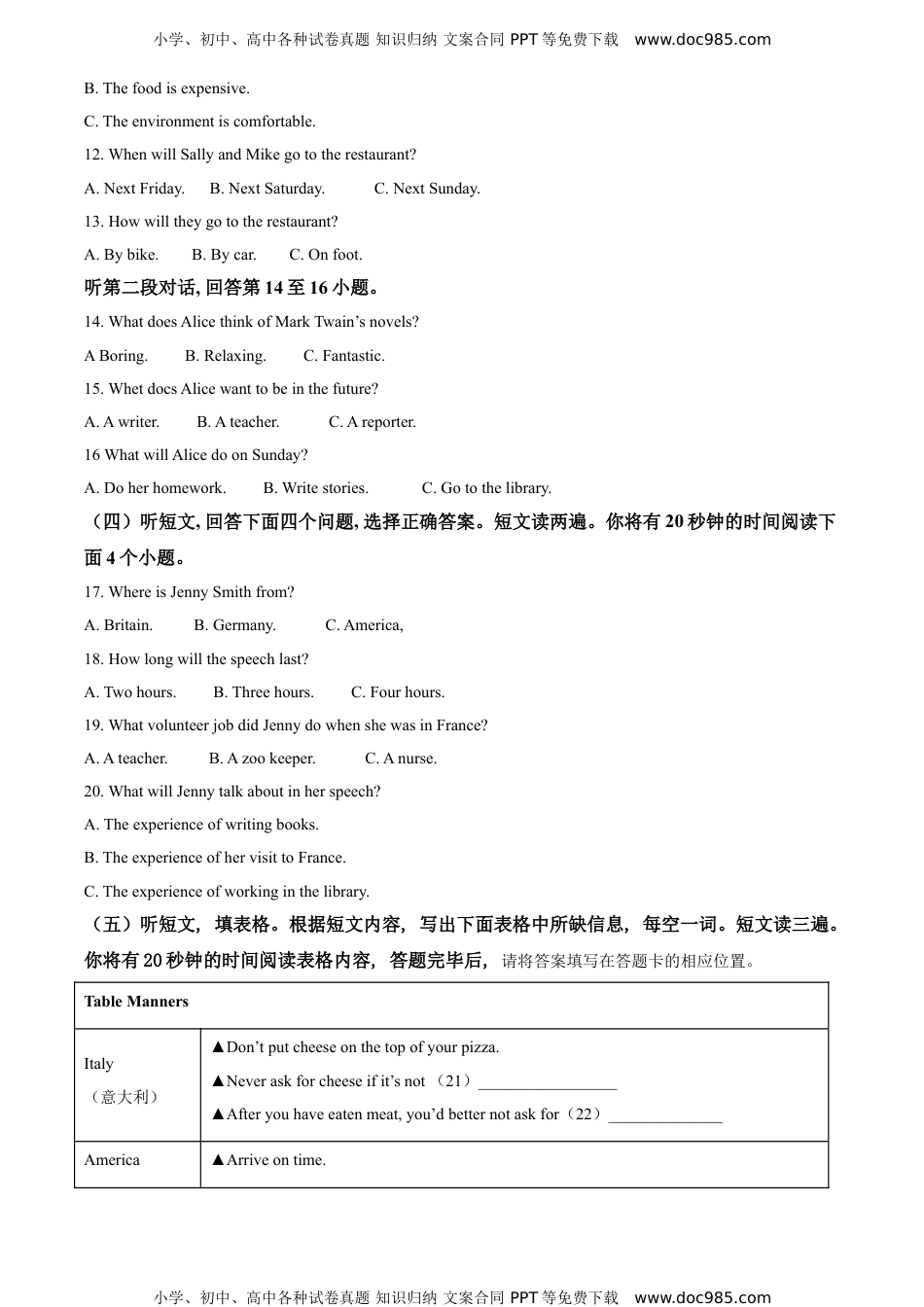 小学、初中、高中各种试卷真题知识归纳文案合同PPT等免费下载www.doc985.com泰安市2020年初中学业水平考试英语试题本试卷分第I卷和第II卷两部分。第I卷1至9页,第II卷10至12页,共150分,考试时间120分钟。注意事项:1.答题前,请考生仔细阅读答题卡上的注意事项,并务必按照相关要求作答。2.考试结束后,将本试卷和答题卡一并交回。第I卷第一部分听力(一)听句子,选择适当的应答语。每个句子读两遍。1.A.Bybike.B.Acrossfromthepark.C.Youcangetthere.2.A.Iwascooking.B.Ifeltnervous.C.Whataterriblerainstorm!3.A.Twoweeksago.B.Foronlytwoweeks.C.Morethan2000yuan.4.A.That’sallright.B.Ofcoursenot.C.OK,Iwill.5.A.About2kilometers.B.Tenminutes.C.Onfoot.(二)听五段对话,选择正确答案。每段对话读两遍,你将有20秒钟的时间阅读下面5个小题。6.What'sMr.Green'stelephonenumber?A.378-5792.B.368-5792.C.368-5762.7.Wheredoestheconversationprobablytakeplace?A.Inarestaurant.B.Athome.C.Atschool.8.WhatdoesLucythinkofgettingherearspierced?A.Shelikesit.B.Shedoesn’tmindit.C.Shecan’tstandit.9.Howmuchisthedictionary?A.15yuan.B.20yuan.C.35yuan.10.Whatcanweknowfromtheconversation?A.Theboyfailedhismathtest.B.Theboywantedtogiveup.C.Themothergotveryangry.(三)听两段长对话,选择正确答案。每段对话读两遍。听每段对话前你将有10秒钟的时间阅读对应的3个小题。听第一段对话,回答第11至13小题。11.WhatdidSallythinkoftherestaurant?A.Theserviceisbad.小学、初中、高中各种试卷真题知识归纳文案合同PPT等免费下载www.doc985.com小学、初中、高中各种试卷真题知识归纳文案合同PPT等免费下载www.doc985.comB.Thefoodisexpensive.C.Theenvironmentiscomfortable.12.WhenwillSallyandMikegototherestaurant?A.NextFriday.B.NextSaturday.C.NextSunday.13.Howwilltheygototherestaurant?A.Bybike.B.Bycar.C.Onfoot.听第二段对话,回答第14至16小题。14.WhatdoesAlicethinkofMarkTwain’snovels?ABoring.B.Relaxing.C.Fantastic.15.WhetdocsAlicewanttobeinthefuture?A.Awriter.B.Ateacher.C.Areporter.16WhatwillAlicedoonSunday?A.Doherhomework.B.Writestories.C.Gotothelibrary.(四)听短文,回答下面四个问题,选择正确答案。短文读两遍。你将有20秒钟的时间阅读下面4个小题。17.WhereisJennySmithfrom?A.Britain.B.Germany.C.America,18.Howlongwillthespeechlast?A.Twohours.B.Threehours.C.Fourhours.19.WhatvolunteerjobdidJennydowhenshewasinFrance?A.Ateacher.B.Azookeeper.C.Anurse.20.WhatwillJennytalkaboutinherspeech?A.Theexperienceofwritingbooks.B.TheexperienceofhervisittoFrance.C.Theexperienceofworkinginthelibrary.(五)听短文,填表格。根据短文内容,写出下面表格中所缺信息,每空一词。短文读三遍。你将有20秒钟的时间阅读表格内容,答题完毕后,请将答案填写在答题卡的相应位置。TableMannersItaly(意大利)▲Don’tputcheeseonthetopofyourpizza.▲Neveraskforcheeseifit’snot(21)_________________▲Afteryouhaveeatenmeat,you’dbetternotaskfor(22)______________America▲Arriveontime.小学、初中、高中各种试卷真题知识归纳文案合同PPT等免费下载www.doc985.com小学、初中、高中各种试卷真题知识归纳文案合同PPT等免费下载www.doc985.com▲Don’tcircleyourplatewithyour(23)______________.▲Don’tsay,“I’m(24)____________.”Justputtheforkandknifeacrosstheplate.▲Don’treachacrossthetablefor(25)______________.Askthenearestpersonforhelp.第二部分完形填空阅读下面短文,掌握其大意,然后从每题所给的A、B、C三个选项中,选出能填入短文相应空白处的最佳选项,并在答题卡上将该项涂黑。ItwasThanksgiving.SnowwasfallingwhenBob____1____towardsthecitypark.Bobwasdeserted(遗弃)byhisparentsandwasraised(抚养)byakindman.Twoyearsago,tobe______2______,Bobbuiltatradition.ThatwastotakehisThanksgi...