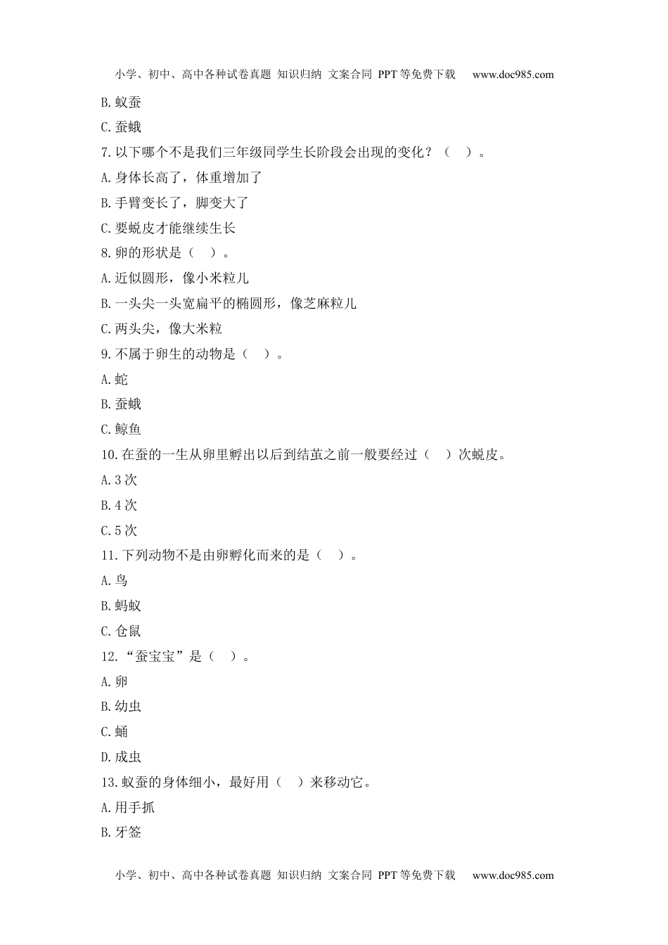 小学、初中、高中各种试卷真题知识归纳文案合同PPT等免费下载www.doc985.com第二单元A卷一、填空题1.动物的一生经历了出生、________、________、死亡四个阶段。2.幼虫在动物卵中破壳而出,叫做________,我知道鸡、鸭________、________等动物都是卵生的。3.蚕生长到一定阶段,会长出新皮,换下旧皮,这叫做________。4.蚕蛾的身体可以分为头、________、________三部分,胸部长有________对足。5.像猫和狗这样,直接生下胎儿的叫________。6.为蚕宝宝建造一个舒适的家。在盒盖上扎一些小孔是为了________;在天气干燥时撒一些水是为了________;把嫩桑叶切碎是为了________;经常清除粪便和残叶是为了________;用羽毛把它刷到桑叶上是为了________;二、判断题1.蚕不是昆虫,蚂蚁没有翅膀也不是昆虫。()2.动物的生命都是从卵开始的。()3.蚕卵孵化出的幼蚕经过两次蜕皮就会吐丝结茧。()4.所有的动物生命周期都是一样的。()5.养蚕,抽取蚕丝织成丝绸,是我国古代伟大的发明之一。()6.蚕蛾刚产下的卵是紫黑色的。()7.蚕的雌蛾和雄蛾交配后,雌蛾产卵繁殖后代。()小学、初中、高中各种试卷真题知识归纳文案合同PPT等免费下载www.doc985.com小学、初中、高中各种试卷真题知识归纳文案合同PPT等免费下载www.doc985.com8.所有的蚕卵都能孵化出蚁蚕。()9.蝙蝠有翅膀,会飞翔,所以是一种鸟类。()10.人和动物寿命的长短与生活环境无关。()三、选择题1.爷爷、奶奶、外婆60多岁了,属于()。A.青年组B.中年组C.老年组2.蚕丝织成的布叫做()。A.棉布B.羽绒C.丝绸3.有些动物的幼年期和成年期很不相同,从一种形态变成了另一种形态,这种变化叫()。A.发育B.生长C.变态4.下列动物中,不属于昆虫的是()。A.青蛙B.蚂蚁C.蚕蛾5.关于养蚕的方法,下列说法中正确的是()。A.蚕卵孵化不需要适宜的温度和湿度B.蚁蚕吃的桑叶最好切成碎片或条状C.要把蚕放在封闭的盒子里饲养,以免被虫咬6.蚕的生命是从()开始的。A.蚕卵小学、初中、高中各种试卷真题知识归纳文案合同PPT等免费下载www.doc985.com小学、初中、高中各种试卷真题知识归纳文案合同PPT等免费下载www.doc985.comB.蚁蚕C.蚕蛾7.以下哪个不是我们三年级同学生长阶段会出现的变化?()。A.身体长高了,体重增加了B.手臂变长了,脚变大了C.要蜕皮才能继续生长8.卵的形状是()。A.近似圆形,像小米粒儿B.一头尖一头宽扁平的椭圆形,像芝麻粒儿C.两头尖,像大米粒9.不属于卵生的动物是()。A.蛇B.蚕蛾C.鲸鱼10.在蚕的一生从卵里孵出以后到结茧之前一般要经过()次蜕皮。A.3次B.4次C.5次11.下列动物不是由卵孵化而来的是()。A.鸟B.蚂蚁C.仓鼠12.“蚕宝宝”是()。A.卵B.幼虫C.蛹D.成虫13.蚁蚕的身体细小,最好用()来移动它。A.用手抓B.牙签小学、初中、高中各种试卷真题知识归纳文案合同PPT等免费下载www.doc985.com小学、初中、高中各种试卷真题知识归纳文案合同PPT等免费下载www.doc985.comC.干毛笔14.关于蚕蛹,描述准确的是()。A.蛹不会动B.会一直动C.蛹一般不动,受外界刺激会动15.人出生时,婴儿脑重已达成人时期重的()。A.15%B.25%C.35%16.下列动物是变态发育的是()。A.蜜蜂B.鱼C.狗17.下列动物中,由妈妈直接生下来的是()。A.免B.苍蝇C.蜗牛18.爬行较快、翅大、腹部较小的蚕蛾是()。A.雄蛾B.雌蛾C.无法分辨19.以下动物行为是随着环境变化而变化的是()。A.蚕宝宝吃桑叶B.大雁南飞C.小狗吸食乳汁小学、初中、高中各种试卷真题知识归纳文案合同PPT等免费下载www.doc985.com小学、初中、高中各种试卷真题知识归纳文案合同PPT等免费下载www.doc985.com20.下列关于蚕的食物描述正确的是()。A.蚕宝宝喜欢吃桂花叶B.蚕宝宝喜欢吃桑叶C.蚕宝宝喜欢吃嫩草四、简答题1.蚕和其他动物的生命周期。繁殖后代的方式生命周期蚕卵生卵—蚕宝宝—蚕蛹—蚕蛾蝴蝶鲫鱼青蛙鸭狗2.动物的繁殖方式有哪几种?请各举三例。五、综合题1.观察蚕蛹。如下图是三(1)班小明同学这学期的养殖收获,他很想知道蚕茧内的蚕蛹是怎样的?请与他合作一起完成观察记录活动:(1)小明用剪刀剪开蚕茧置于实验桌上,通过观察请在...