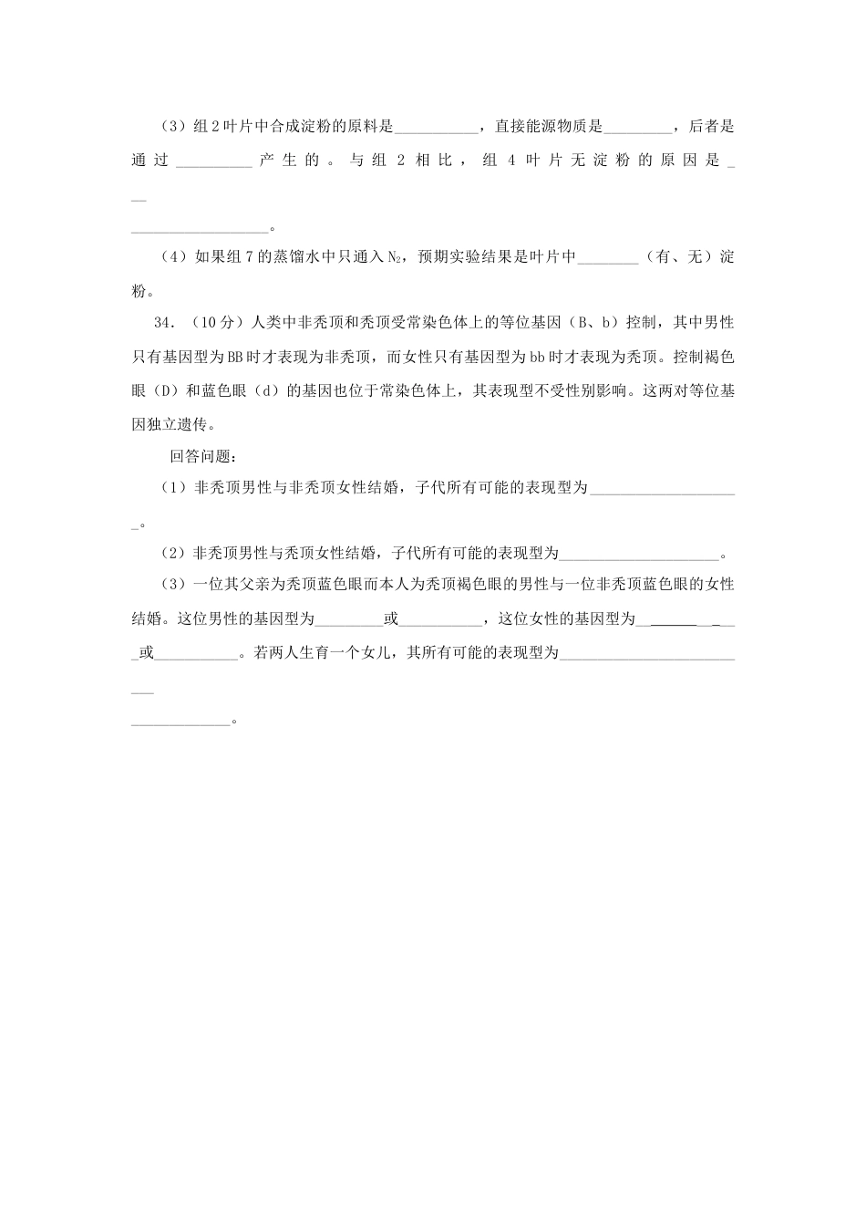 2011年普通高等学校招生全国Ⅱ统一考试一、选择题:本题共13小题。在每小题给出的四个选项中,只有一项是符合题目要求的。1.下列能说明某细胞已经发生分化的是A.进行ATP的合成B.进行mRNA的合成C.存在血红蛋白D.存在纤维蛋白原基因2.将紫色洋葱在完全营养液中浸泡一段时间,撕取外表皮,先用浓度为0.3g.mL的蔗糖溶液处理,细胞发生质壁分离后,立即将外表皮放入蒸馏水中,直到细胞中的水分不再增加。在该实验中,蔗糖溶液处理前外表皮细胞液的浓度为甲,细胞中的水分不再增加时外表皮细胞液的浓度为乙,则甲、乙的关系,以及实验过程中水分进出细胞的方式为A.甲<乙,被动运输B.甲>乙,被动运输C.甲>乙,主动运输D.甲=乙,主动运输3.将生长状态一致的同一品种玉米植株分为甲、乙两组,甲组培养在适宜的光照条件下,其叶维管束鞘细胞中有淀粉积累;乙组培养在光照较弱的条件下,其叶维管束鞘细胞中没有检测到淀粉。乙组未检测到淀粉的原因是()A.叶片不进行光合作用,只进行呼吸作用B.叶片光合作用强度低,没有淀粉的积累C.维管束鞘细胞没有与淀粉合成相关的酶D.维管束鞘细胞不含叶绿体,不能进行光合作用4.某校园有一片草坪和一片树林,下列关于这两个群落中动物分层现象的叙述,正确的是()A.草坪和树林中的动物都具有分层现象B.草坪和树林中的动物都没有分层现象C.只有草坪和树林混杂在一起时动物才具有分层现象D.草坪中的动物没有分层现象,而树林中的动物具有分层现象5.研究发现两种现象:①动物体内的B细胞受到抗原刺激后,在物质甲的作用下,可增殖、分化为效应B细胞;②给动物注射从某种细菌获得的物质乙后,此动物对这种细菌具有了免疫能力。则这两种物质中()A.甲是抗体,乙是抗原B.甲是抗体,乙是淋巴因子C.甲是淋巴因子,乙是抗原D.甲是淋巴因子,乙是抗体31.(10分)同学从温度为55~65"C的泉水中筛选出能合成脂肪酶的细菌,并从该细菌中提取了脂肪酶。回答问题:(1)测定脂肪酶活性时,应选择________________作为该酶作用的物质,反应液中应加入________________溶液以维持其酸碱度稳定。(2)要鉴定该酶的化学本质,可将该酶液与双缩脲试剂混合,若反应液呈紫色,则该酶的化学本质为________________。(3)根据该细菌的生活环境,简要写出测定该酶催化作用最适温度的实验思路。32.(11分)回答下列与生态学有关的问题:(1)某人将未经检疫的外来鱼类和水草大量引进某水域生态系统后,导致生物多样性下降。从种间关系的角度分析,引起这种不良后果的原因是本地原有物种和外来物种之间可能存在着_____________、____________、______________的关系。(2)某相对稳定的水域生态系统中主要有甲、乙、丙、丁、戊5个种群,各种群生物体内某重金属的含量如下表。已知水中的该重金属被生物体吸收后难以通过代谢排出体外。假设在这5个种群构成的食物网中,消费者只能以其前一个营养级的所有物种为食。种群甲乙丙丁戊重金属含量(μg/Kg鲜重)0.00370.00370.0350.0350.34据表中数据绘出该生态系统的食物网。33.(11分)为探究不同条件对叶片中淀粉合成的影响,将某植物在黑暗中放置一段时间,耗尽叶片中的淀粉。然后取生理状态一致的叶片,平均分成8组,实验处理如下表所示。一段时间后,检测叶片中有无淀粉,结果如下表。编号组1组2组3组4组5组6组7组8处理葡萄糖溶液浸泡溶液中通入空气葡萄糖溶液浸泡溶液中通入CO2和N2蒸馏水浸泡水中通入空气蒸馏水浸泡水中通入CO2和N2光照黑暗光照黑暗光照黑暗光照黑暗检测结果有淀粉有淀粉有淀粉无淀粉有淀粉无淀粉有淀粉无淀粉回答问题:(1)光照条件下,组5叶片通过__________作用产生淀粉:叶肉细胞释放出的氧气来自于___________的光解。(2)在黑暗条件下,叶片能进行有氧呼吸的组别是______。(3)组2叶片中合成淀粉的原料是___________,直接能源物质是_________,后者是通过__________产生的。与组2相比,组4叶片无淀粉的原因是_____________________。(4)如果组7的蒸馏水中只通入N2,预期实验结果是叶片中________(有、无)淀粉。34.(10分)人类中非秃顶和秃顶受常染色体上的等位基因(B...