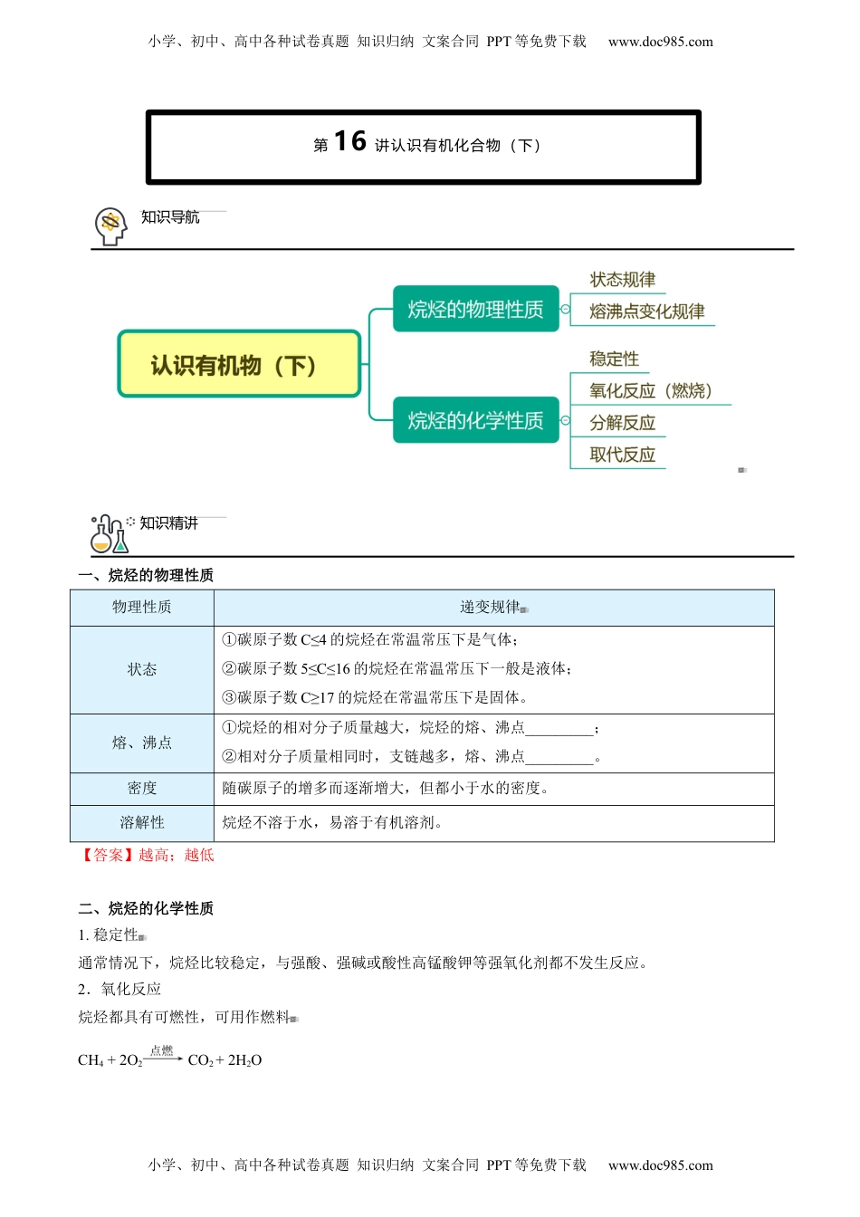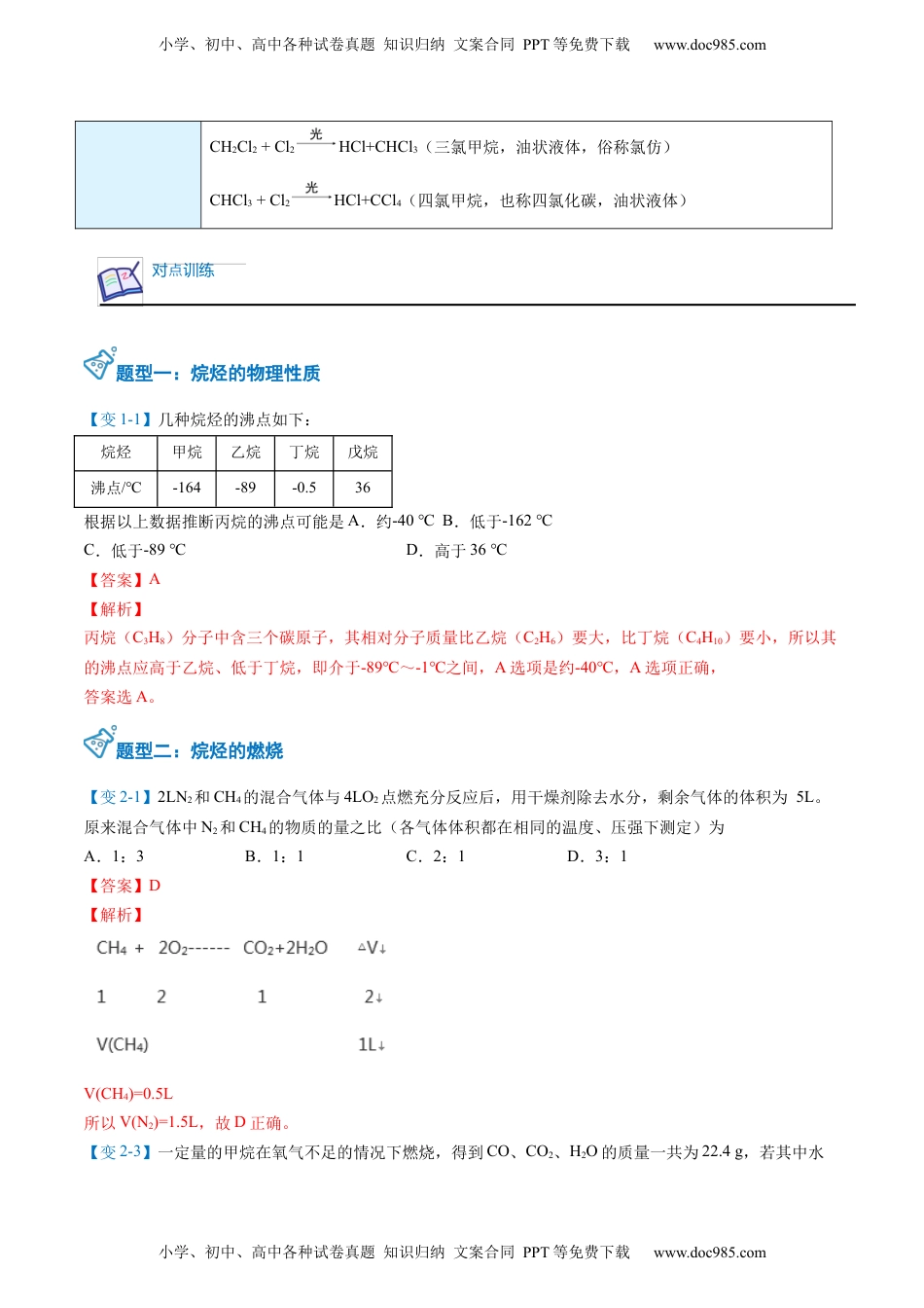 第16讲认识有机化合物(下)知识导航知识精讲小学、初中、高中各种试卷真题知识归纳文案合同PPT等免费下载www.doc985.com一、烷烃的物理性质物理性质递变规律状态①碳原子数C≤4的烷烃在常温常压下是气体;②碳原子数5≤C≤16的烷烃在常温常压下一般是液体;③碳原子数C≥17的烷烃在常温常压下是固体。熔、沸点①烷烃的相对分子质量越大,烷烃的熔、沸点_________;②相对分子质量相同时,支链越多,熔、沸点_________。密度随碳原子的增多而逐渐增大,但都小于水的密度。溶解性烷烃不溶于水,易溶于有机溶剂。【答案】越高;越低二、烷烃的化学性质1.稳定性通常情况下,烷烃比较稳定,与强酸、强碱或酸性高锰酸钾等强氧化剂都不发生反应。2.氧化反应烷烃都具有可燃性,可用作燃料CH4+2O2CO2+2H2O小学、初中、高中各种试卷真题知识归纳文案合同PPT等免费下载www.doc985.com小学、初中、高中各种试卷真题知识归纳文案合同PPT等免费下载www.doc985.comC3H8+5O23CO2+4H2O燃烧通式为:_______________________________________________【答案】CnH2n+2+3n+12O2nCO2+(n+1)H2O3.分解反应烷烃在较高温度下会发生分解。CH4C+2H2C4H10CH2==CH2(乙烯)+CH3CH3这个性质常被应用于石油化工和天然气化工生产中,从烷烃可得到一系列重要的化工基本原料和燃料。4.取代反应(1)有机物分子里的某些原子或原子团被其他原子或原子团所替代的反应叫取代反应。(2)在光照条件下,烷烃可与卤素单质发生取代反应:CnH2n+2+X2________________________【答案】CnH2n+1X+HX实验——CH4与Cl2的取代反应实验操作取两支试管,均通过排饱和NaCl溶液的方法收集半试管CH4,和半试管Cl2,分别用铁架台固定好。将其中一支试管用铝箔套上,另一支试管放在光亮处(不要放在日光直射的地方)。静置,比较两支试管内的现象。实验现象光亮处的试管气体颜色逐渐变浅,试管壁出现油状液滴,同时出现少量白雾,试管内液面上升,饱和食盐水中有少量固体析出;套上铝箔的试管无明显现象。反应原理+(一氯甲烷,气体)CH3Cl+Cl2HCl+CH2Cl2(二氯甲烷,油状液体)小学、初中、高中各种试卷真题知识归纳文案合同PPT等免费下载www.doc985.com点对训练小学、初中、高中各种试卷真题知识归纳文案合同PPT等免费下载www.doc985.comCH2Cl2+Cl2HCl+CHCl3(三氯甲烷,油状液体,俗称氯仿)CHCl3+Cl2HCl+CCl4(四氯甲烷,也称四氯化碳,油状液体)题型一:烷烃的物理性质【变1-1】几种烷烃的沸点如下:烷烃甲烷乙烷丁烷戊烷沸点/℃-164-89-0.536根据以上数据推断丙烷的沸点可能是A.约-40℃B.低于-162℃C.低于-89℃D.高于36℃【答案】A【解析】丙烷(C3H8)分子中含三个碳原子,其相对分子质量比乙烷(C2H6)要大,比丁烷(C4H10)要小,所以其的沸点应高于乙烷、低于丁烷,即介于-89℃~-1℃之间,A选项是约-40℃,A选项正确,答案选A。题型二:烷烃的燃烧【变2-1】2LN2和CH4的混合气体与4LO2点燃充分反应后,用干燥剂除去水分,剩余气体的体积为5L。原来混合气体中N2和CH4的物质的量之比(各气体体积都在相同的温度、压强下测定)为A.1:3B.1:1C.2:1D.3:1【答案】D【解析】V(CH4)=0.5L所以V(N2)=1.5L,故D正确。【变2-3】一定量的甲烷在氧气不足的情况下燃烧,得到CO、CO2、H2O的质量一共为22.4g,若其中水小学、初中、高中各种试卷真题知识归纳文案合同PPT等免费下载www.doc985.com小学、初中、高中各种试卷真题知识归纳文案合同PPT等免费下载www.doc985.com的质量为10.8g,则其中CO的质量为A.2.8gB.4.2gC.5.0gD.5.6g【答案】A【解析】根据题意,水的物质的量是10.8g÷18g/mol=0.6mol,H元素的物质的量是1.2mol,甲烷的分子式为CH4,甲烷为4.8g,其中碳的质量为3.6g,完全燃烧生成0.3mol的二氧化碳,质量为0.3mol×44g/mol=13.2g,现在二氧化碳和CO的总质量为22.4g-10.8g=11.6g,设CO的质量为x,则CO2的质量为11.6-x,x×12/28+(11.6-x)×12/44=3.6,解得x=2.8g,A符合题意,答案选A。题型三:取代反应的判断【例3】下列反应属于取代反应的是()①Zn+2HCl===ZnCl2+H2↑②NaOH+HCl===NaCl+H2O③CH3CH3+2Br2CH2BrC...