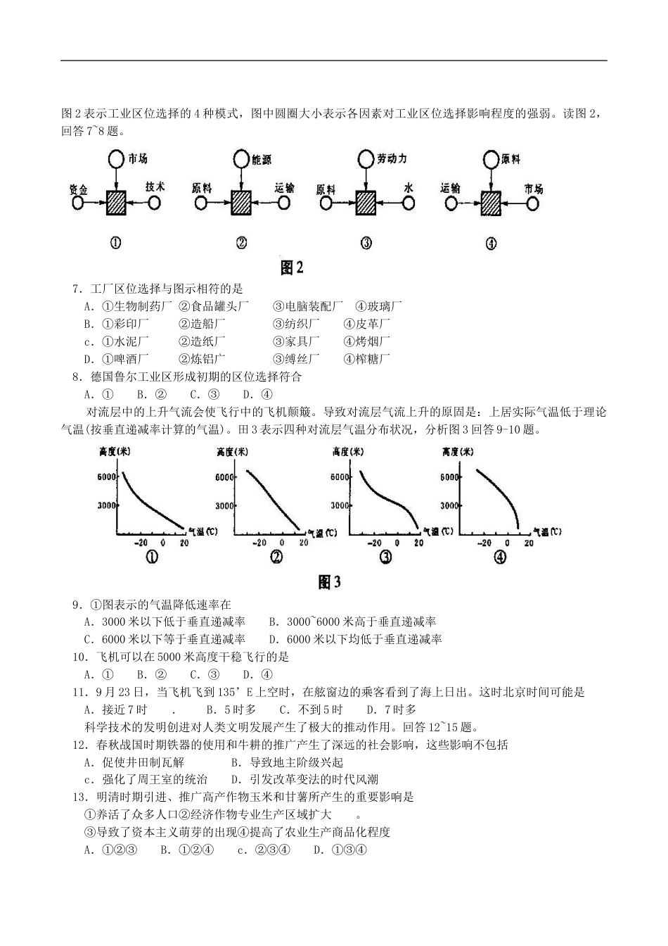 2024高考模拟卷、网课、资料联系微信:gaokao28882004年浙江高考文科综合真题及答案第1卷(选择题,共140分)在每题给出的四个选项中,只有一项是最符合题目要求的。<<真腊风土记>>(元)记载:①白温州开船,西南行,历闽、广海外诸州港口,过七洲洋,经交趾洋到占城。又自占城顶风可半月到真腊;②真腊四时常如五六月天,不识霜雪,半年有雨,半年绝无;③信教者削发穿黄,偏袒右肩,其下系黄布裙,跪足。据此并结合图1,回答1—4题。1.当时从温州航梅前往真腊的较佳时间是人11-12月D.3-4月C.5~6月D.7-8月2.真腊地区的气候属于A.亚热带季风气候B.热带季风气候c.热带沙漠气候D.热带雨林气候3.③所描述宗教的起源地是A.巴勒斯坦地区D.阿拉伯半岛c.南亚D.中亚4.该宗教的传播方式主要属于A.传染扩散B.迁移扩散c.刺激扩散D.等级扩散GIS中,不同类型的地理空间信息储存在不同的图层上。叠加不同的图层可以分析不同要素间的相互关系。回答5-6是。5.城市交通图层与城市人口分布图层的叠加,可以A.为商业网点选址B.分析建筑设计的合理性C.计算城市水域面积D.估算工农业生产总值6.对1985年与2000年城市土地利用田层进行分析,能够A.计算交通流量的变化B.预测洪涝灾害的发生C.了解城市地域结构变化D.预测城市降水变化趋势图2表示工业区位选择的4种模式,图中圆圈大小表示各因素对工业区位选择影响程度的强弱。读图2,回答7~8题。7.工厂区位选择与图示相符的是A.①生物制药厂②食品罐头厂③电脑装配厂④玻璃厂B.①彩印厂②造船厂③纺织厂④皮革厂c.①水泥厂②造纸厂③家具厂④烤烟厂D.①啤酒厂②炼铝广③缚丝厂④榨糖厂8.德国鲁尔工业区形成初期的区位选择符合A.①B.②C.③D.④对流层中的上升气流会使飞行中的飞机颠簸。导致对流层气流上升的原固是:上居实际气温低于理论气温(按垂直递减率计算的气温)。田3表示四种对流层气温分布状况,分析图3回答9-10题。9.①图表示的气温降低速率在A.3000米以下低于垂直递减率B.3000~6000米高于垂直递减率C.6000米以下等于垂直递减率D.6000米以下均低于垂直递减率10.飞机可以在5000米高度干稳飞行的是A.①B.②C.③D.④11.9月23日,当飞机飞到135’E上空时,在舷窗边的乘客看到了海上日出。这时北京时间可能是A.接近7时.B.5时多C.不到5时D.7时多科学技术的发明创进对人类文明发展产生了极大的推动作用。回答12~15题。12.春秋战国时期铁器的使用和牛耕的推广产生了深远的社会影响,这些影响不包括A.促使井田制瓦解B.导致地主阶级兴起c.强化了周王室的统治D.引发改革变法的时代风潮13.明清时期引进、推广高产作物玉米和甘薯所产生的重要影响是①养活了众多人口②经济作物专业生产区域扩大。③导致了资本主义萌芽的出现④提高了农业生产商品化程度A.①②③B.①②④c.②③④D.①③④14.在西方,火药、指南针和印刷术对于推翻封建统治、开拓世界市场、推动科学革命发挥了重要作用,但它们在明清时期的中国却未能推进社会变革。其重要原因之一在于当时的中国A.固守农耕自然经济生产方式B.受到西方殖民者和俄国侵扰C.国家分裂、国力衰弱D.经济停滞倒退15.鸦片战争后主张引进西方先进科技、“师夷长技以制夷”的著作是A.魏源的<<海国图志>>B.徐继畲的<<瀛环志略>>C.姚莹的<<康輶纪行>>D.洪仁玕的<<资政新篇>>文字资料和文物都是了解和研究历史的重要依据。回答16~19题。16.系统总结6世纪以前黄河中下游地区农牧业生产经验的著作是A.<<梦溪笔谈>>B.<<汜胜之书)>>c.<<齐民要术>>D.<<农政全书>>17.作品有“诗史’之称的唐代诗人是A.李白B.杜甫c.白居易D.杜牧18.图4为西夏木活字(佛经)印本。关于这一印本及其所传递的历史信息,下列选项中不正确的是A.西夏与宋朝文化交流密切B.西夏文明已发展到较高的程度C.西夏文字的创制没有仿照汉字D.西夏木活字印本是世界上现存最早的木活字印本19.图5为宋代济南刘家功夫针铺印记,其上部文字为:“济南刘家功夫针铺”;中部文字为“认门前白兔儿为记”;下部文字为“收买上等钢条,造功夫细针,不误宅院使用,转卖兴贩,别有加饶,请记...