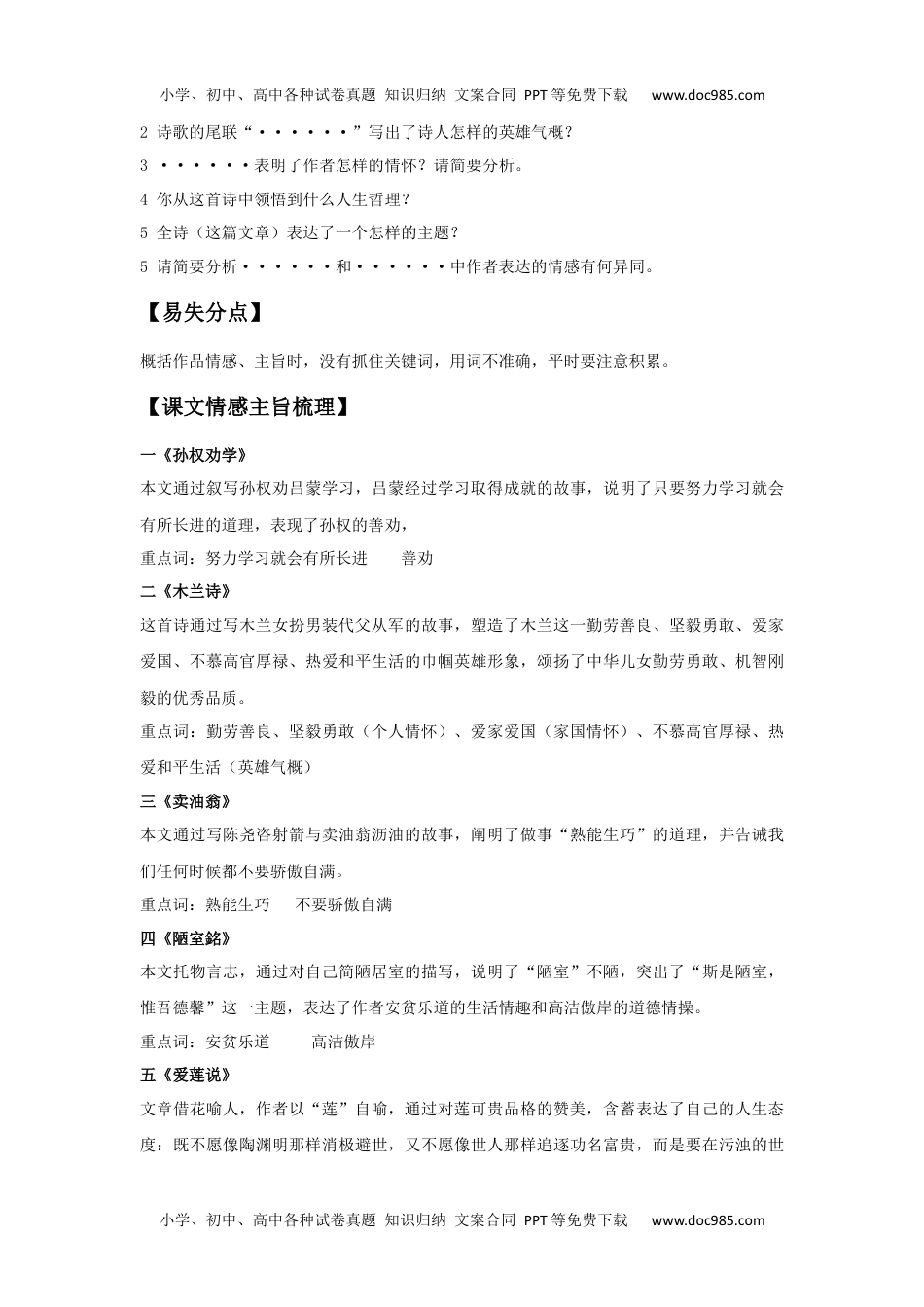 小学、初中、高中各种试卷真题知识归纳文案合同PPT等免费下载www.doc985.com古诗文阅读----情感主旨【考点】:情感、主旨【知识梳理】:古诗文中的情感(主旨)是必考内容。主旨是指作者写这篇文章的意义、用意或目的。主旨是文章和作品的灵魂,是文章和作品的统帅。作品的情感指作品基本观点的情感取向,即作品的总的感情态度,是赞美还是批判,是歌颂还是针贬等等。【答题要点】1结合背景,把握古诗文的主旨、情感。背景指诗词反映的广阔的社会现实或者作者的人生经历。2分析文眼(诗眼),透视古诗文的主旨、情感。文眼(诗眼)是解读主旨的关键所在,它往往就在作品抒情议论的句子中,这些抒情议论的句子与中心密切相关。3解读古诗文的意象,挖掘作品的主旨、情感。所谓意象,就是客观物象经过创作主体独特的情感活动而创造出来的一种艺术形象。诗人会把自己的思想感情寄托在自然山川、风花雪月等意象中,通过意象来表达自己的思想感情。如《爱莲说》中借用“莲”,表达了自己不慕名利、洁身自好的生活态度,以及对追名逐利、趋炎附势的世风的鄙弃。【答题格式】情感:通过······的内容,抒发了作者(诗人)······的情感。主旨:通过描绘······,抒发了作者(诗人)的······感情/歌颂了······的品质/批判了······的观点。【常见情感】壮志抒怀:勇攀高峰之豪迈,不怕艰险、积极进取之志向,俯视一切之胸怀;咏史怀古:怀才不遇之孤寂,抱负不得施展之无奈,过往历史之深思;山水田园:自由悠闲之恬淡,闲适生活之向往;读书学习:努力学习就会有所长进,百事皆熟能生巧,切忌骄傲自满;托物言志:美好情操之洁身自好,高洁傲岸。【常见题型】1这首诗抒发了诗人怎样的思想感情?小学、初中、高中各种试卷真题知识归纳文案合同PPT等免费下载www.doc985.com小学、初中、高中各种试卷真题知识归纳文案合同PPT等免费下载www.doc985.com2诗歌的尾联“······”写出了诗人怎样的英雄气概?3······表明了作者怎样的情怀?请简要分析。4你从这首诗中领悟到什么人生哲理?5全诗(这篇文章)表达了一个怎样的主题?5请简要分析······和······中作者表达的情感有何异同。【易失分点】概括作品情感、主旨时,没有抓住关键词,用词不准确,平时要注意积累。【课文情感主旨梳理】一《孙权劝学》本文通过叙写孙权劝吕蒙学习,吕蒙经过学习取得成就的故事,说明了只要努力学习就会有所长进的道理,表现了孙权的善劝,重点词:努力学习就会有所长进善劝二《木兰诗》这首诗通过写木兰女扮男装代父从军的故事,塑造了木兰这一勤劳善良、坚毅勇敢、爱家爱国、不慕高官厚禄、热爱和平生活的巾帼英雄形象,颂扬了中华儿女勤劳勇敢、机智刚毅的优秀品质。重点词:勤劳善良、坚毅勇敢(个人情怀)、爱家爱国(家国情怀)、不慕高官厚禄、热爱和平生活(英雄气概)三《卖油翁》本文通过写陈尧咨射箭与卖油翁沥油的故事,阐明了做事“熟能生巧”的道理,并告诫我们任何时候都不要骄傲自满。重点词:熟能生巧不要骄傲自满四《陋室銘》本文托物言志,通过对自己简陋居室的描写,说明了“陋室”不陋,突出了“斯是陋室,惟吾德馨”这一主题,表达了作者安贫乐道的生活情趣和高洁傲岸的道德情操。重点词:安贫乐道高洁傲岸五《爱莲说》文章借花喻人,作者以“莲”自喻,通过对莲可贵品格的赞美,含蓄表达了自己的人生态度:既不愿像陶渊明那样消极避世,又不愿像世人那样追逐功名富贵,而是要在污浊的世小学、初中、高中各种试卷真题知识归纳文案合同PPT等免费下载www.doc985.com小学、初中、高中各种试卷真题知识归纳文案合同PPT等免费下载www.doc985.com间独立不移,永远保持清白的操守和正直的品德,表达了自己不慕名利、洁身自好的生活态度,以及对追名逐利、趋炎附势的世风的鄙弃。重点词:不慕名利洁身自好六《登幽州台歌》本诗通过登楼远眺,吊古伤今所引起的无限感慨,在沧桑易变的古今人事和浩茫宽广的宇宙天地中,营造了空旷辽阔的意境,奠定了悲凉孤寂的情感基调,诗人融理于情,抒发了壮志难酬、怀才不遇的惆怅以及生命短暂、时不我待...