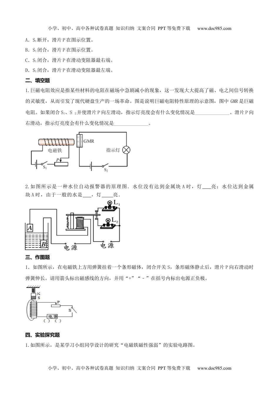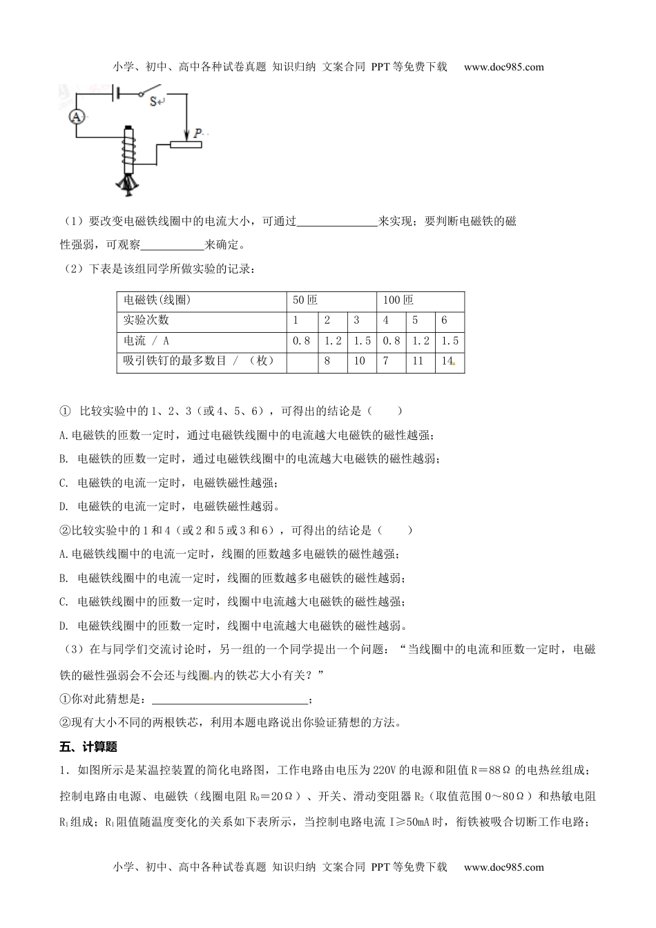 小学、初中、高中各种试卷真题知识归纳文案合同PPT等免费下载www.doc985.com20222023-理作(物新课标下九年级全册同步课节减负业人教版)二电第十章与磁专题20.3《电电电器磁铁和磁继作》课节减负业一、选择题1.如图所示是一种温度自动报警器的原理图。制作水银温度计时,在玻璃管的两端分别封入一段金属丝。电池的两极分别与金属丝相连,当温度达到与电池正极相连的金属丝下端所指的温度时,电铃就响起来,发出报警信号。下列说法正确的是()A.温度计中的水银是绝缘体B.电铃响时,电磁铁右端是N极C.温度降低到74℃以下,电铃响D.电铃响且滑片P向左移动时,电磁铁磁性减弱2.如图所示,电磁铁上方附近有一点A,小磁针置于电磁铁的右方附近。闭合开关S,下列判断正确的是()A.电磁铁的左端为N极B.电磁铁上方A点的磁场方向向右C.小磁针静止后,其N极的指向向右D.向左移动滑片P,电磁铁的磁性减弱3.如图所示,GMR是一个巨磁电阻,其特性是电阻在磁场中会急剧减小,且磁场越强电阻越小,闭合开关S2后,下列四种情况相比较,指示灯最亮的是()小学、初中、高中各种试卷真题知识归纳文案合同PPT等免费下载www.doc985.com小学、初中、高中各种试卷真题知识归纳文案合同PPT等免费下载www.doc985.comA.S1断开,滑片P在图示位置。B.S1闭合,滑片P在图示位置。C.S1闭合,滑片P在滑动变阻器最右端。D.S1闭合,滑片P在滑动变阻器最左端。二、填空题1.巨磁电阻效应是指某些材料的电阻在磁场中急剧减小的现象,这一发现大大提高了磁、电之间信号转换的灵敏度,从而引发了现代硬盘生产的一场革命。图是说明巨磁电阻特性原理的示意图,图中GMR是巨磁电阻。如果闭合S1、S2并使滑片P向左滑动,指示灯亮度会有什么变化情况是______________。滑片P向右滑动,指示灯亮度会有什么变化情况是______________。2.如图所示是一种水位自动报警器的原理图.水位没有达到金属块A时,灯亮;水位达到金属块A时,由于一般的水是,灯亮.三、作图题1.如图所示,在电磁铁上方用弹簧挂着一个条形磁体,闭合开关S,条形磁体静止后,滑片P向右滑动时弹簧伸长。请用箭头标出磁感线的方向,并用“+”“﹣”在括号内标出电源正负极。四、实验探究题1.如图所示,是某学习小组同学设计的研究“电磁铁磁性强弱”的实验电路图。小学、初中、高中各种试卷真题知识归纳文案合同PPT等免费下载www.doc985.com小学、初中、高中各种试卷真题知识归纳文案合同PPT等免费下载www.doc985.com(1)要改变电磁铁线圈中的电流大小,可通过来实现;要判断电磁铁的磁性强弱,可观察来确定。(2)下表是该组同学所做实验的记录:①比较实验中的1、2、3(或4、5、6),可得出的结论是()A.电磁铁的匝数一定时,通过电磁铁线圈中的电流越大电磁铁的磁性越强;B.电磁铁的匝数一定时,通过电磁铁线圈中的电流越大电磁铁的磁性越弱;C.电磁铁的电流一定时,电磁铁磁性越强;D.电磁铁的电流一定时,电磁铁磁性越弱。②比较实验中的1和4(或2和5或3和6),可得出的结论是()A.电磁铁线圈中的电流一定时,线圈的匝数越多电磁铁的磁性越强;B.电磁铁线圈中的电流一定时,线圈的匝数越多电磁铁的磁性越弱;C.电磁铁线圈中的匝数一定时,线圈中电流越大电磁铁的磁性越强;D.电磁铁线圈中的匝数一定时,线圈中电流越大电磁铁的磁性越弱。(3)在与同学们交流讨论时,另一组的一个同学提出一个问题:“当线圈中的电流和匝数一定时,电磁铁的磁性强弱会不会还与线圈内的铁芯大小有关?”①你对此猜想是:;②现有大小不同的两根铁芯,利用本题电路说出你验证猜想的方法。五、计算题1.如图所示是某温控装置的简化电路图,工作电路由电压为220V的电源和阻值R=88Ω的电热丝组成;控制电路由电源、电磁铁(线圈电阻R0=20Ω)、开关、滑动变阻器R2(取值范围0~80Ω)和热敏电阻R1组成;R1阻值随温度变化的关系如下表所示,当控制电路电流I≥50mA时,衔铁被吸合切断工作电路;小学、初中、高中各种试卷真题知识归纳文案合同PPT等免费下载www.doc985.com电磁铁(线圈)50匝100匝实验次数123456电流/A0.81.21.50.81.21.5吸引铁钉的最多数目/(枚)8...