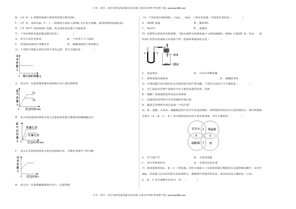 小学、初中、高中各种试卷真题知识归纳文案合同PPT等免费下载www.doc985.com绝密★启用前|学科网试题命制中心九年级化学下册阶段测试卷(A卷)(考试时间:90分钟试卷满分:100分)1234567891011121314151617181920第Ⅰ卷(选择题共40分)可能用到的相对原子质量:H-1C-12O-16S-32一、选择题:本题共20个小题,每小题2分,共40分。在每小题给出的四个选项中,只有一项是符合题目要求的。1.生活中的下列物质放入水中,能形成溶液的是()A.豆油B.面粉C.蔗糖D.泥沙2.垃圾是放错了的资源,下列垃圾中属于金属材料的是()A.废弃的塑料袋B.丢弃的布娃娃C.易拉罐D.玻璃瓶3.小强随父亲到自家农田中,发现大豆叶片边缘发黄,茎秆细弱,小强应建议父亲施用的化肥是()A.NH4NO3B.Ca(H2PO4)2C.K2SO4D.CO(NH2)24.中考临近,小洁妈妈为了给小洁补充合适的蛋白质。她在给小洁做饭选材时应含的是()A.大白菜B.鲈鱼C.米饭D.胡萝卜5.下列有关溶液的说法正确的是()A.溶液都是无色透明的B.在外在条件不变的情况下蔗糖溶液较长时间放置后会分层C.碘酒中碘是溶质,酒精是溶剂D.未饱和的食盐溶液中上层的咸味比下层淡6.下列关于“生活中的化学”的叙述中,不正确的是()A.用过废电池可以随便丢弃B.青少年缺钙患佝偻病C.食用加碘食盐可预防甲状腺肿大D.胃酸过多可服用适量的小苏打7.下列化学方程式书写正确的是()A.B.C.D.8.检验碳酸盐的正确方法是()A.滴加盐酸,产生使木条火焰熄灭的气体B.加热,产生使澄清石灰水变浑浊的气体C.滴加BaCl2溶液产生白色沉淀D.滴加稀盐酸,产生使澄清石灰水变浑浊的气体9.如图是我们常见的水果及其近似pH,其中酸性最强的是()A.西瓜pH=6.6B.葡萄pH=5.1C.猕猴桃pH=3.3D.桔子pH=3.610.a、b、c三种固体物质的溶解度曲线如图所示。下列说法正确的是()A.t1℃时,a物质的溶解度是30g小学、初中、高中各种试卷真题知识归纳文案合同PPT等免费下载www.doc985.com小学、初中、高中各种试卷真题知识归纳文案合同PPT等免费下载www.doc985.comB.t1℃时,b的饱和溶液中溶质的质量分数为50%C.t3℃时,各取15ga、b、c三种物质分别加入到50g水中充分溶解,能得到饱和溶液的是cD.t2℃和t3℃时的两份b溶液,所含溶质的质量不可能相等11.下列对物质用途的描述错误的是()A.用生石灰作发热剂B.干冰用于人工降雨C.用氢氧化钠治疗胃酸过多D.碳酸氢钠用于焙制糕点12.下列四个图象分别对应四个变化过程,其中正确的是()A.表示向一定量的饱和氯化钠溶液中加入氯化钠固体B.表示等质量的锌和铁分别与足量溶质质量分数相同的稀硫酸反应C.表示完全相同的两份过氧化氢溶液在有、无催化剂条件下的分解D.表示向一定量硫酸铜溶液中加入一定量铁粉13.下列试剂中能将HCl、CaCl2、NaCl三种无色溶液一次鉴别出来的是()A.NaOH溶液B.稀H2SO4C.Na2CO3D.蒸馏水14.如图所示的密闭实验装置,当胶头滴管内的液体滴下与固体接触时,液面a比液面b高,但过一段时间U形管内的液面又回到持平的一组固体和液体组合是()A.食盐和水B.石灰石和稀盐酸C.固体氢氧化钠和水D.硝酸铵和水15.环境问题已成为制约社会发展和进步的严重问题。下列有关说法中不正确的是()A.为了提高农作物产量我们可以大量任意使用农药、化肥B.硫酸厂的废液需处理达标后再排放C.金属回收再利用可以有效减轻环境污染D.随意丢弃塑料垃圾会造成“白色污染”16.铁、盐酸、石灰水、硫酸铜是初中化学中常见的物质,四种物质间的反应关系如图所示,图中两圆相交部分(A、B、C、D)表示物质间反应的主要实验现象,其中正确的是()A.有气泡产生B.无明显现象C.有红色固体析出D.有蓝色沉淀生成17.将质量相等的A、B、C三种金属,同时分别放入三份溶质质量分数相同且足量的稀盐酸中,反应生成H2的质量与反应时间的关系如图所示.根据图中所提供的信息,得出的结论正确的是(已知:A、B、C在生成物中均为+2价)()小学、初中、高中各种试卷真题知识归纳文案合同PPT等免费下载www.doc985.com小学、初中、高中各种试卷真题知识归纳文案合同PPT等免费下载ww...