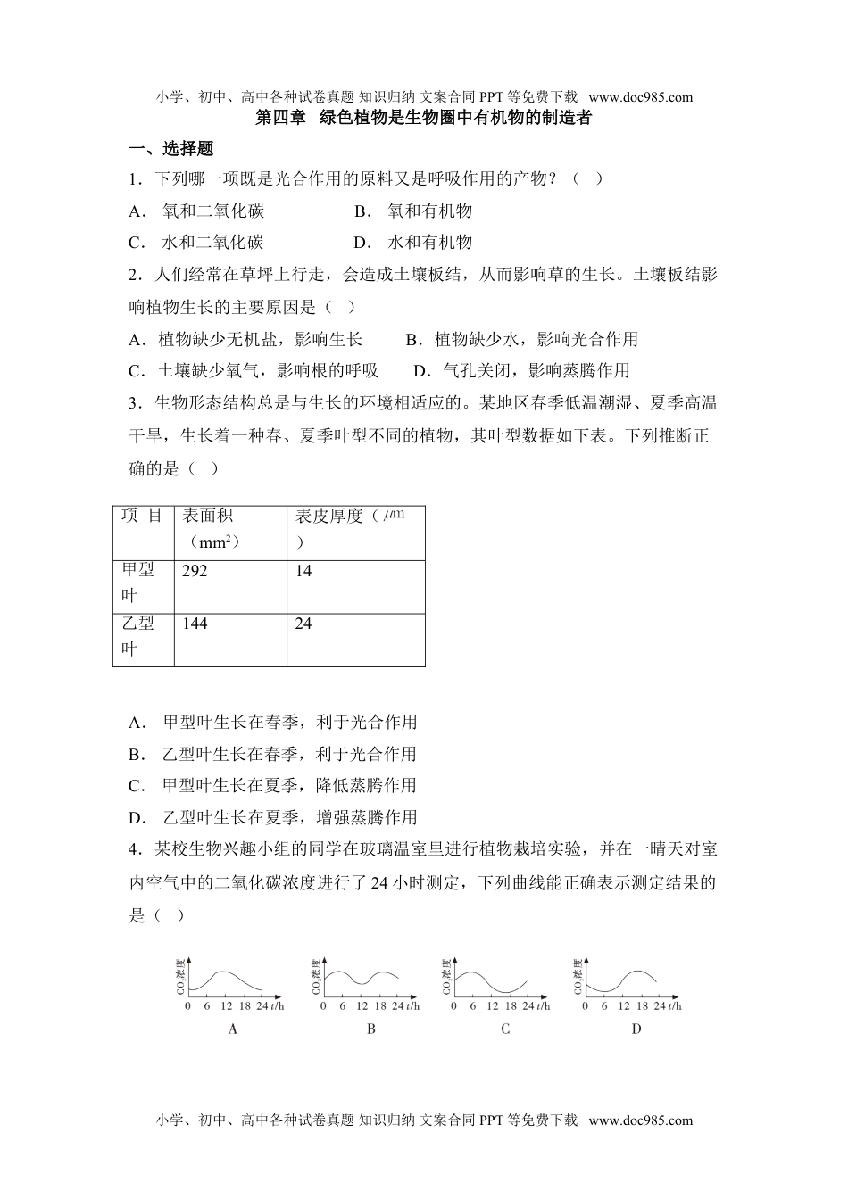 小学、初中、高中各种试卷真题知识归纳文案合同PPT等免费下载www.doc985.com第四章绿色植物是生物圈中有机物的制造者一、选择题1.下列哪一项既是光合作用的原料又是呼吸作用的产物?()A.氧和二氧化碳B.氧和有机物C.水和二氧化碳D.水和有机物2.人们经常在草坪上行走,会造成土壤板结,从而影响草的生长。土壤板结影响植物生长的主要原因是()A.植物缺少无机盐,影响生长B.植物缺少水,影响光合作用C.土壤缺少氧气,影响根的呼吸D.气孔关闭,影响蒸腾作用3.生物形态结构总是与生长的环境相适应的。某地区春季低温潮湿、夏季高温干旱,生长着一种春、夏季叶型不同的植物,其叶型数据如下表。下列推断正确的是()A.甲型叶生长在春季,利于光合作用B.乙型叶生长在春季,利于光合作用C.甲型叶生长在夏季,降低蒸腾作用D.乙型叶生长在夏季,增强蒸腾作用4.某校生物兴趣小组的同学在玻璃温室里进行植物栽培实验,并在一晴天对室内空气中的二氧化碳浓度进行了24小时测定,下列曲线能正确表示测定结果的是()小学、初中、高中各种试卷真题知识归纳文案合同PPT等免费下载www.doc985.com项目表面积(mm2)表皮厚度()甲型叶29214乙型叶14424小学、初中、高中各种试卷真题知识归纳文案合同PPT等免费下载www.doc985.com二、非选择题5.下图是探究呼吸作用产物的实验装置图,请据图回答:(1)A瓶内NaOH溶液的作用是。(2)D瓶内石灰水的作用是。(3)若将萌发的种子换成大豆幼苗,应对C装置进行处理,目的是。6.某研究人员曾经对绿色植物的光合作用与呼吸作用作过以下研究。实验一:将某绿色植物放在黑暗装置中,分别测定在不同温度下植物对氧气的吸收量,如图1所示.a、b分别表示10℃和20℃时植物吸收氧气量随时间变化的情况。实验二:按图2所示装置进行黄豆种子呼吸作用和番茄植株光合作用实验。请分析回答:(1)分析实验一可知,温度越高植物吸收氧气越。’(2)由实验一结果可推知:在实验二中,当广口瓶内黄豆种子温度适当时.就会促进玻璃罩内番茄植株的光合作用。(3)联系本实验,试分析吐鲁番瓜果特别甜的原因。7.在探究植物光合作用,呼吸作用和蒸腾作用活动中,某同学设计以下探究方案,请你用所学知识进行分析。小学、初中、高中各种试卷真题知识归纳文案合同PPT等免费下载www.doc985.com小学、初中、高中各种试卷真题知识归纳文案合同PPT等免费下载www.doc985.com(1)如甲图,将植物罩上透明塑料袋,放在光下3-4小时,将塑料袋中气体通过①号试管收集后取出试管,将一支带火星的木条伸进①号试管内,结果木条复燃了,由此得出的结论是:①号试管内含较多的(气体)。(2)如甲图,若将透明塑料袋换成黑色的,其目的是为了防止植物进行作用。上述(1)(2)实验中,分别用透明和黑色两种塑料袋是为了设置,该实验的变量是。(3)在实验过程中,塑料袋内壁出现水珠,是叶片进行作用散失的水分凝聚而成,这些水分是通过茎的中的导管自下往上运输来的。(4)如乙图,将植物罩上塑料袋,放在暗处3-4小时。将塑料袋中气体通入2号试管,结果发现澄清石灰水变浑浊。由此得出结论是:植物进行了作用,释放出(气体)。8.选取生长正常的牵牛花进行如图6所示的光合作用实验:①将此装置经黑暗处理一昼夜后,移至光下数小时,再将这三片叶取下,分别放入盛有酒精的小烧杯中,隔水加热,使叶绿素溶解到酒精中。②用清水漂洗后放入培养皿中,分别向这三片叶上滴加碘液.观察三片叶是否变蓝。请分析回答下列问题:(l)将此装置放入黑暗处一昼夜的目的是(2)在光下放置数小时后,发现两玻璃瓶的内壁上有小水珠,产生这一现象的原因是。小学、初中、高中各种试卷真题知识归纳文案合同PPT等免费下载www.doc985.com小学、初中、高中各种试卷真题知识归纳文案合同PPT等免费下载www.doc985.com(3)通过本实验可以得出一些有关绿色植物进行光合作用的重要结论。如,比较叶片甲不同部位的颜色变化,可以说明_:比较叶片乙和丙,可以说(4)根据以上实验所得结论,对温室里的农作物采取等(请答出两条)措施可以提高产量。(5)绿色植物被称为“空气净化器”,对于维持生物圈中的起重要作用...